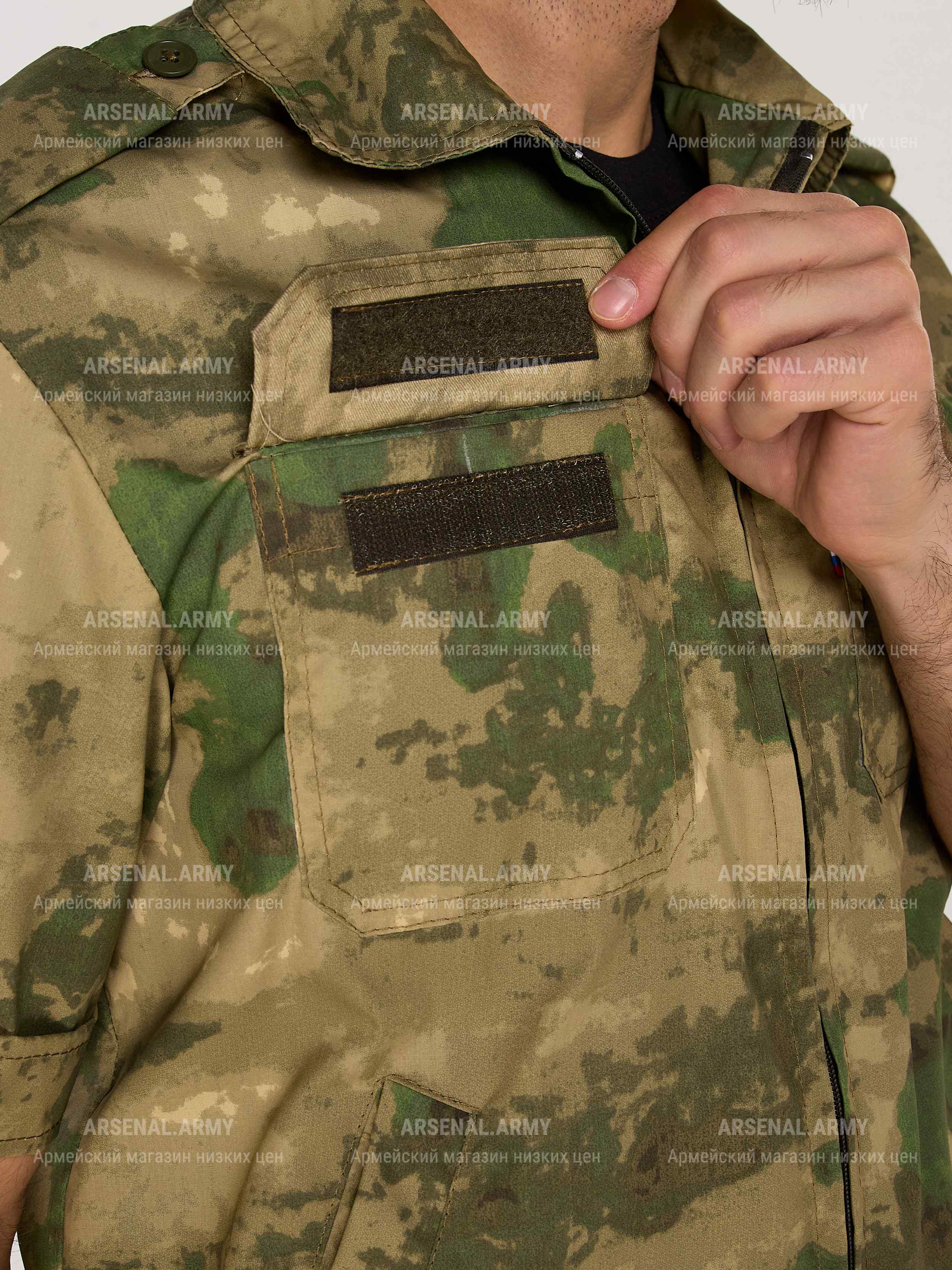 Рубашка простого покроя с отложным воротником и короткими рукавами застегивается на молнию. Есть два нагрудных кармана на липучках и два боковых на молниях. Рубашка хорошо прилегает к телу благодаря вшитым по бокам нижней части эластичным вставкам. На плечах есть кольца для крепления погон.