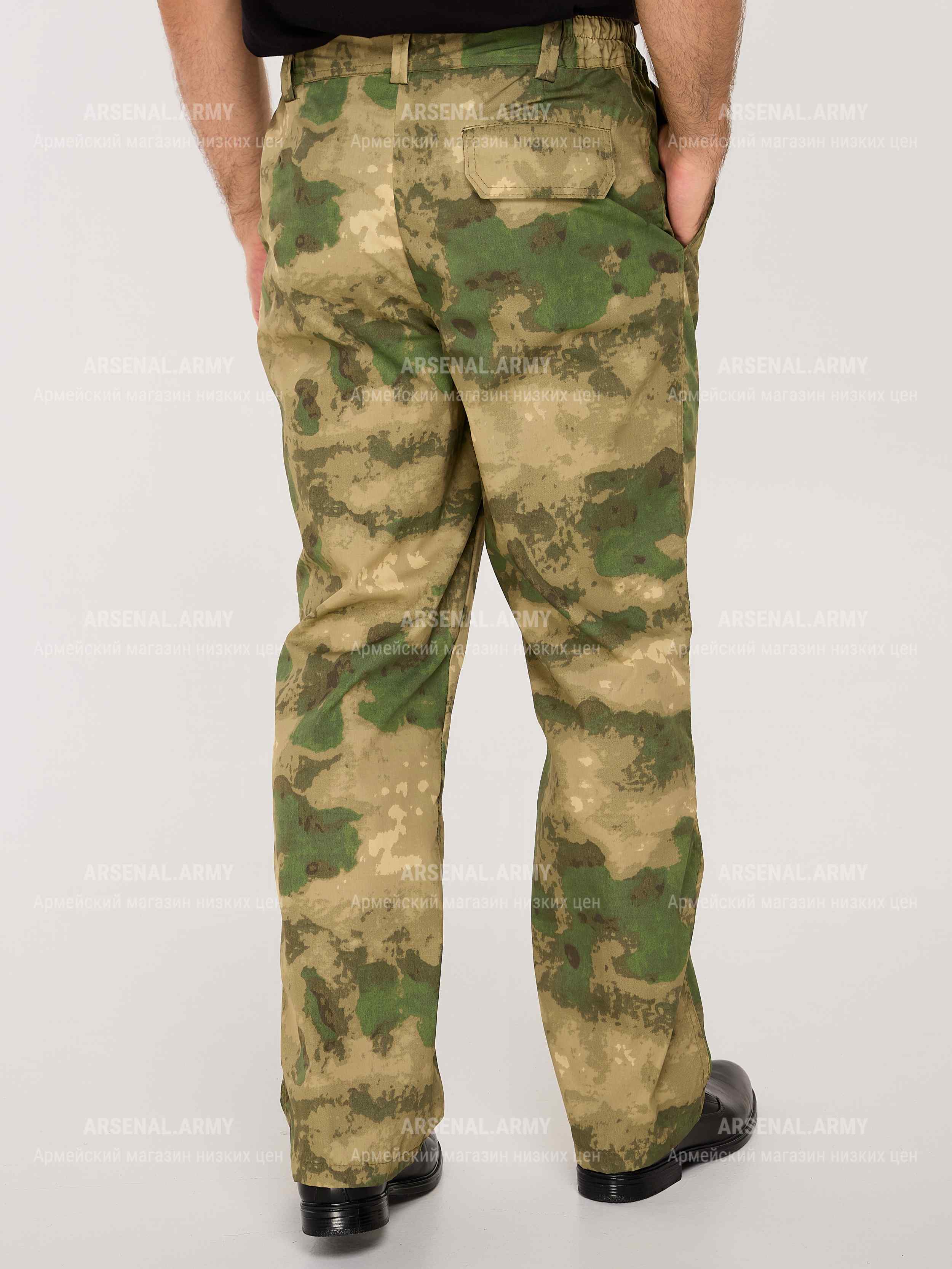 Брюки обычного строгого покроя со стрелками спереди. Имеют боковые прорезные карманы и задний на липучке. Застегиваются на пуговицу и молнию. Присутствуют шлёвки под ремень.