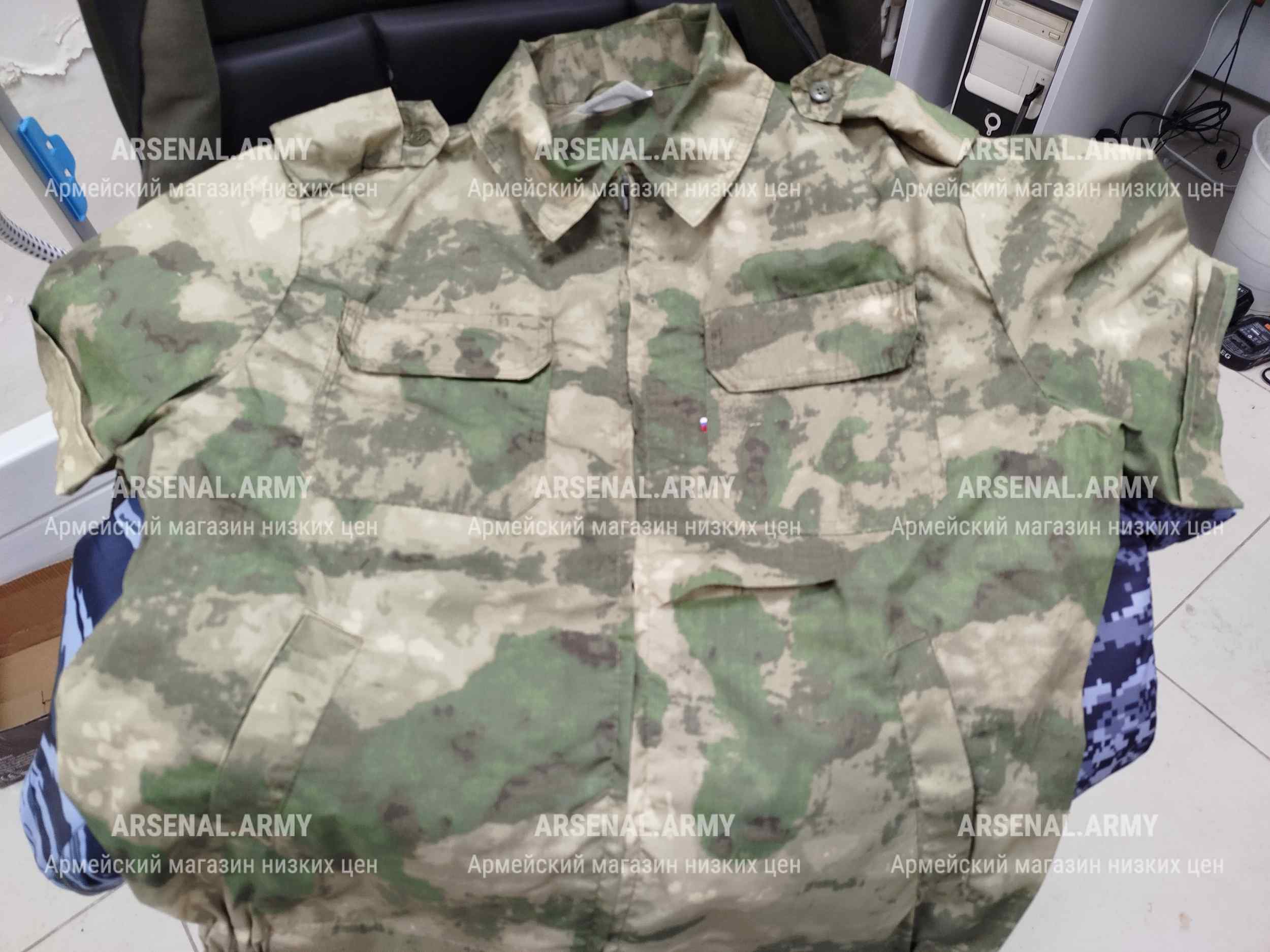 Рубашка простого покроя с отложным воротником и короткими рукавами застегивается на молнию. Есть два нагрудных кармана на липучках и два боковых на молниях. Рубашка хорошо прилегает к телу благодаря вшитым по бокам нижней части эластичным вставкам. На плечах есть кольца для крепления погон.