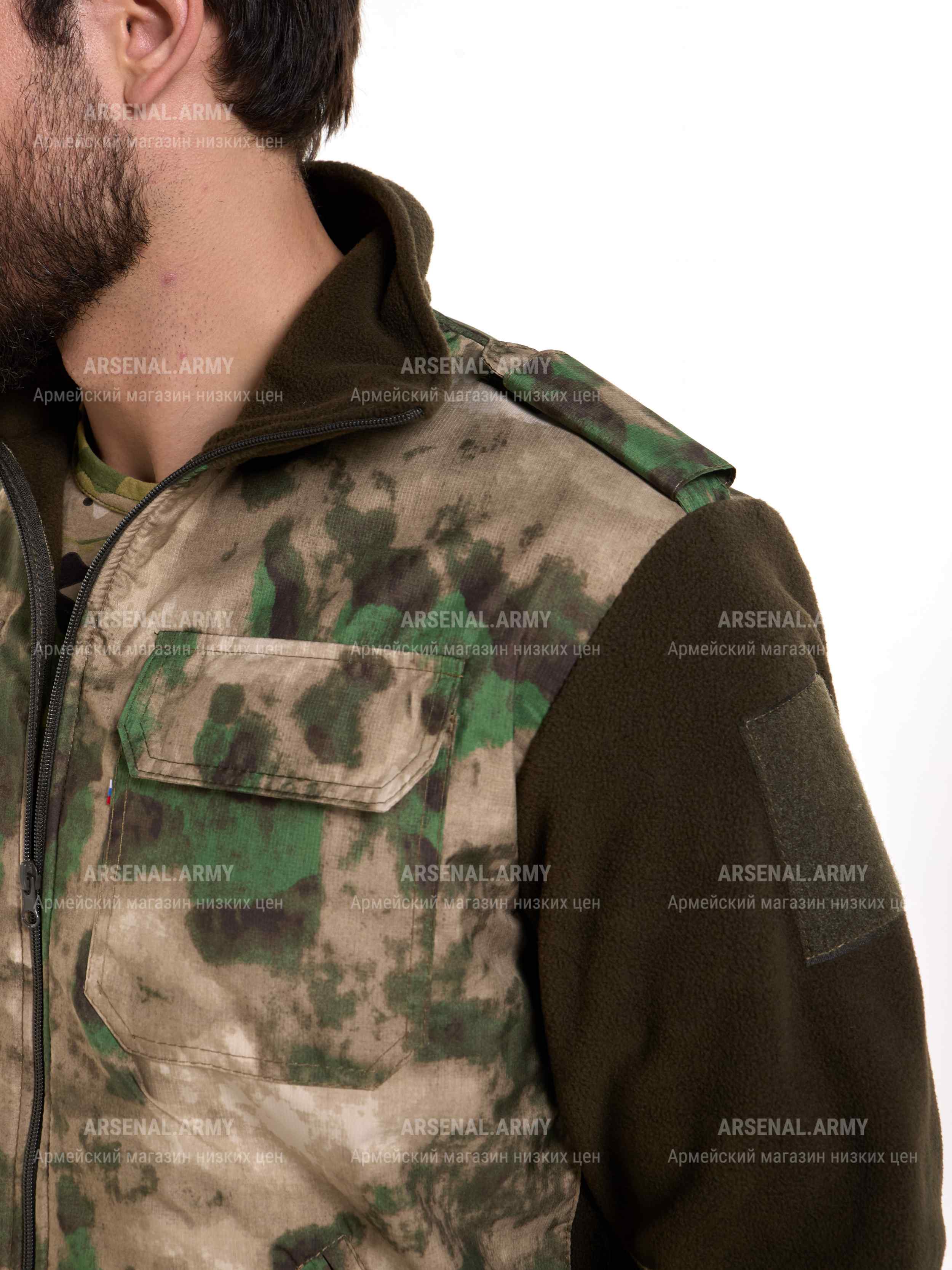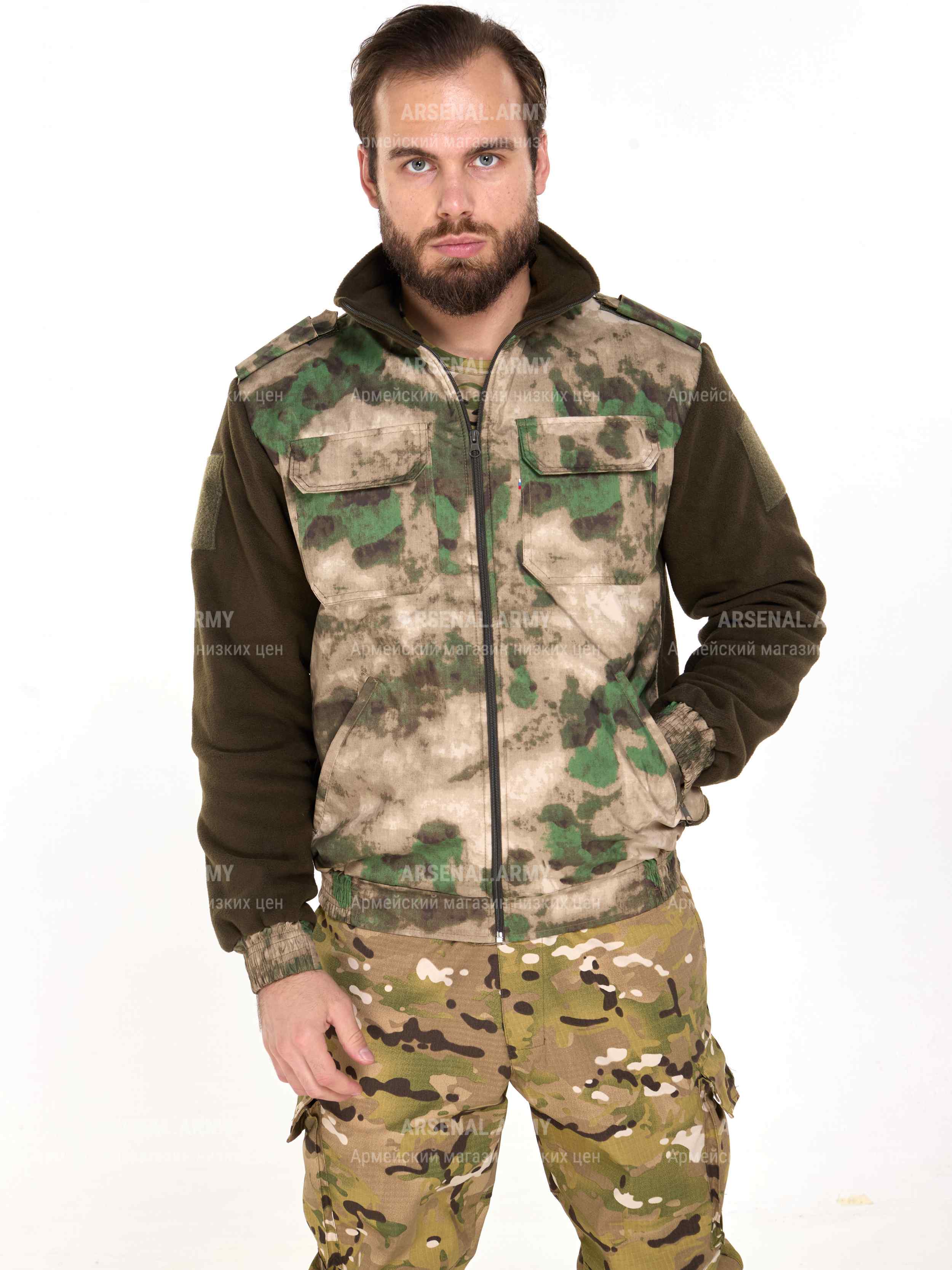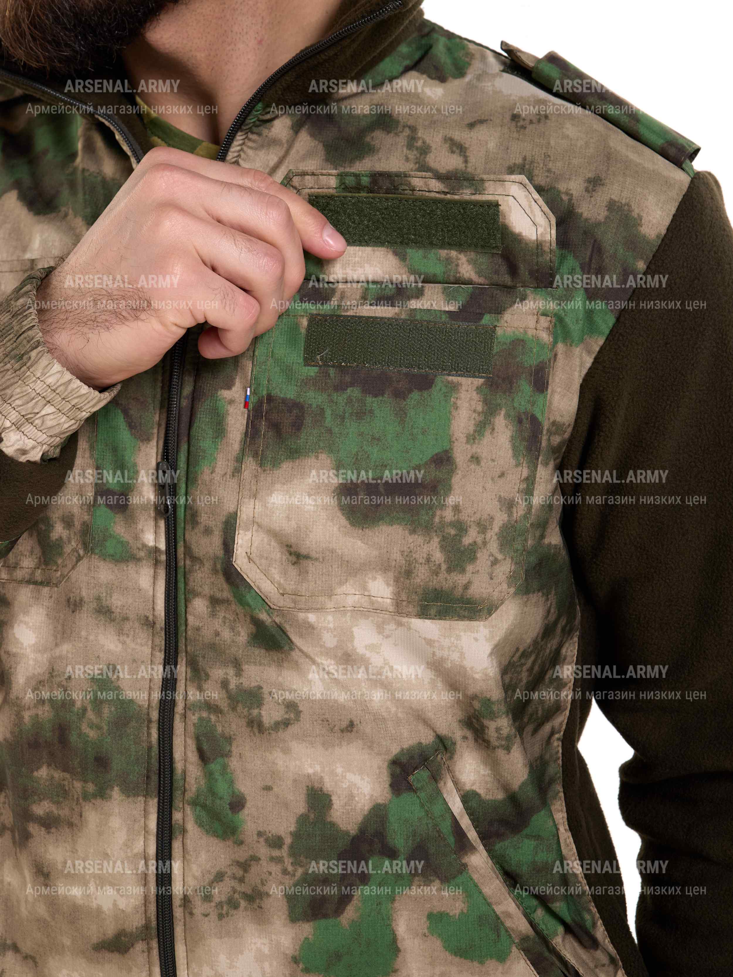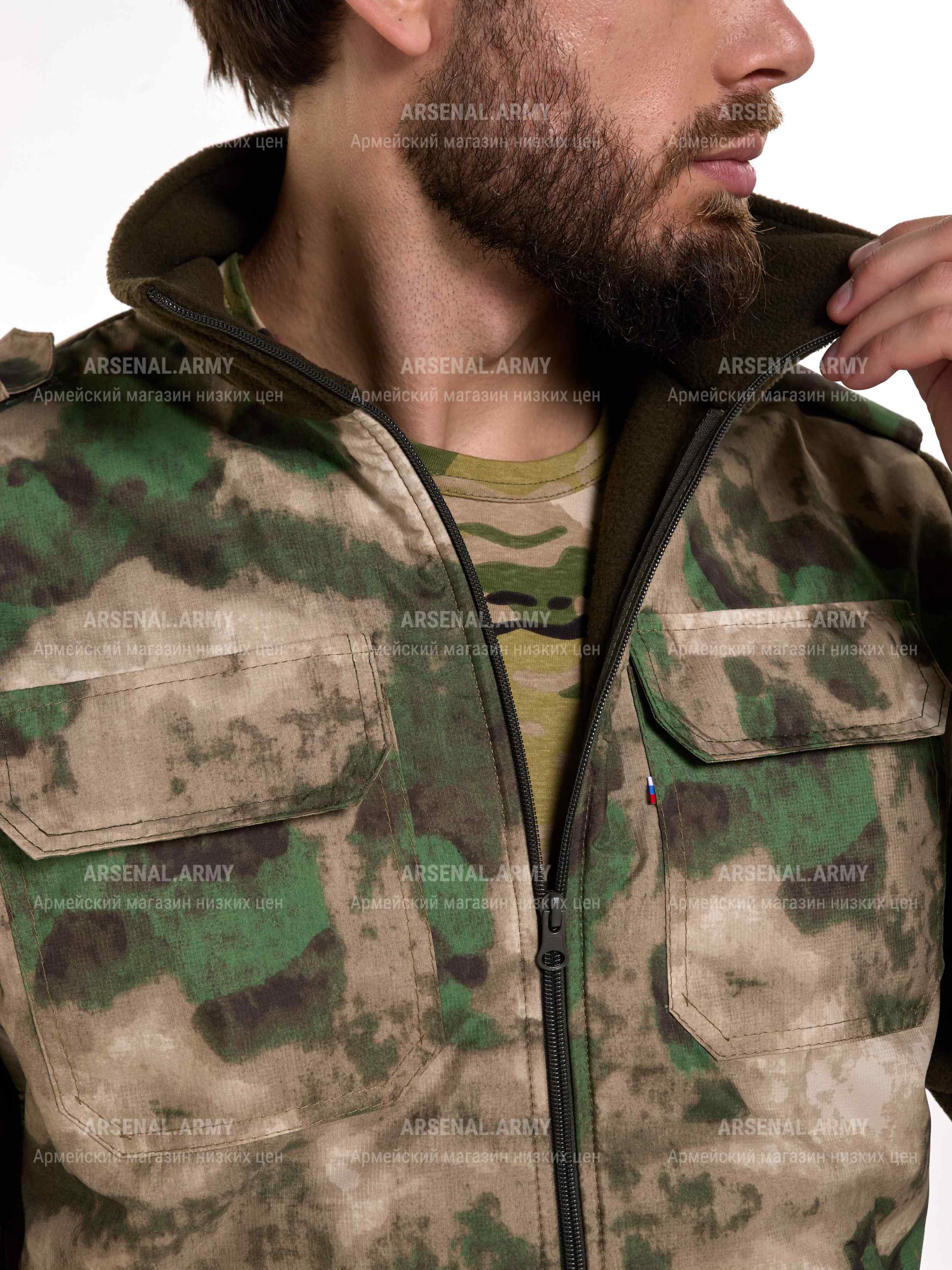 Застёгивается куртка на молнию до самого верха воротника стойки. Куртка имеет боковые и нагрудные карманы. Карманы на груди застегиваются на липу.