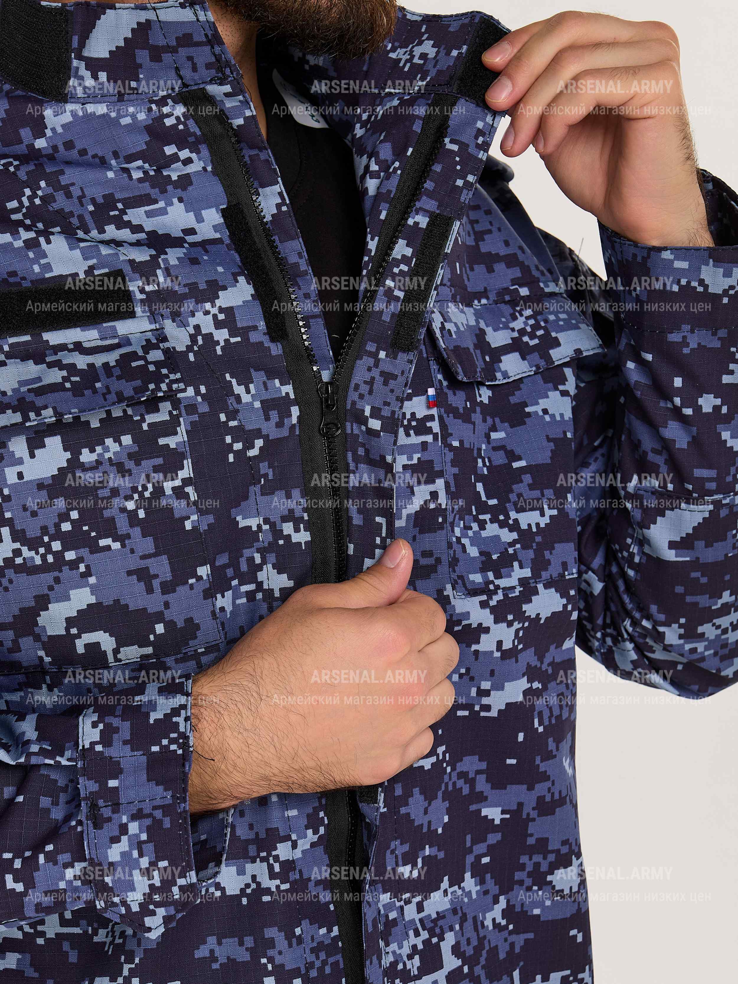 Куртка костюма оснащена удобной застежкой-молнией и клапаном на липучке, что обеспечивает быстрое и легкое надевание. Ворот-стойка и хлястики под фальш-погоны на пуговицах добавляют стиля и практичности. На рукавах расположены карманы на молнии с липучкой под шевроны, а также манжет, регулируемый липучкой, что обеспечивает дополнительное удобство.