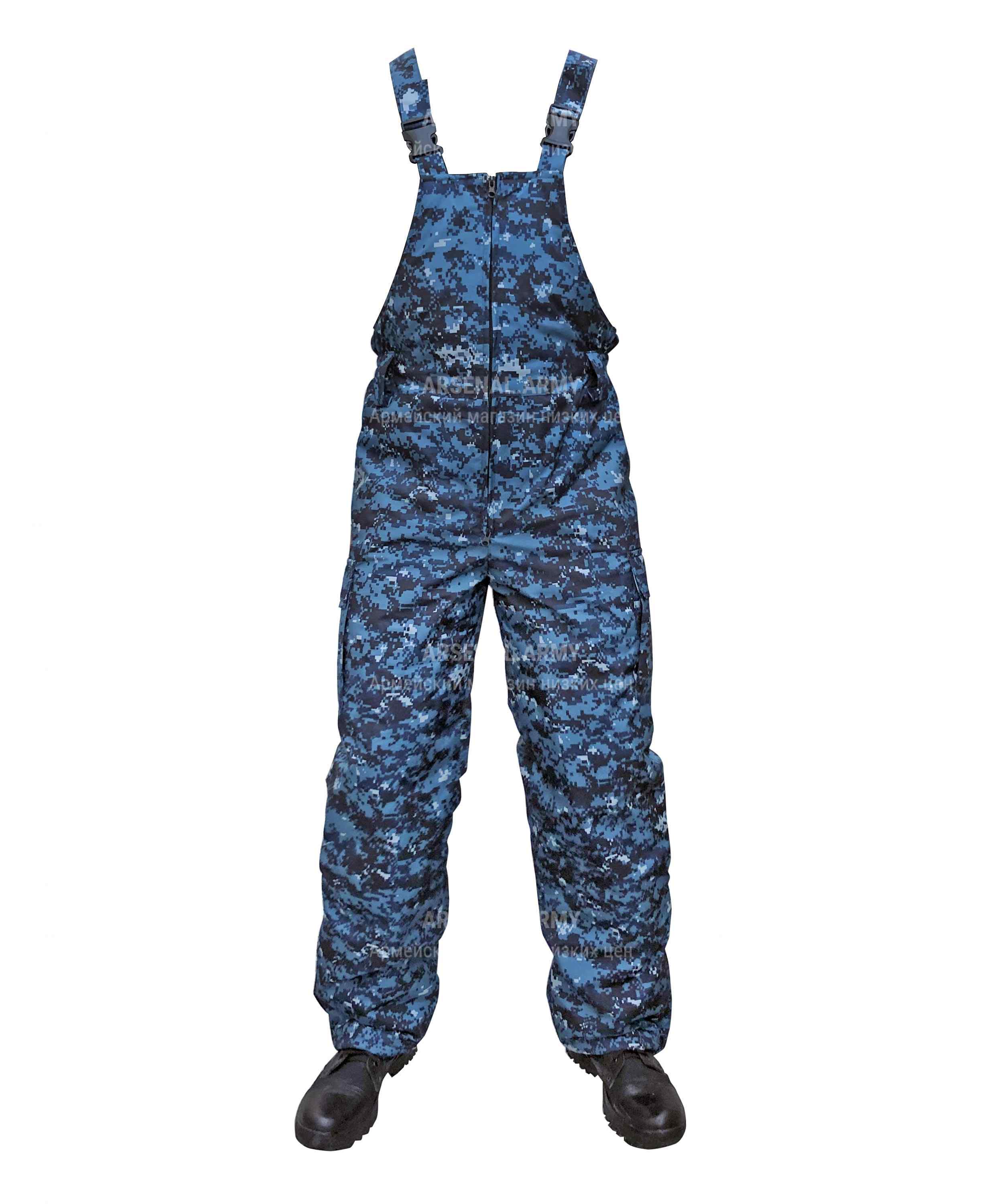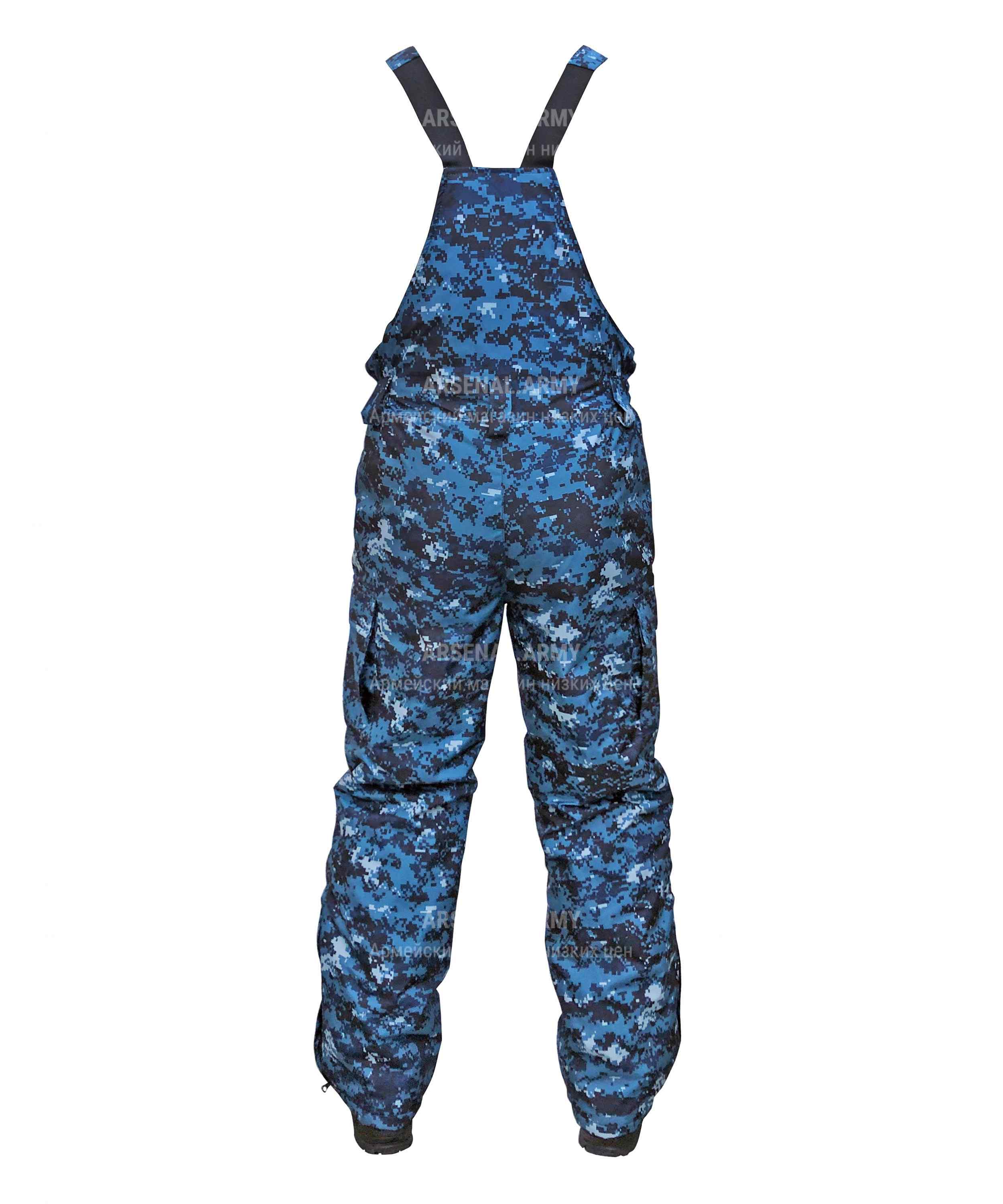 Штаны этого костюма застегиваются на молнию и имеют шлевки для ремня. Лямки на резинке застегиваются на фастекс, обеспечивая комфортную посадку. Два боковых кармана закрываются на липучку, чтобы хранить необходимые предметы под рукой. Штанины прямые по низу без утяжек, но с молнией на расклешение, что обеспечивает удобство при движении.