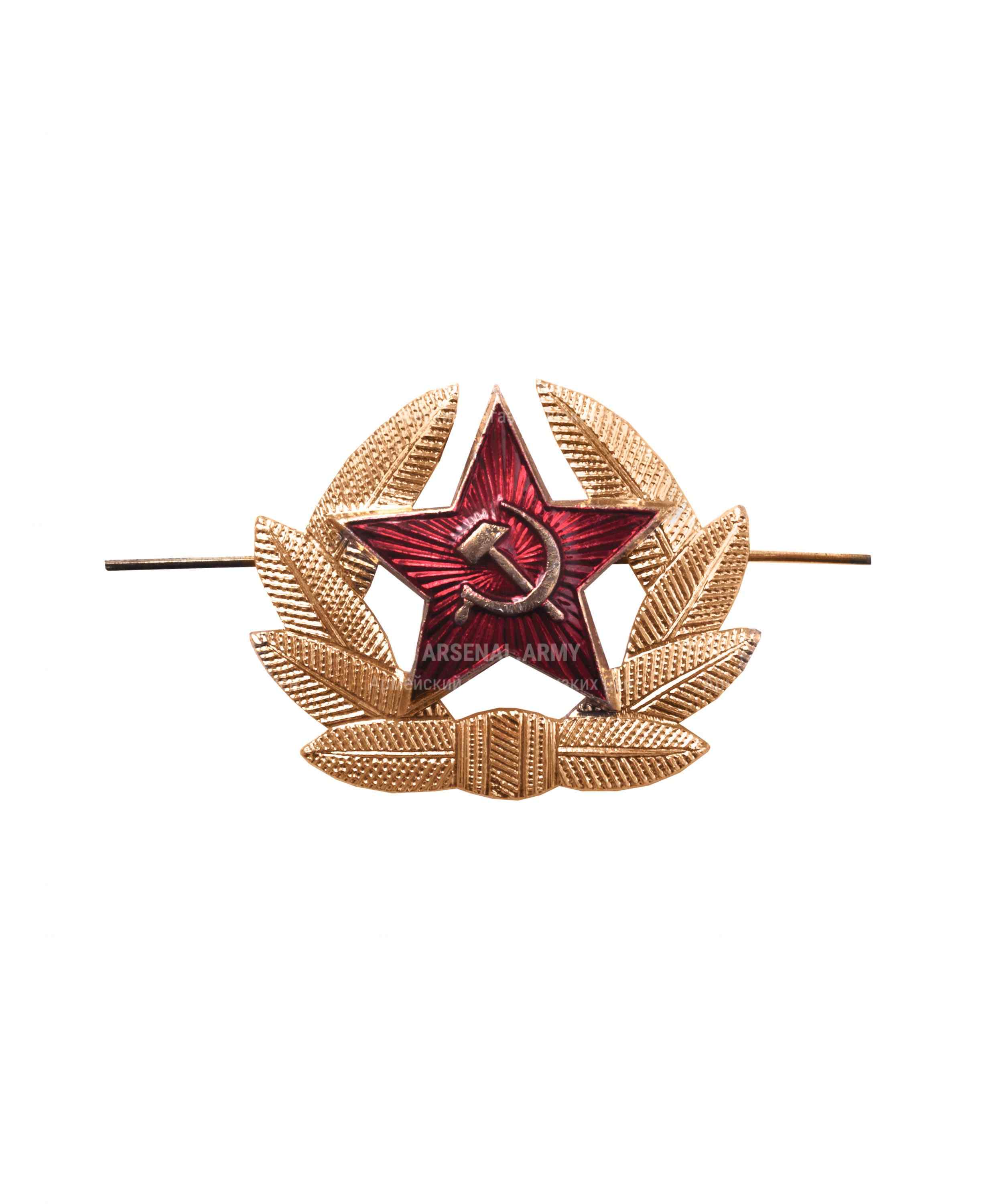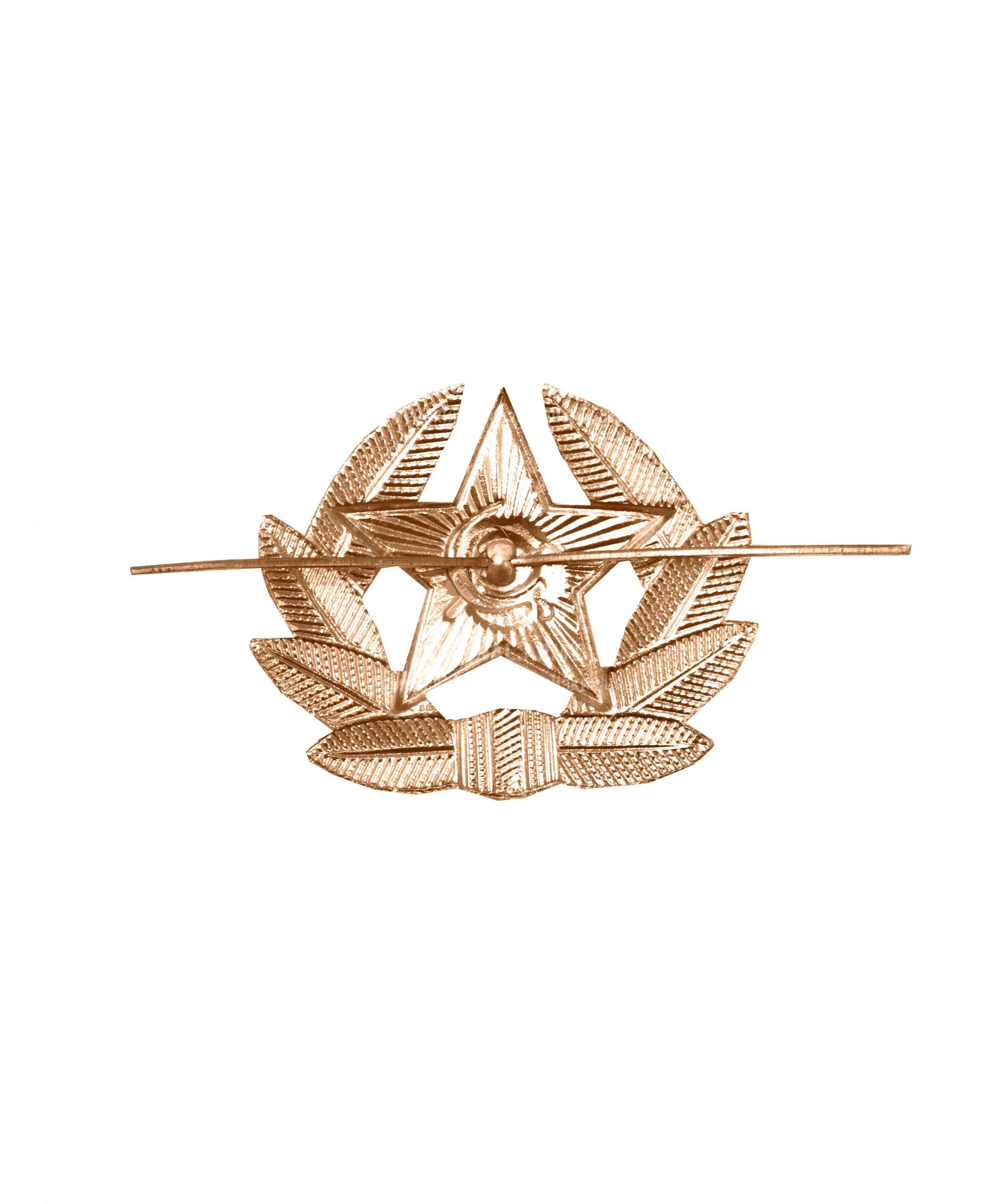 Кокарда Советской Армии рядового состава изготовлена из металла с золотистым покрытием. Размеры изделия 4 x 6 см, что обеспечивает заметное, но элегантное присутствие на форме. Дизайн выполнен в стиле советской эмблематики, отражая историю и традиции воинской части. Подходит для коллекционеров, смены экспозиции и тематических мероприятий.