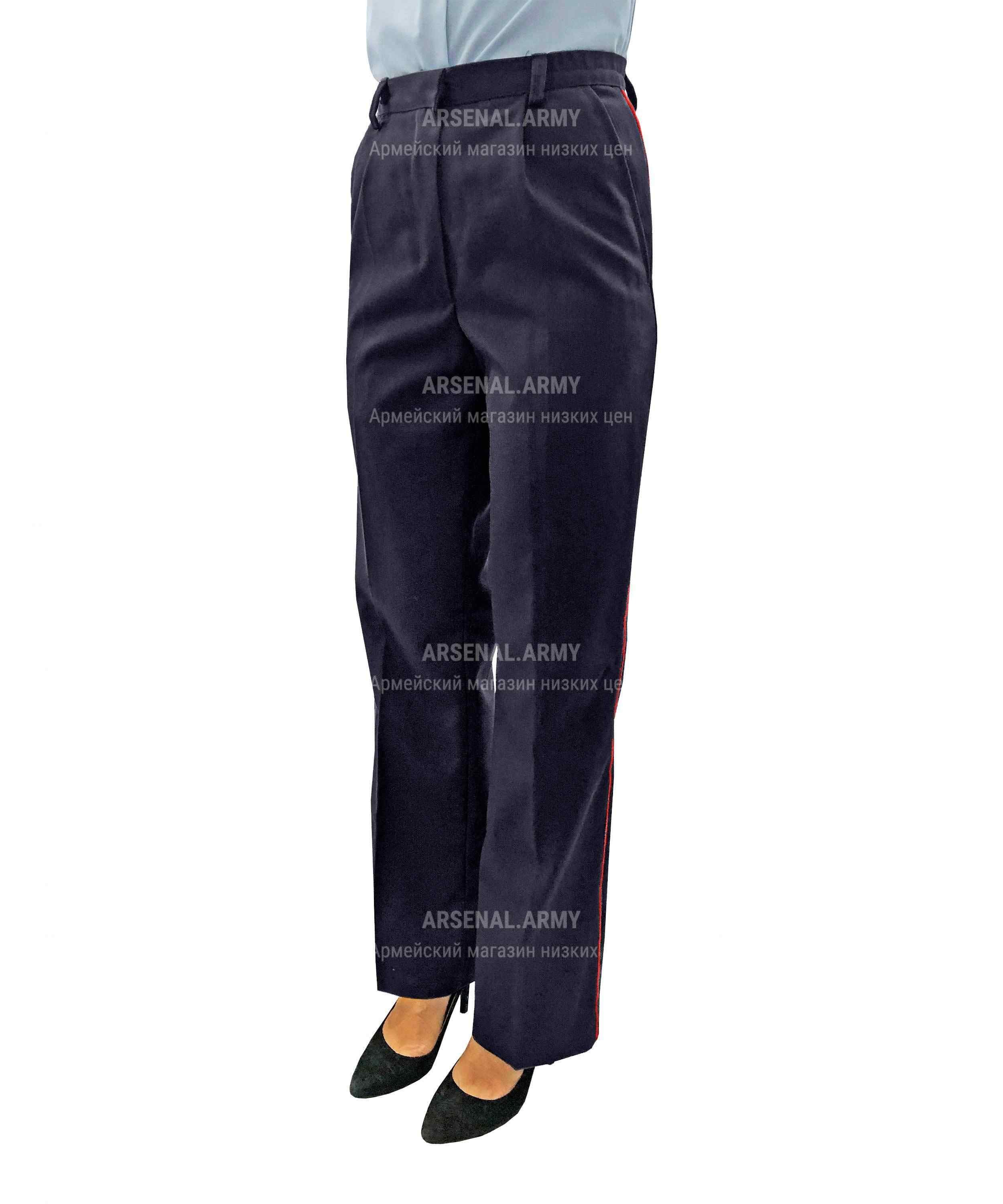 Покрой – умеренно приталенный, обеспечивающий красивую посадку брюк, но не сковывающий движения. Цвет – тёмно-синий, по боковому шву выполнен красный кант. В верхней части по бокам вшиты два прорезных кармана без застёжек. Талия высокая. В верхней части вшиты эластичные вставки, благодаря которым брюки отлично выглядят на женщинах с любым типом фигуры. На поясе сделаны шлёвки под ремень. Застёгиваются брюки на молнию и пуговицу.