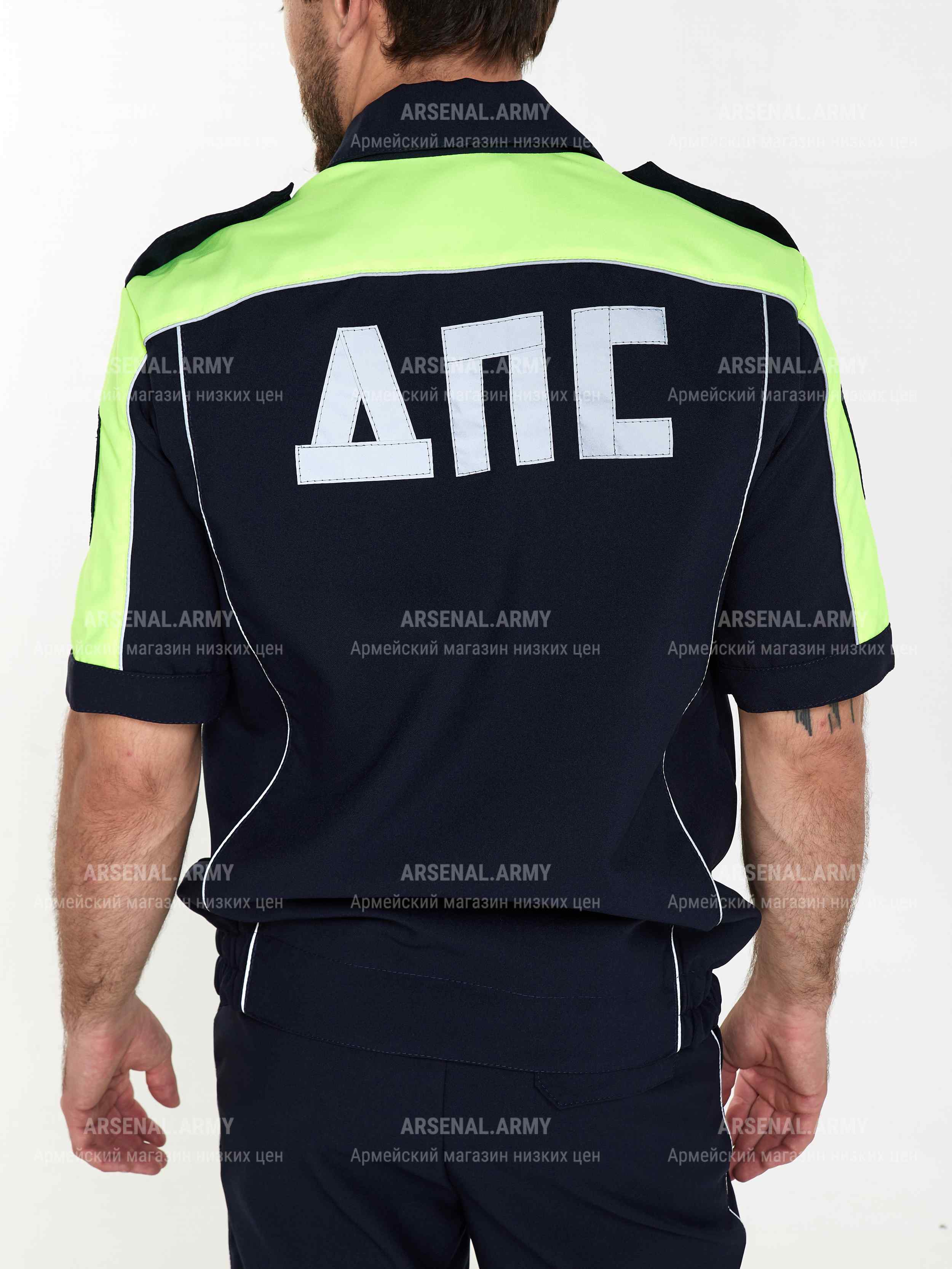 На спине большая надпись ДПС из светоотражающей ленты. Понизу куртки по бокам вдета резинка без утяжки.