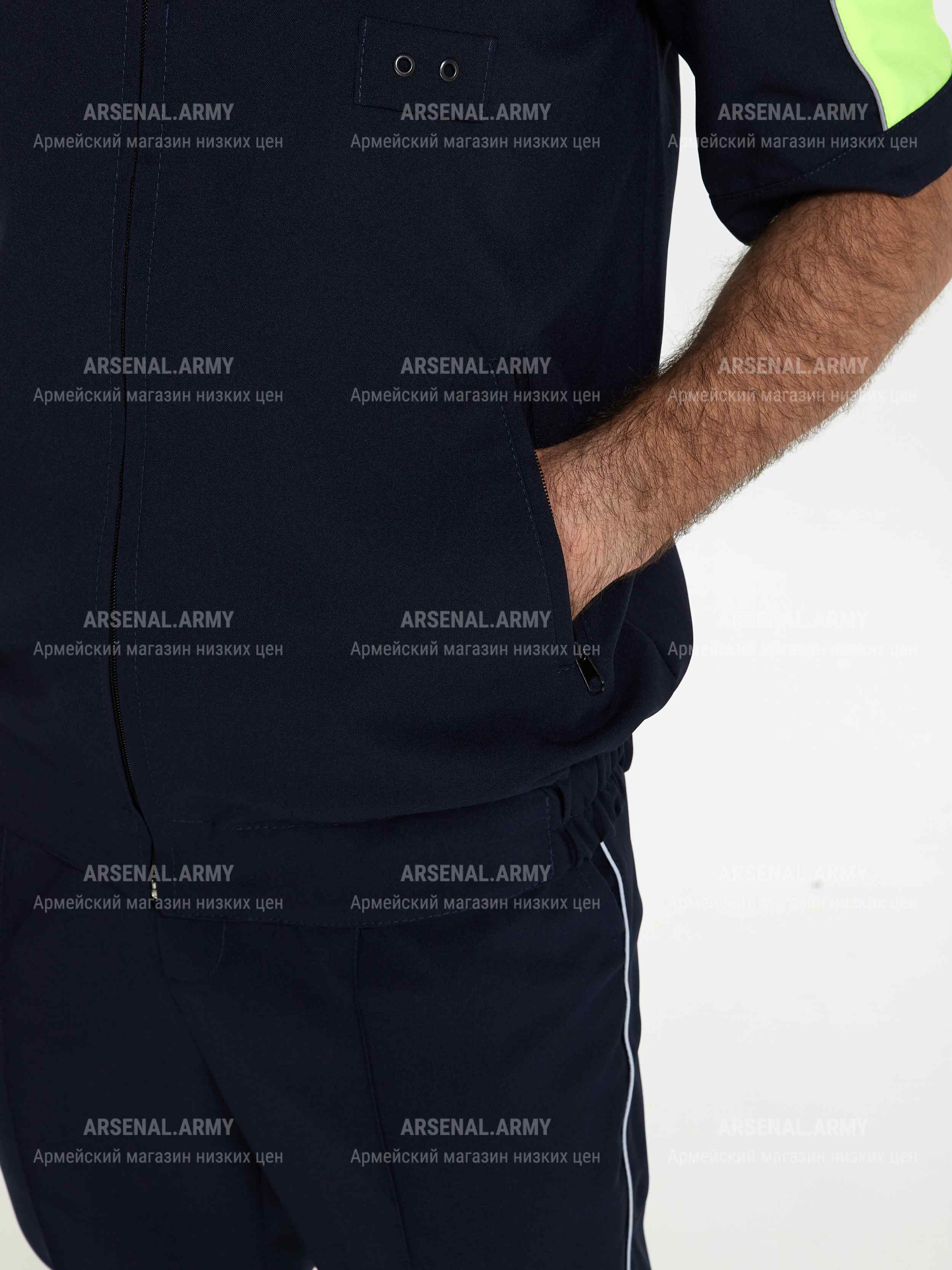 Данная модель куртки выполнена с коротким рукавом и подкладом, чтобы было не так жарко. Застегивается на молнию. На плечах - шлевки для погон (на пуговицах) и от одного плеча до другого - полоска лимонного цвета.