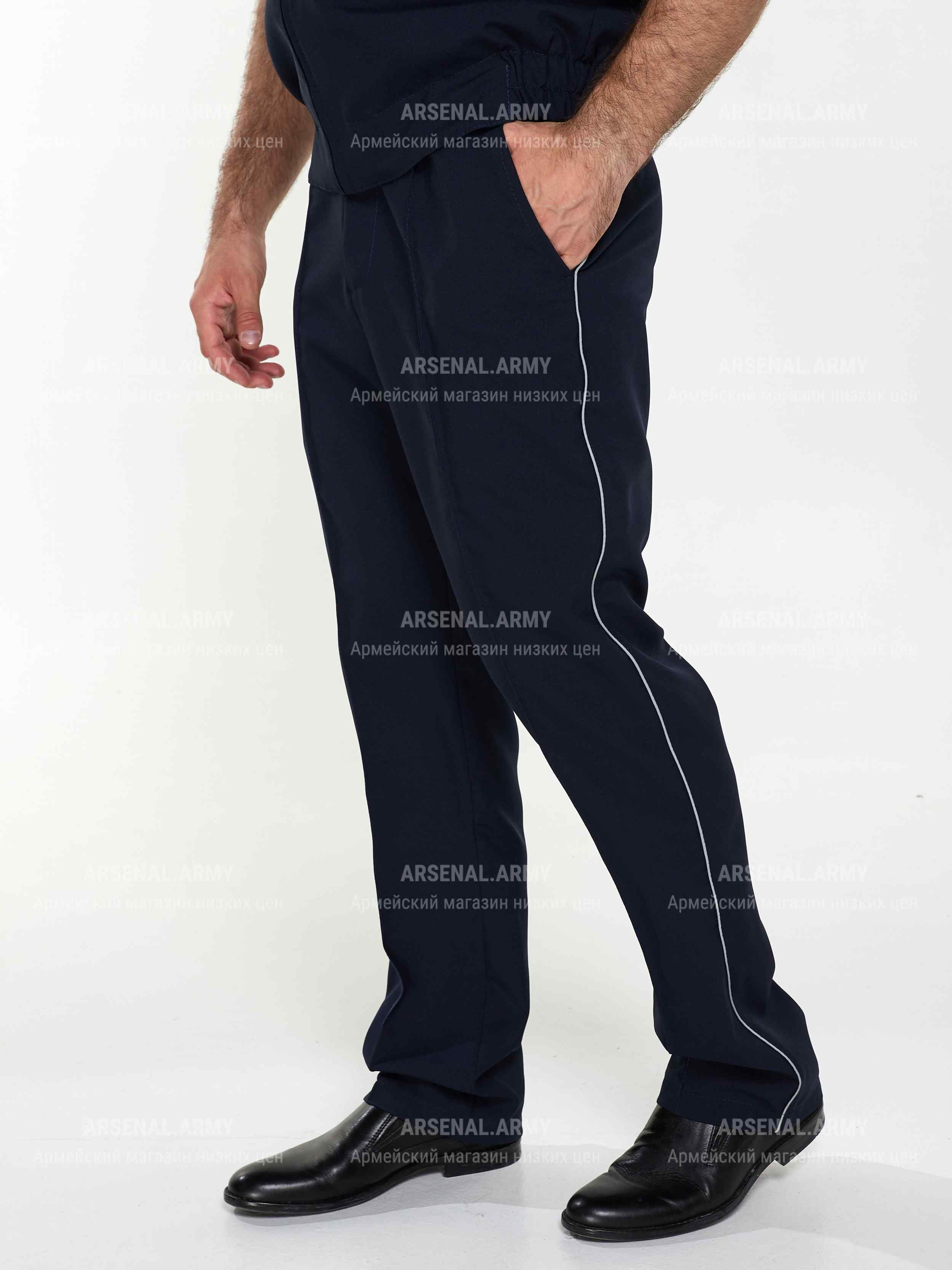 Брюки имеют строгий покрой, застегиваются на молнию и пуговицу. По бокам два кармана под руки. Вдоль штанин есть втачной кант из светоотражающей ленты.