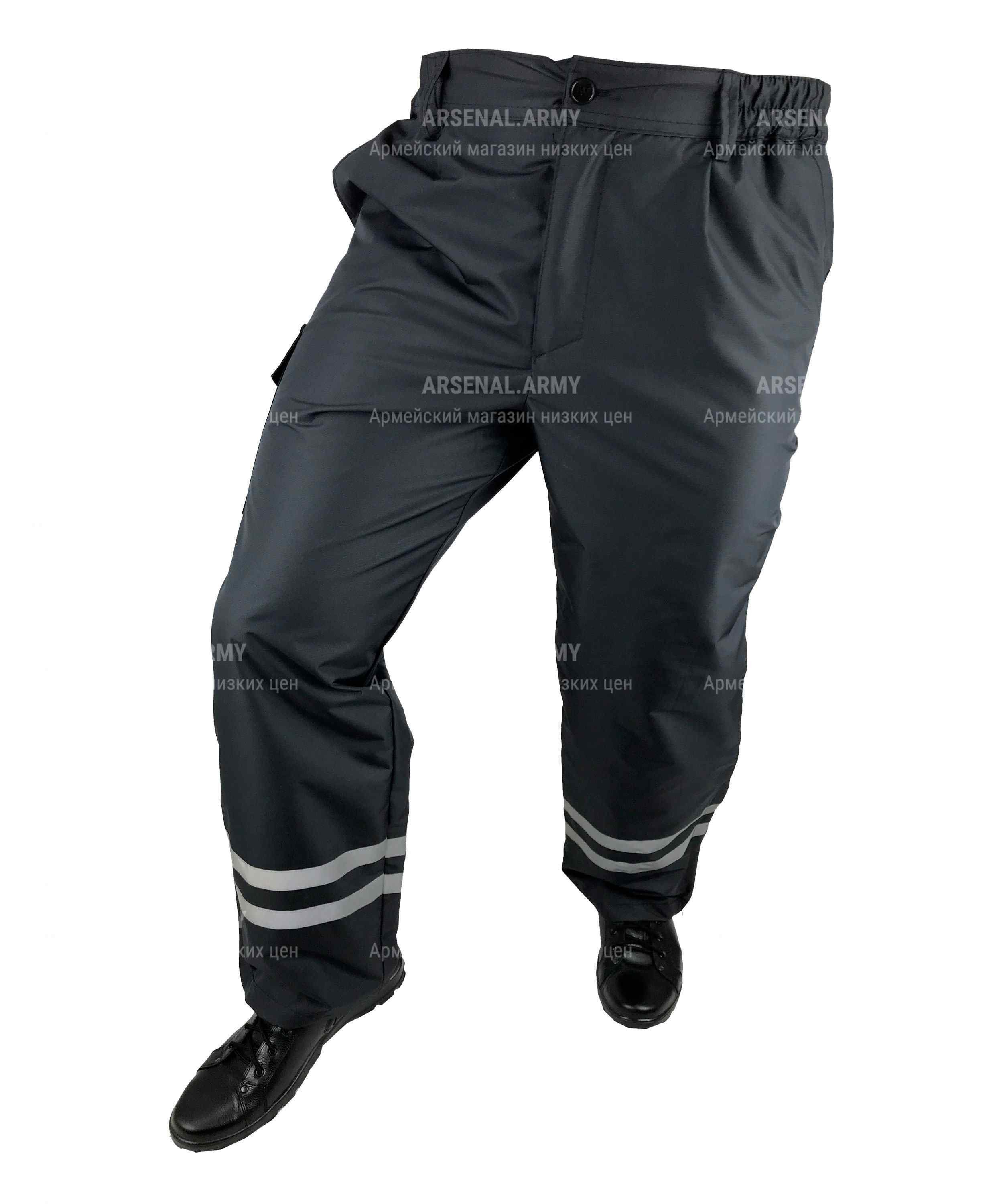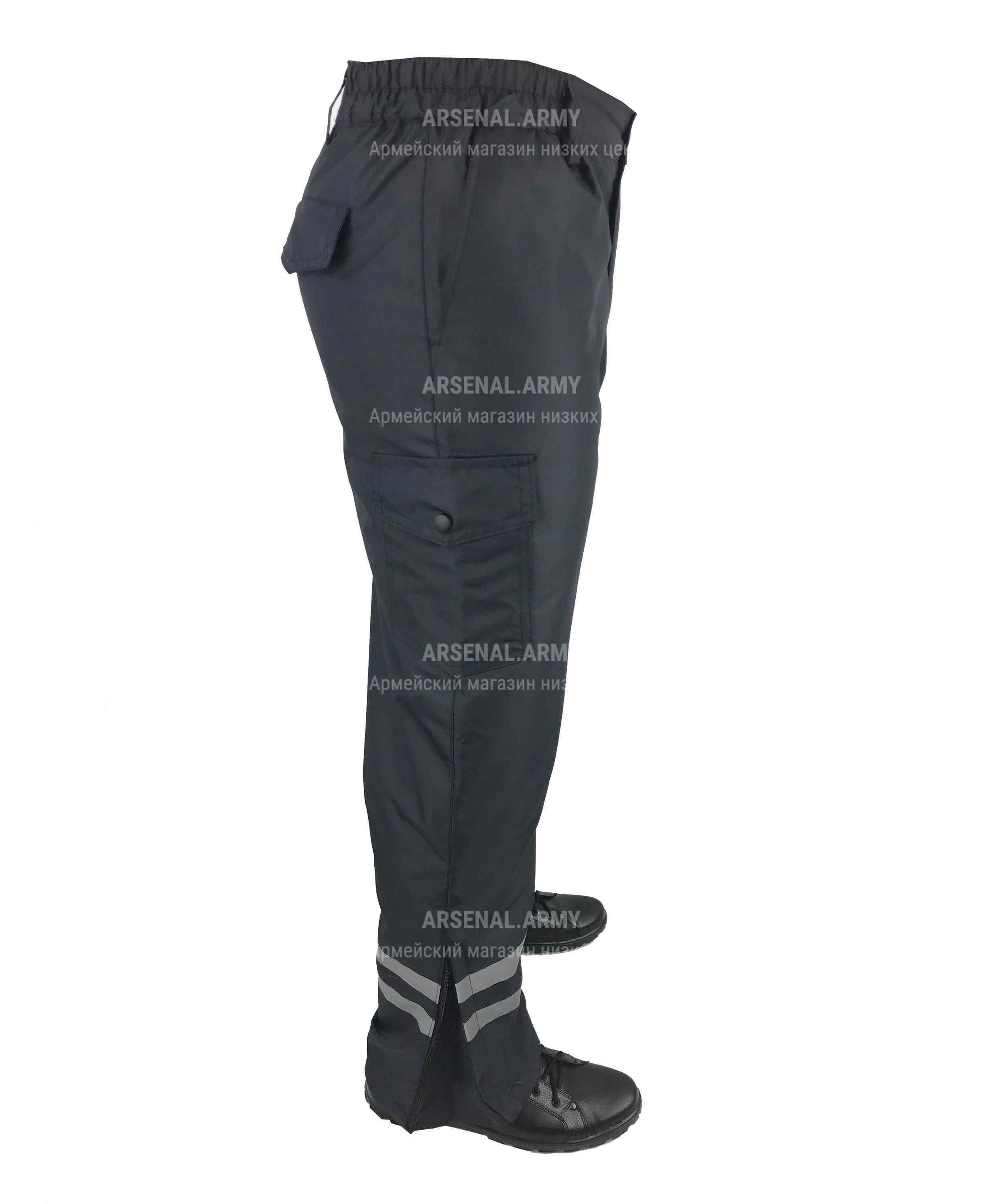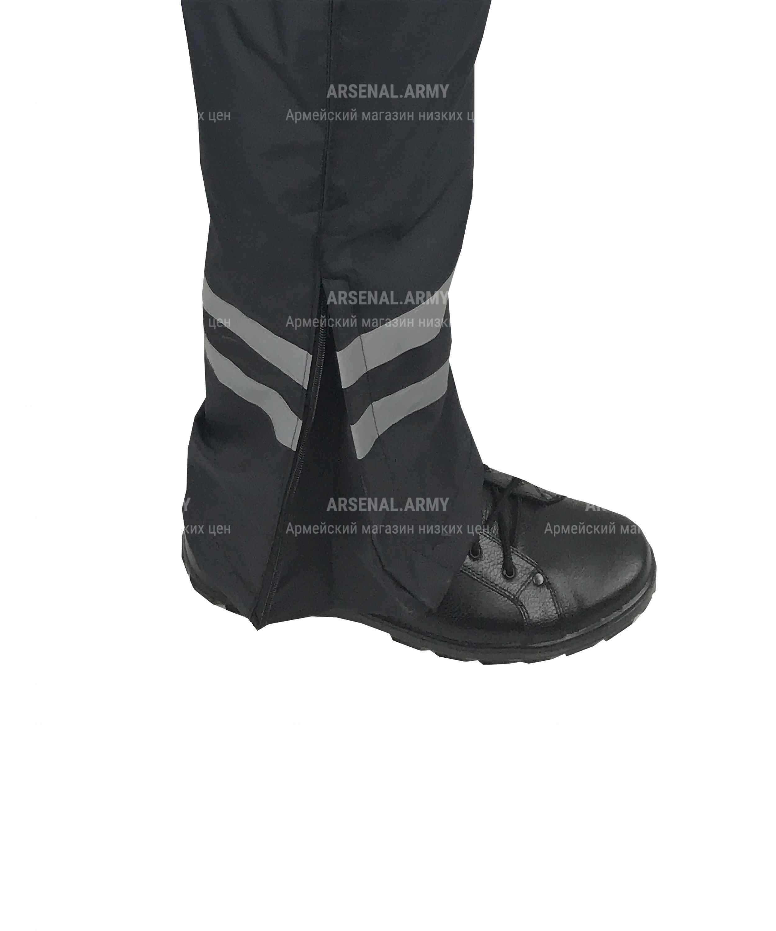 Материал пошива – полиэстр 100%, выполнена из мембранной ткани микрорипстоп, что обеспечивает полноценную защиту от осадков (ткань влагонепроницаемая) и холодного осеннего ветра, внутри подкладочный материал без утеплителя. Есть боковые прорезные карманы, а также один задний + один накладной набедренный. Застегиваются на пуговицу, ширинка – на молнии. В нижней части каждой из штанин расширение на молнии, нашиты по две полоски из светоотражающего материала.