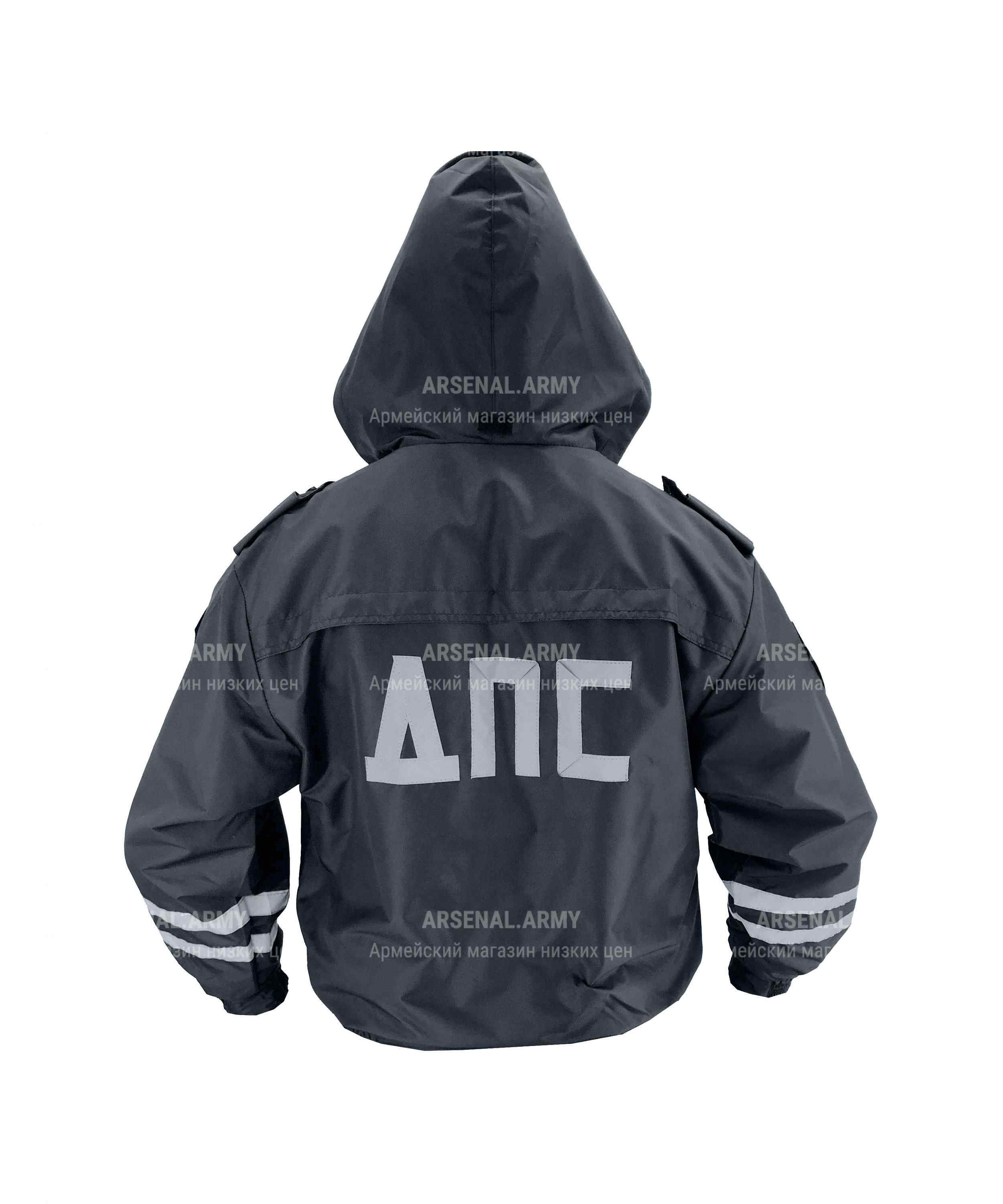 Ветровка ДПС имеет прямой покрой и утеплена синтепоном. Капюшон утягивается по голове, эффективнее защищая от ветра и осадков. При необходимости его можно спрятать в воротник.