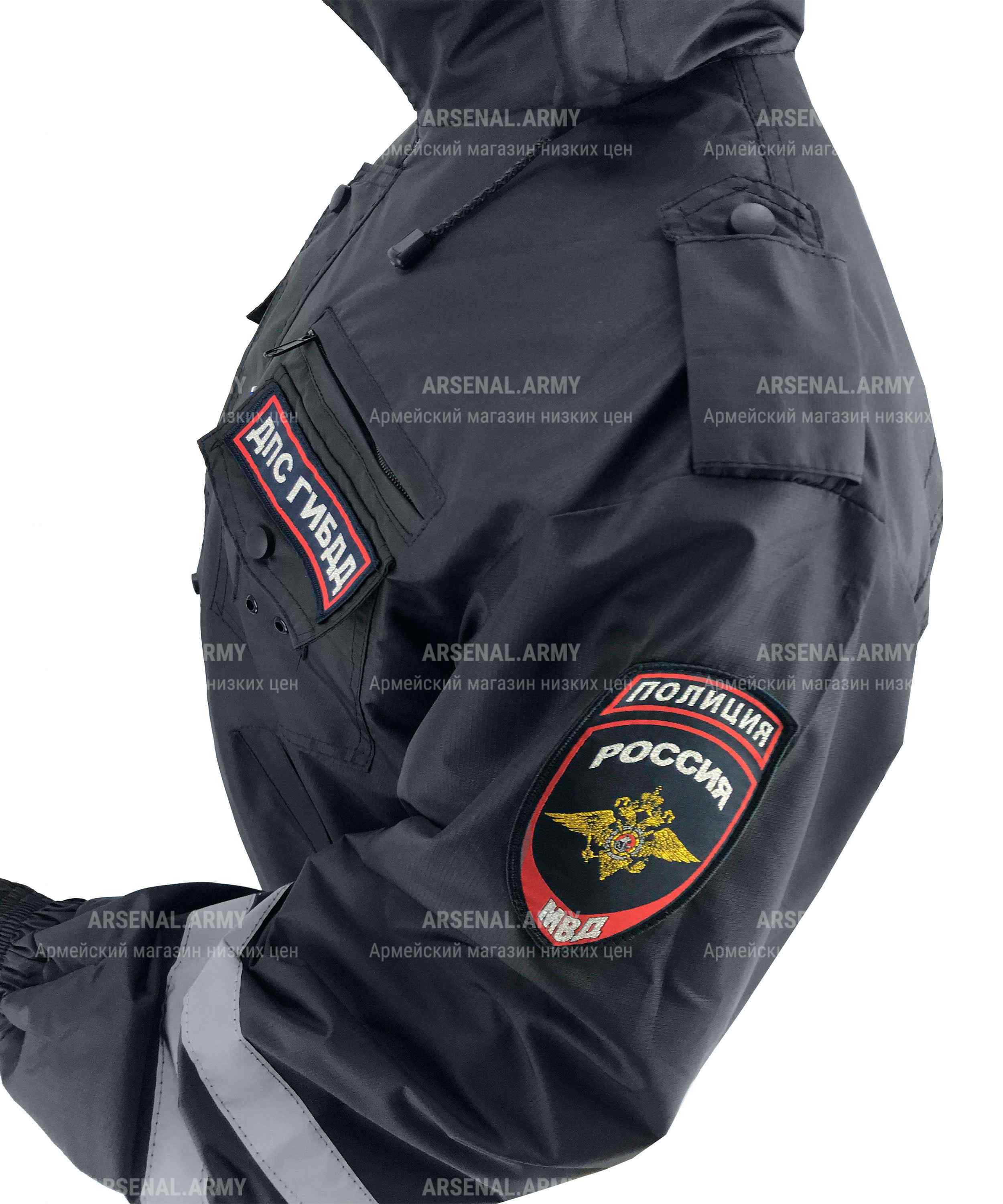 Плечи рукавов дополнены фальшпогонами и шевроном с надписью "Полиция МВД" с гербом и машиной. По низу рукавов проходят светоотражающие полоски. Рукава фиксируются на резинку.