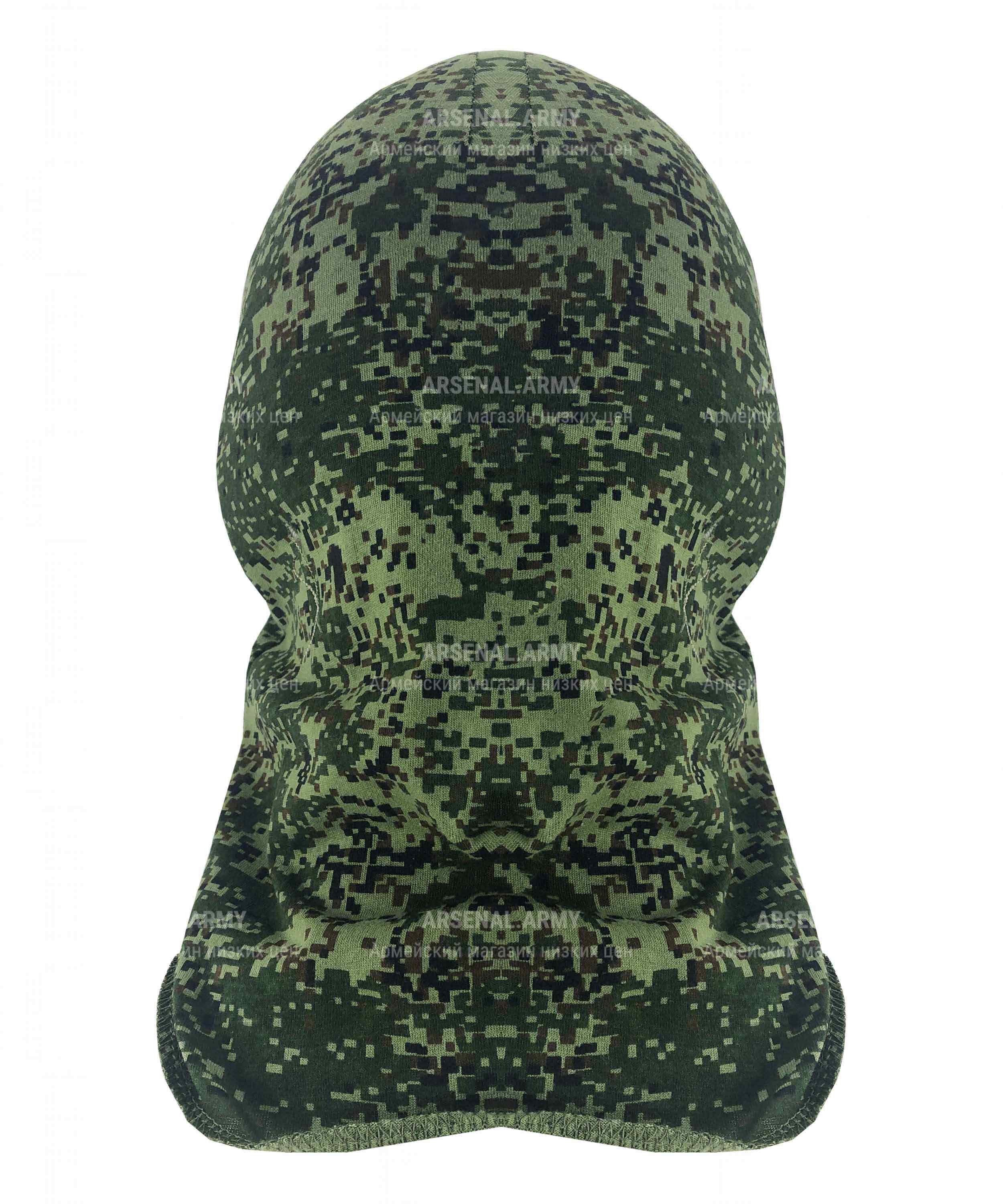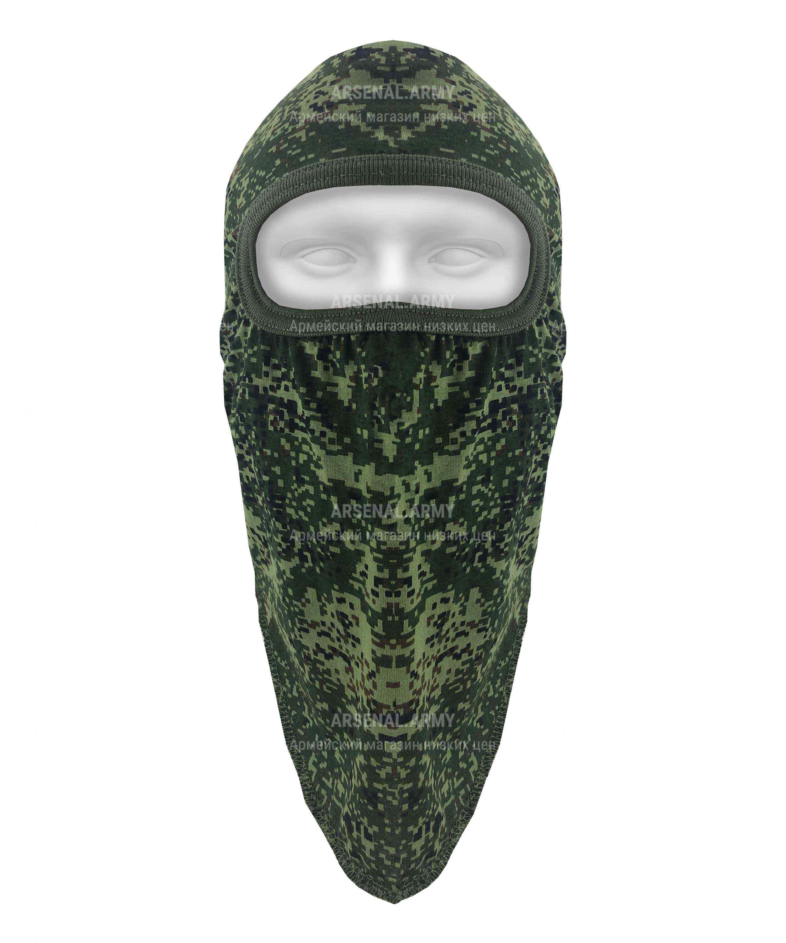 Данная модель – маска, элемент стандартного всесезонного комплекта базового обмундирования. Предмет одинаково полезный и для военных, и для других мужчин. Трикотажное изделие пошито из на 100% натуральной хлопчатой ткани. Цвет – цифровой камуфляж в полевой зеленой расцветке. Маска длинная, хорошо закрывает не только голову, но и горло. Прорезь только одна – для глаз.