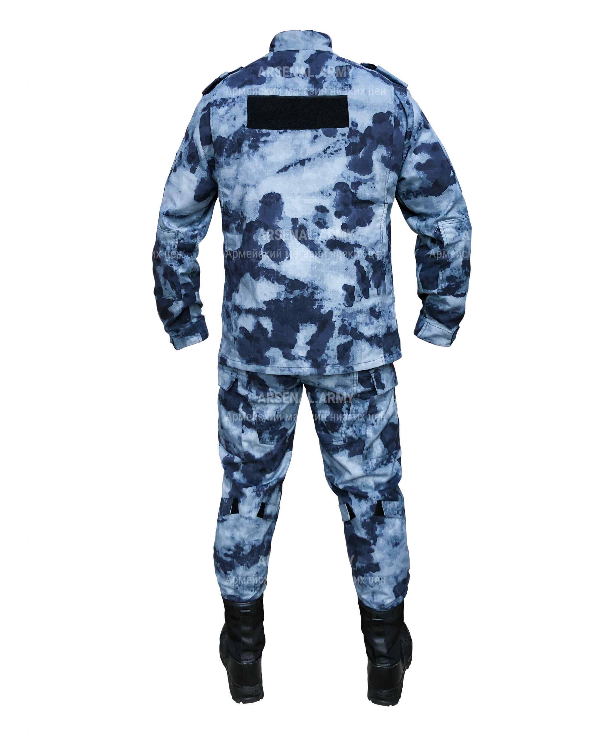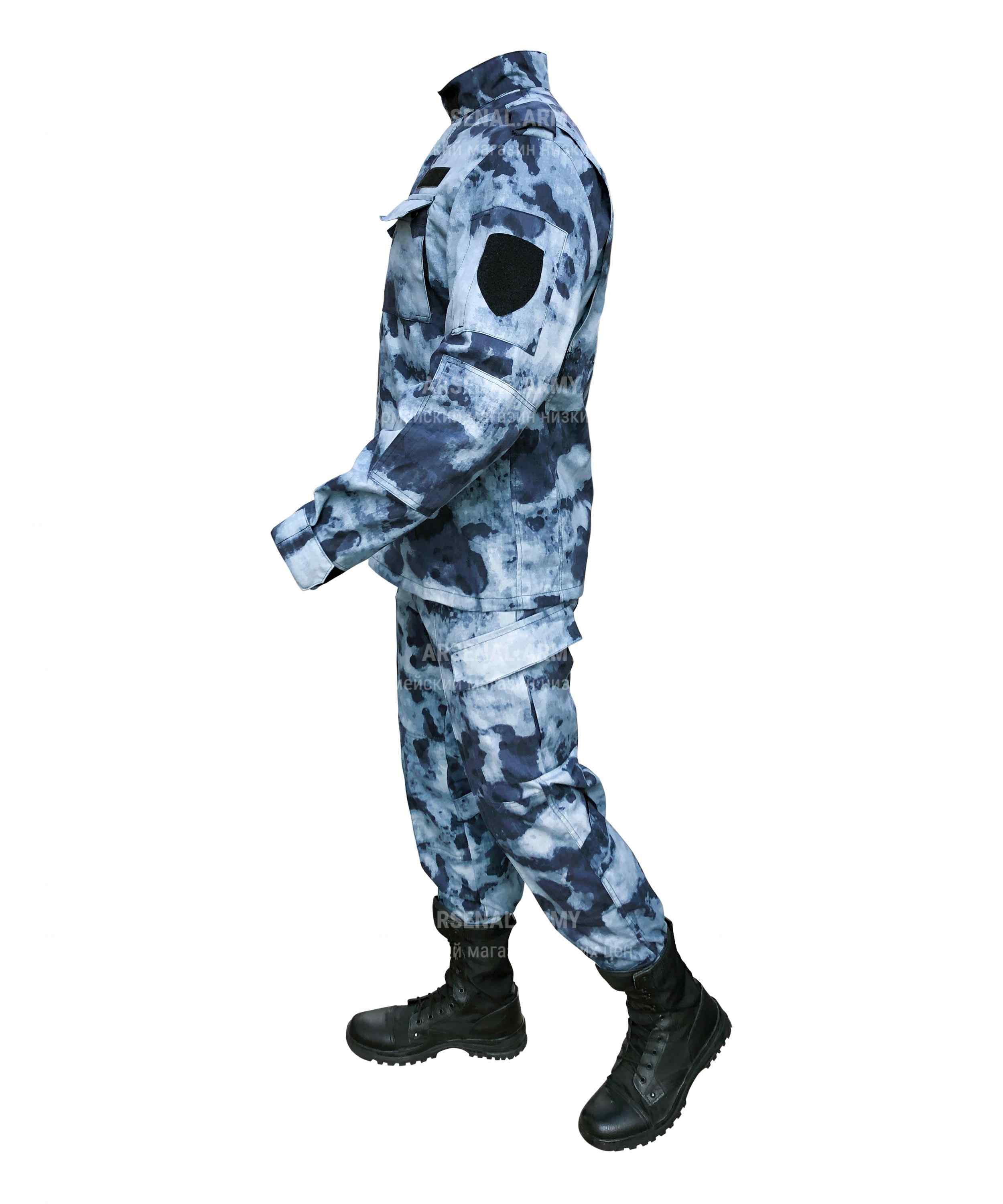 Костюм изготовлен для бойцов Росгвардии из сорочечной ткани в синей цветовой гамме с традиционным рисунком мох. Подойдёт для использования в летнее время.