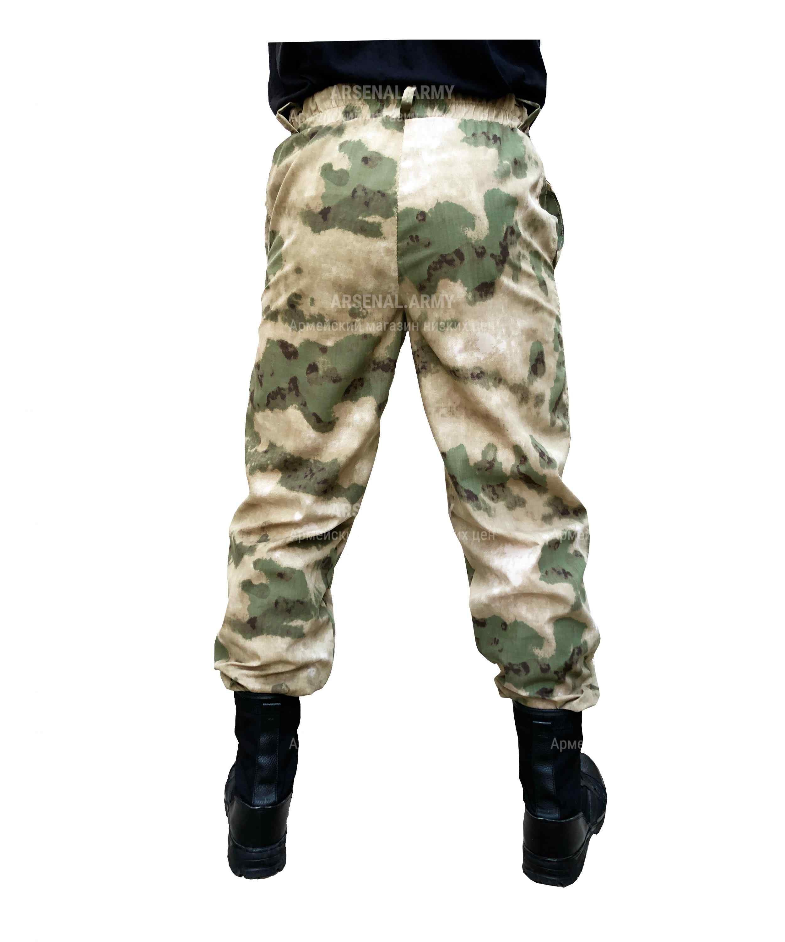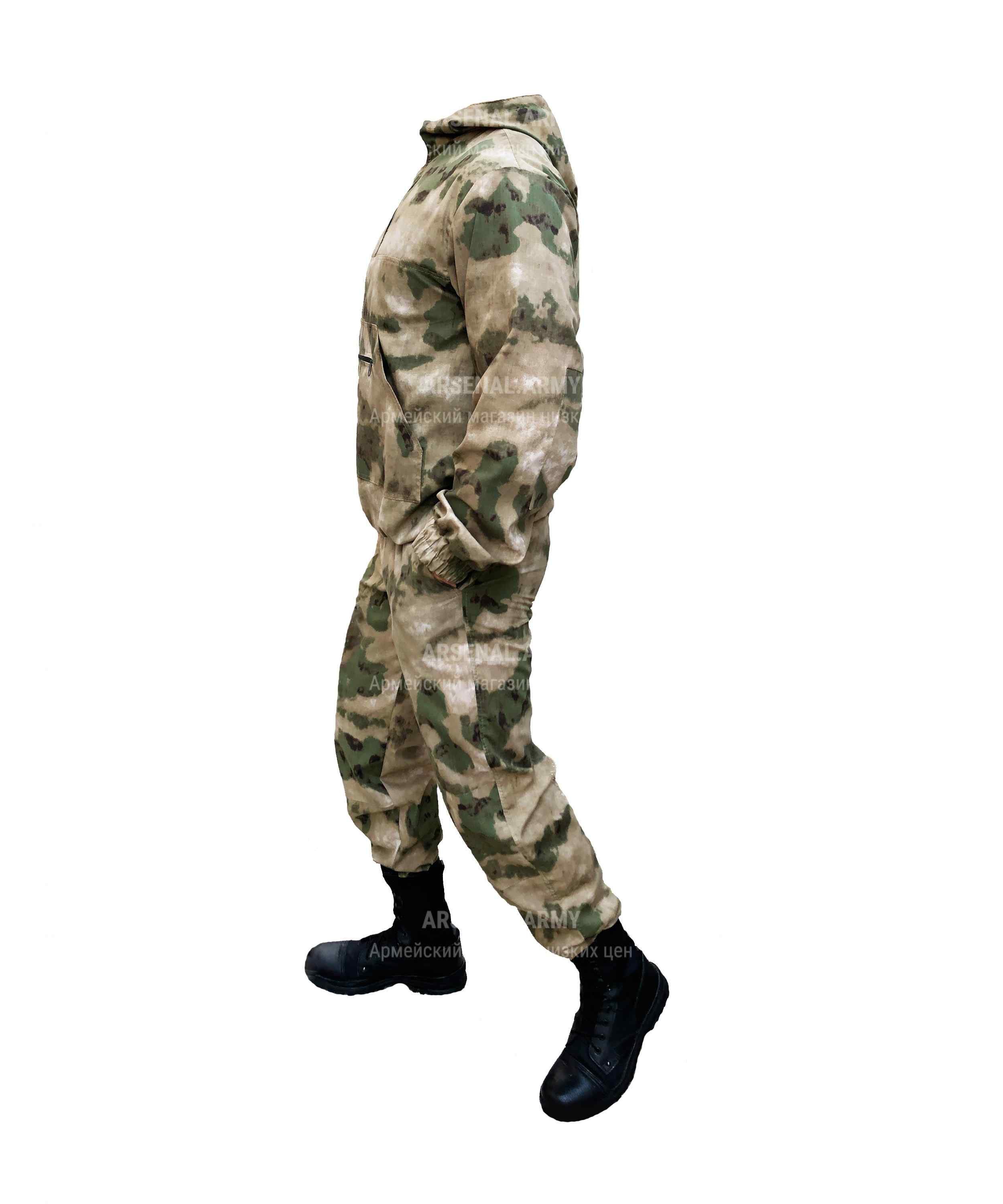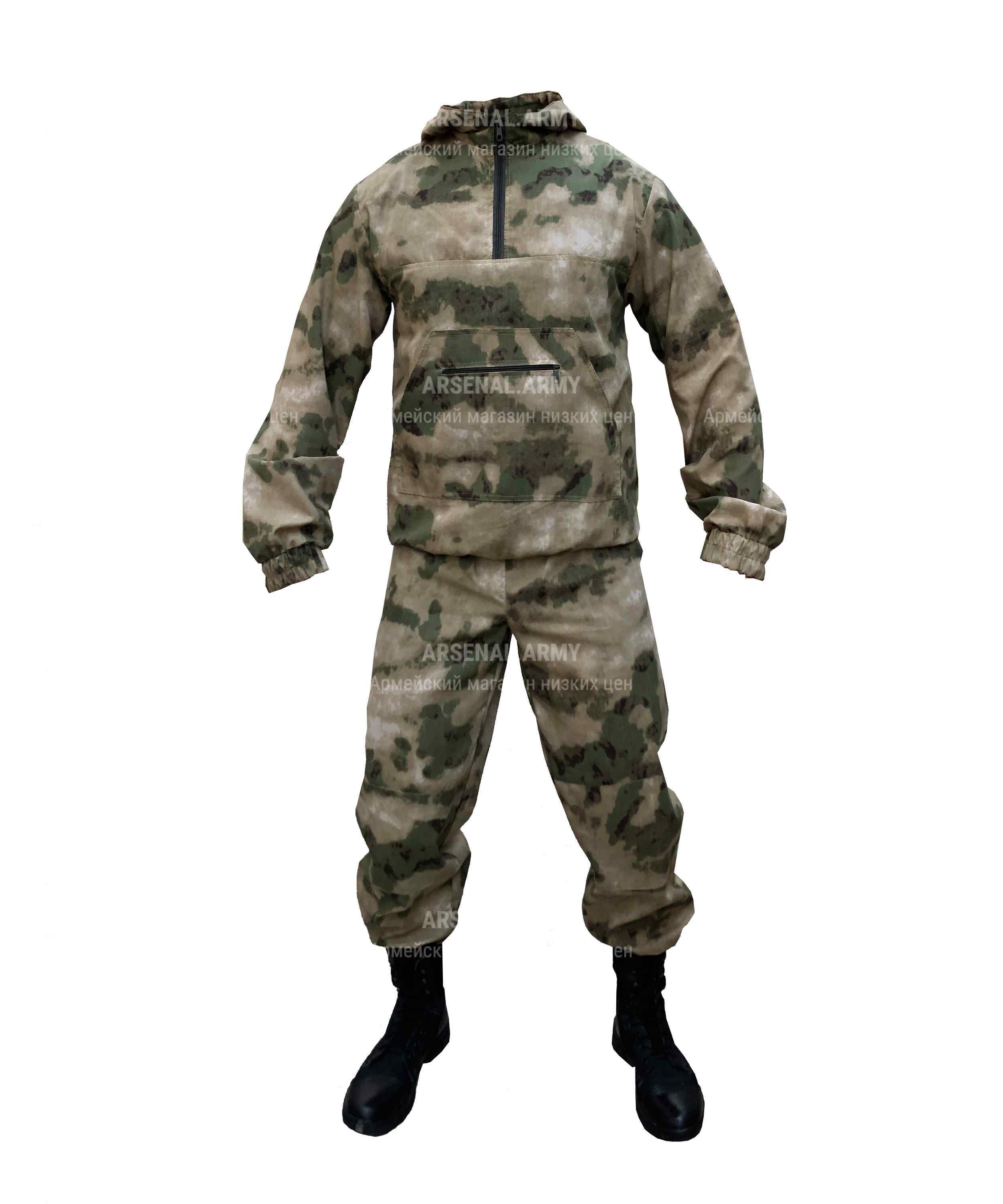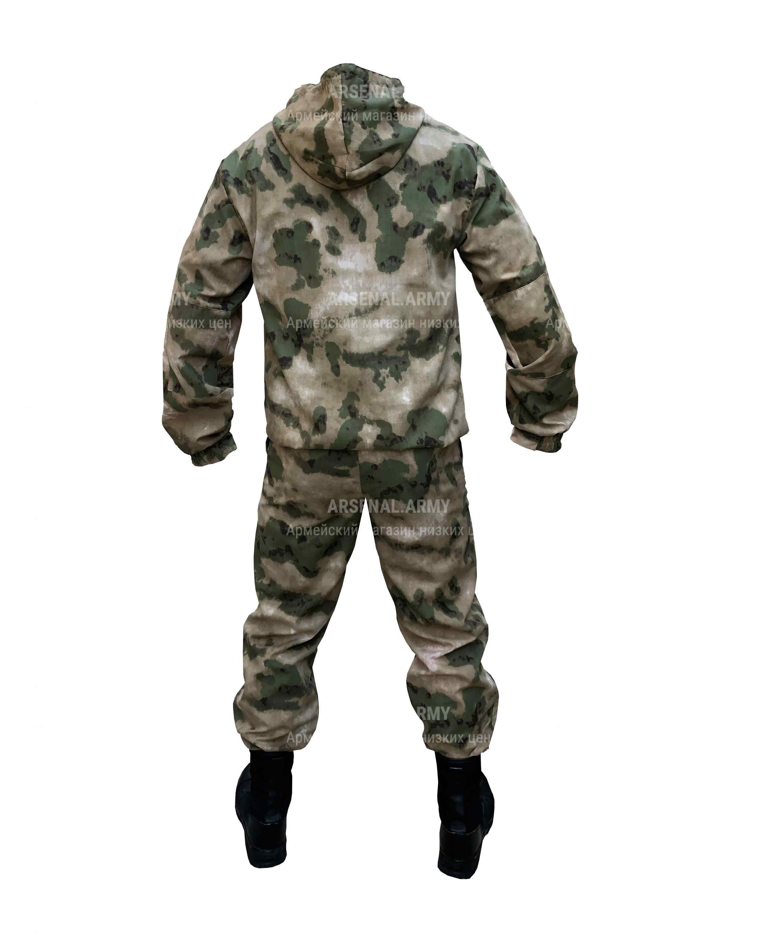 Данный комплект состоит из брюк и куртки. Они пошиты из лёгкой, немнущейся ткани, которая хорошо переносит стирку и не выгорает на солнце. Раскраска - мох.