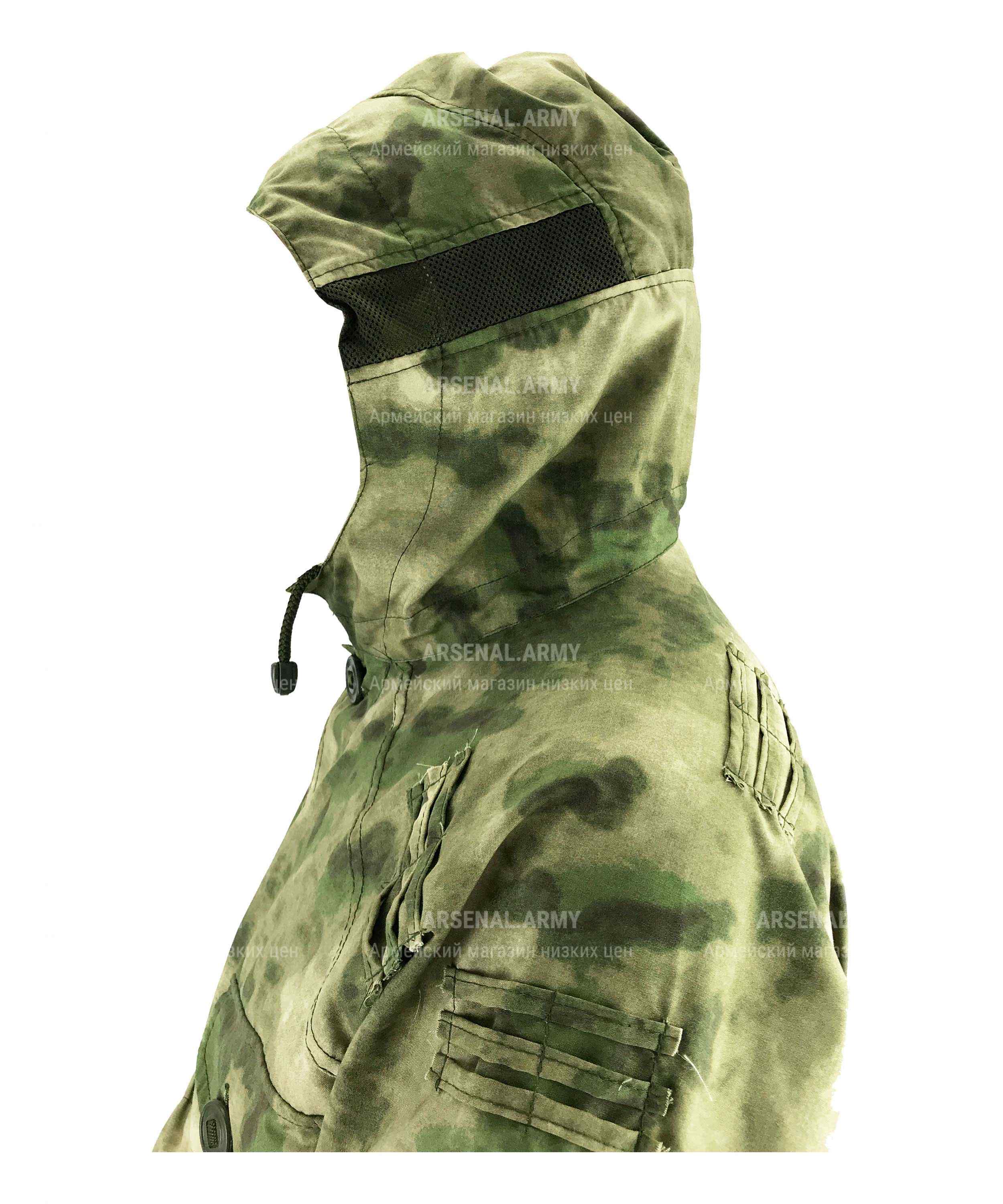 Куртка костюма просторная, удобная, не сковывает движения. Крой прямой. Пошита из не шуршащей ткани. Рукава длинные, заканчиваются полуперчатками. Между наладонниками и самими рукавами предусмотрены эластичные стяжки. Есть глубокий капюшон с утяжкой и сеткой для вентиляции. Подмышками есть аналогичная сетка.