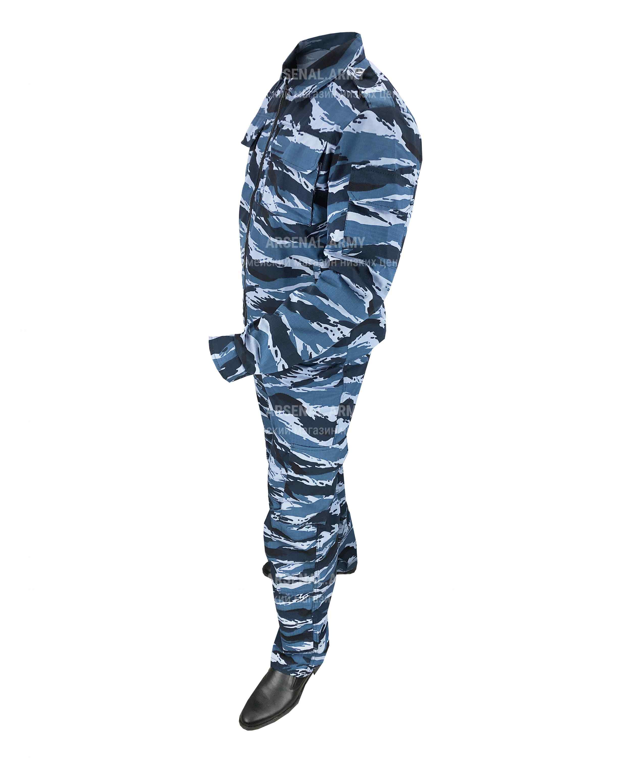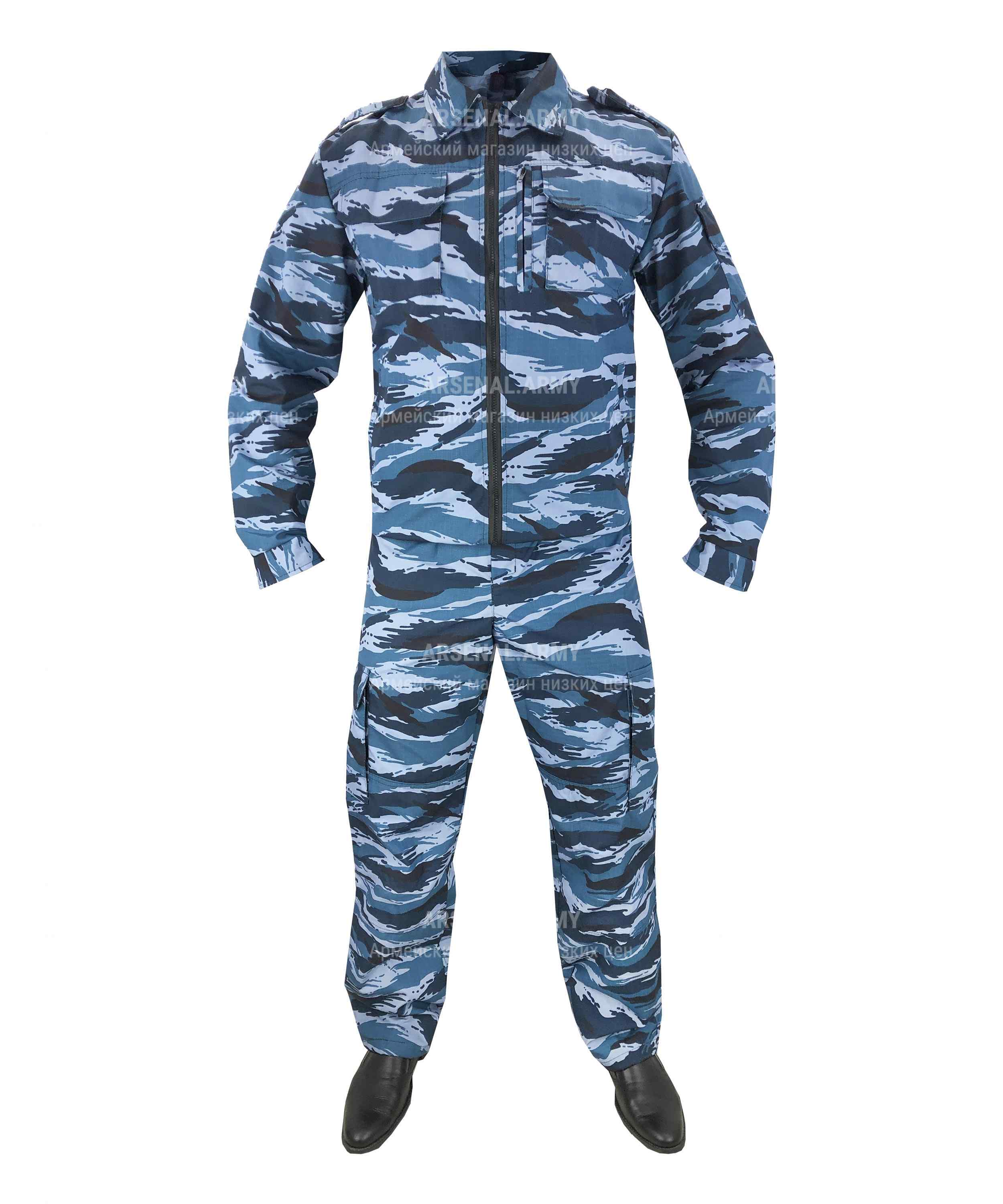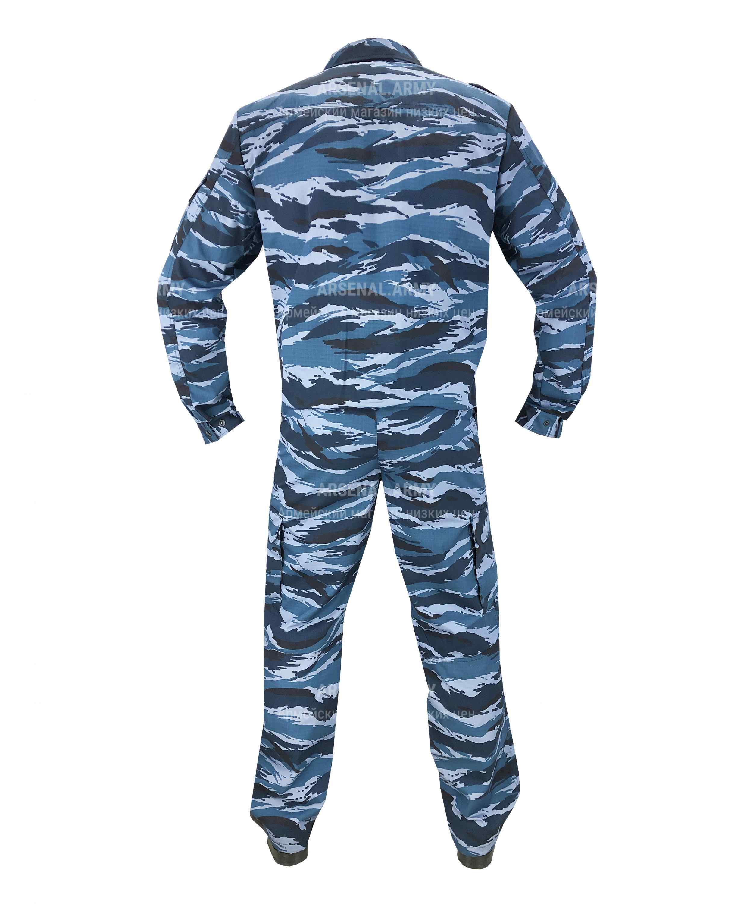 Костюм состоит из куртки и штанов. Оба предмета пошиты умеренно свободными по покрою, но не чрезмерно мешковато, так что охранник в них будет выглядеть аккуратно и подтянуто. Материал пошива – армированная синтетической нитью ткань «рип-стоп», отличающаяся повышенной разрывной прочностью и стойкостью к истиранию. Расцветка камуфляжная – классическая российская «берёзка».