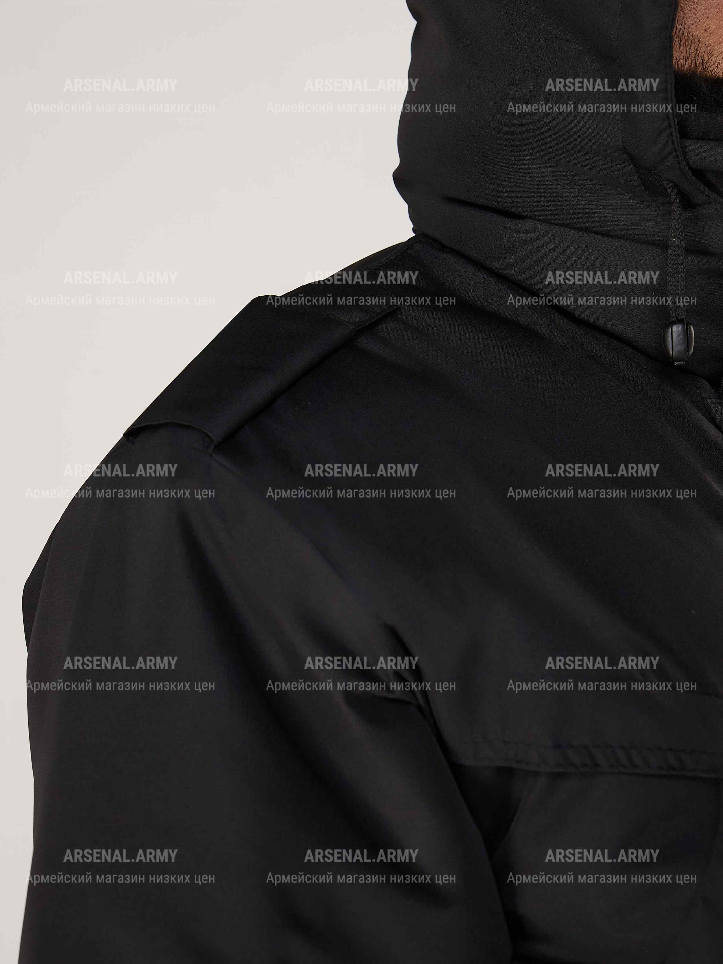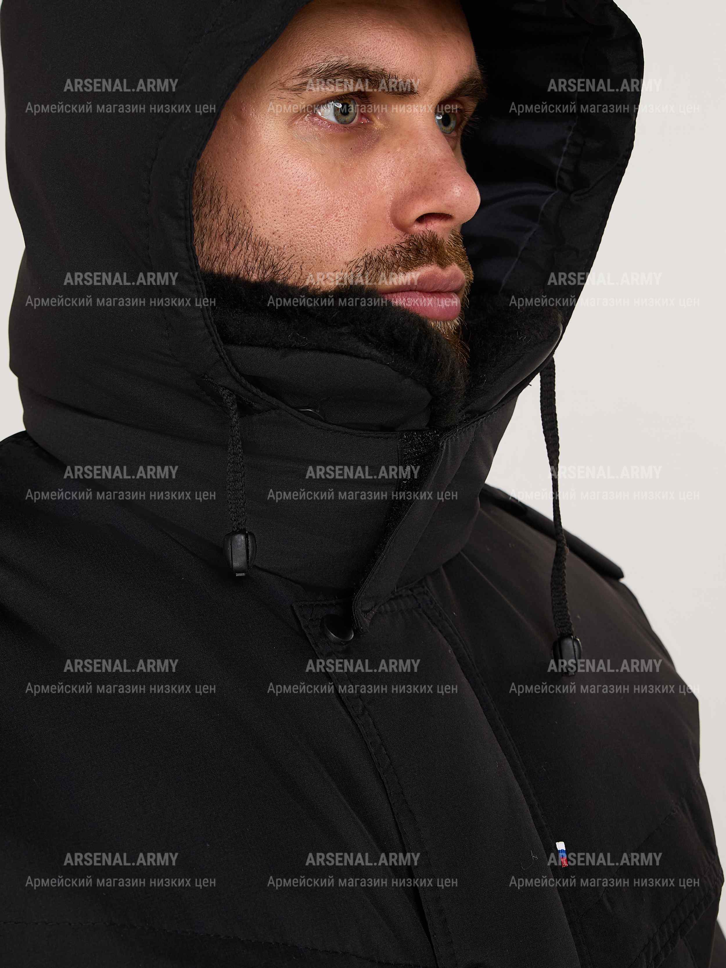 Куртка имеет отстегиваемый капюшон, регулируемый стяжкой. Фиксируется за воротником липучкой. Дополнительная защита лица от холода обеспечивается поднимаемым меховым воротником и тканевыми накладками на капюшоне, закрывающими подбородок и рот. Воротник также можно отстегнуть. На плечах присутствуют фальшпогоны.