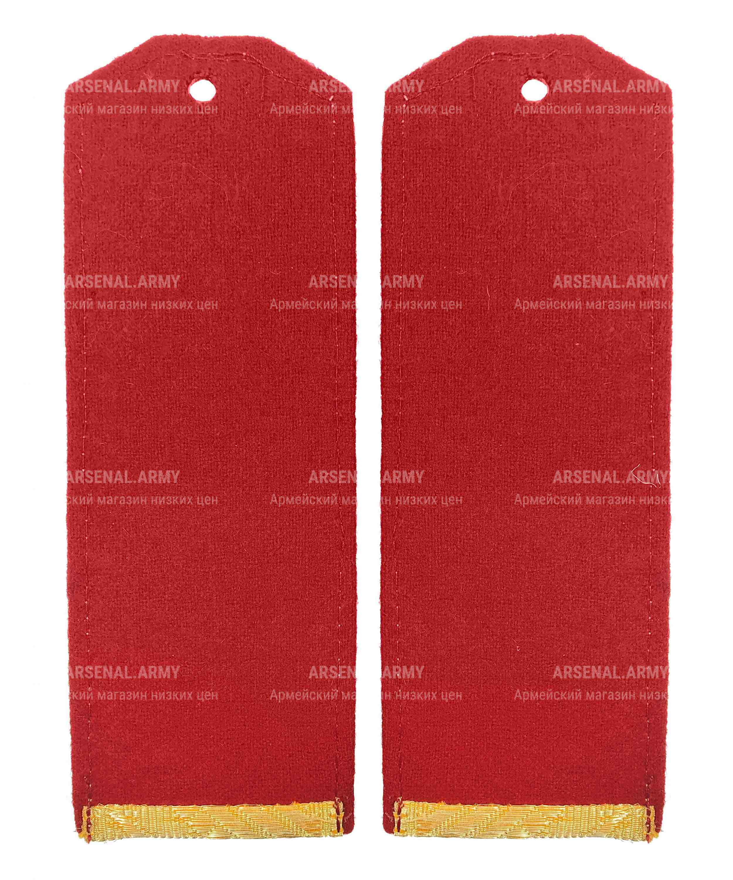 Погоны имеют красную окантовку. Форма - трапециевидная. Материал изготовления - парадная погонная лента на картонной подложке. Все узоры вышиты нитью, а звезда - канителью. Это металлизированная витая нить с золотым напылением.
