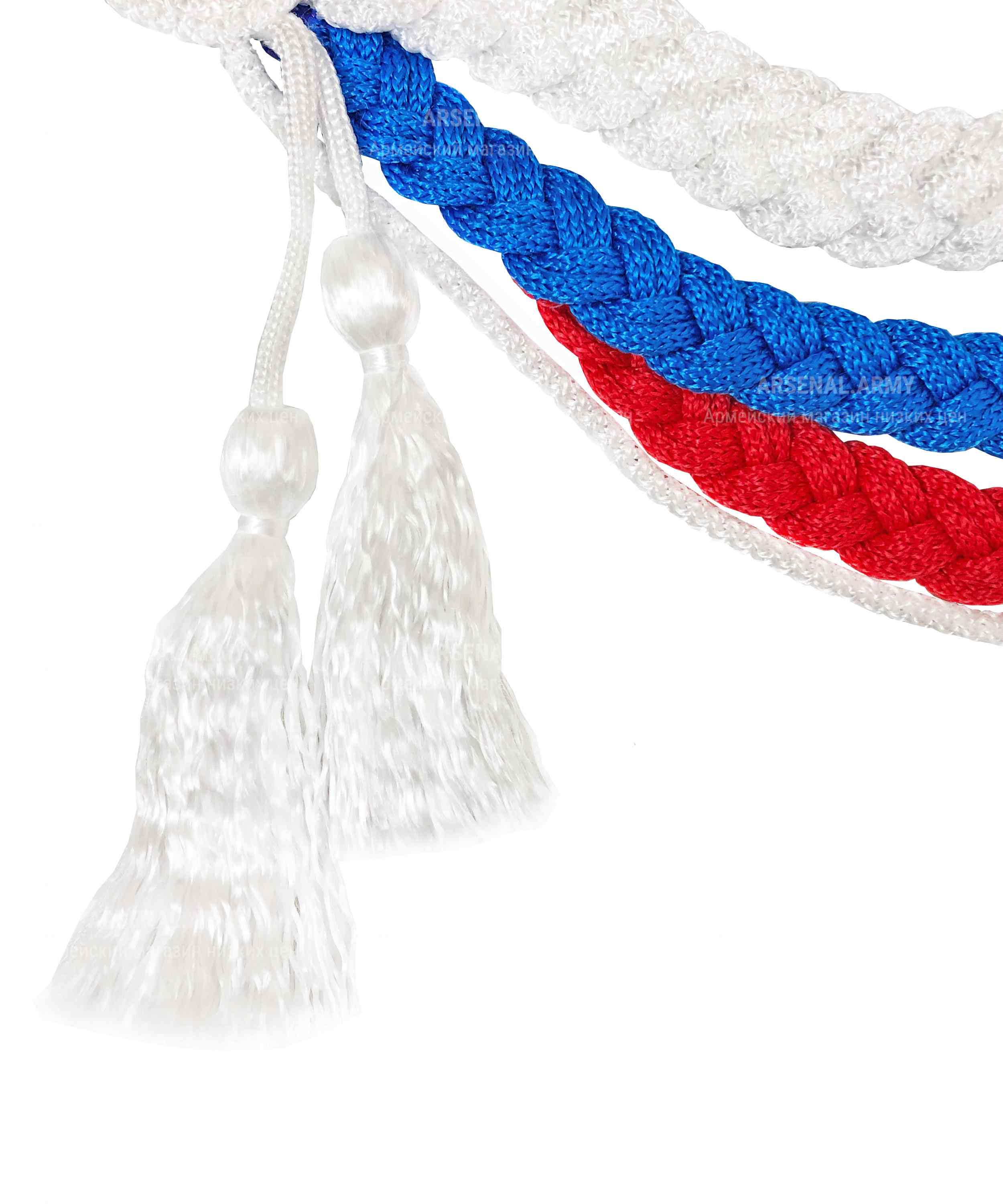 Данная модель представляет собой изделие, сплетенное из высокопрочных синтетических нитей белого, синего и красного цветов. Аксельбант декорирован двуглавым орлом желтого цвета, отлитым из металла. Обратите внимание на качество изготовления: в изделии нет никаких изъянов, все выполнено предельно аккуратно, металлический герб отличается высокой степенью детализации. Благодаря продуманному подбору материалов изготовления модель отличается прочностью, хорошо переносит чистку и стирку. Выверенная конструкция и точные размеры гарантируют, что аксельбант идеально разместится на правом плече.