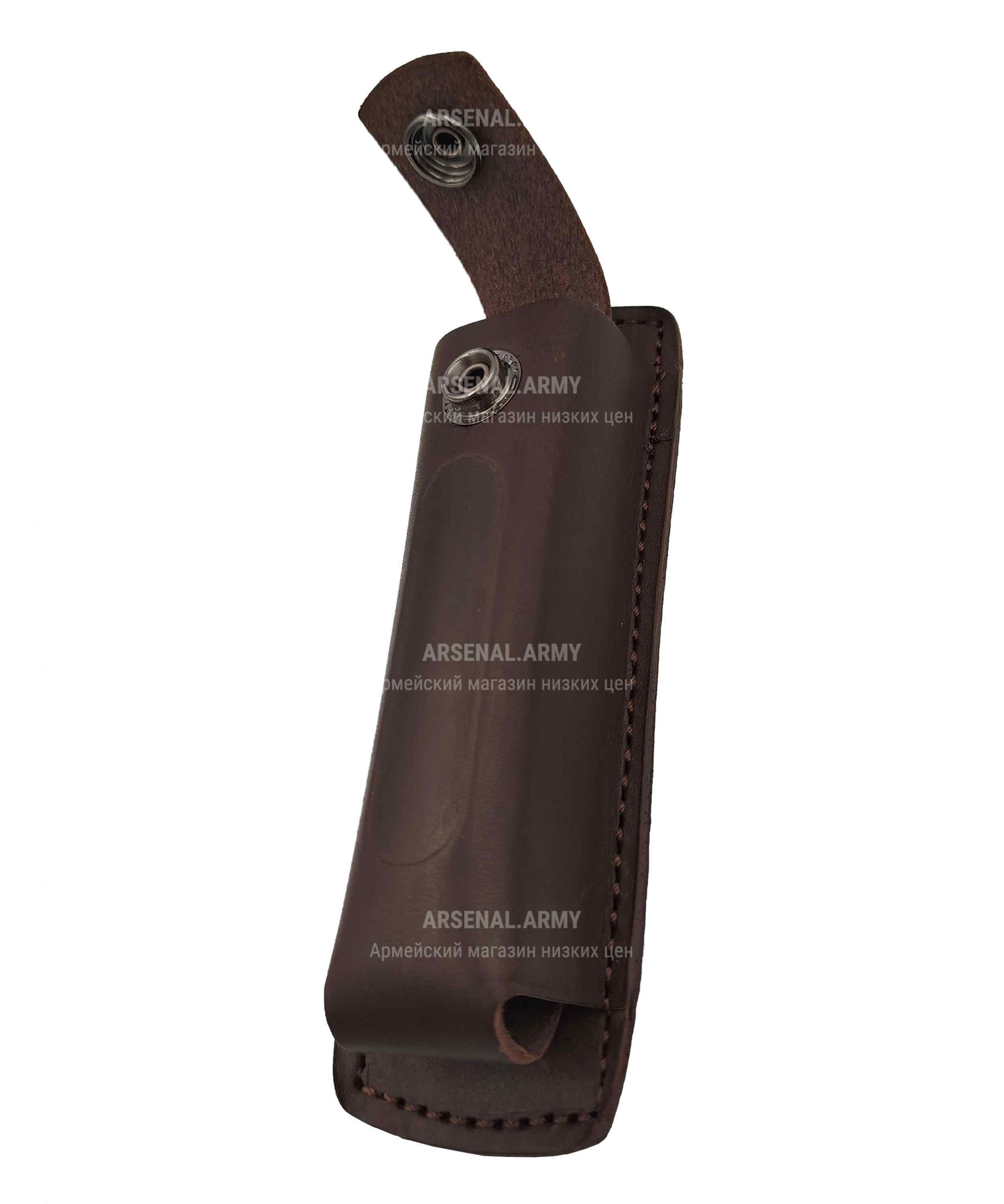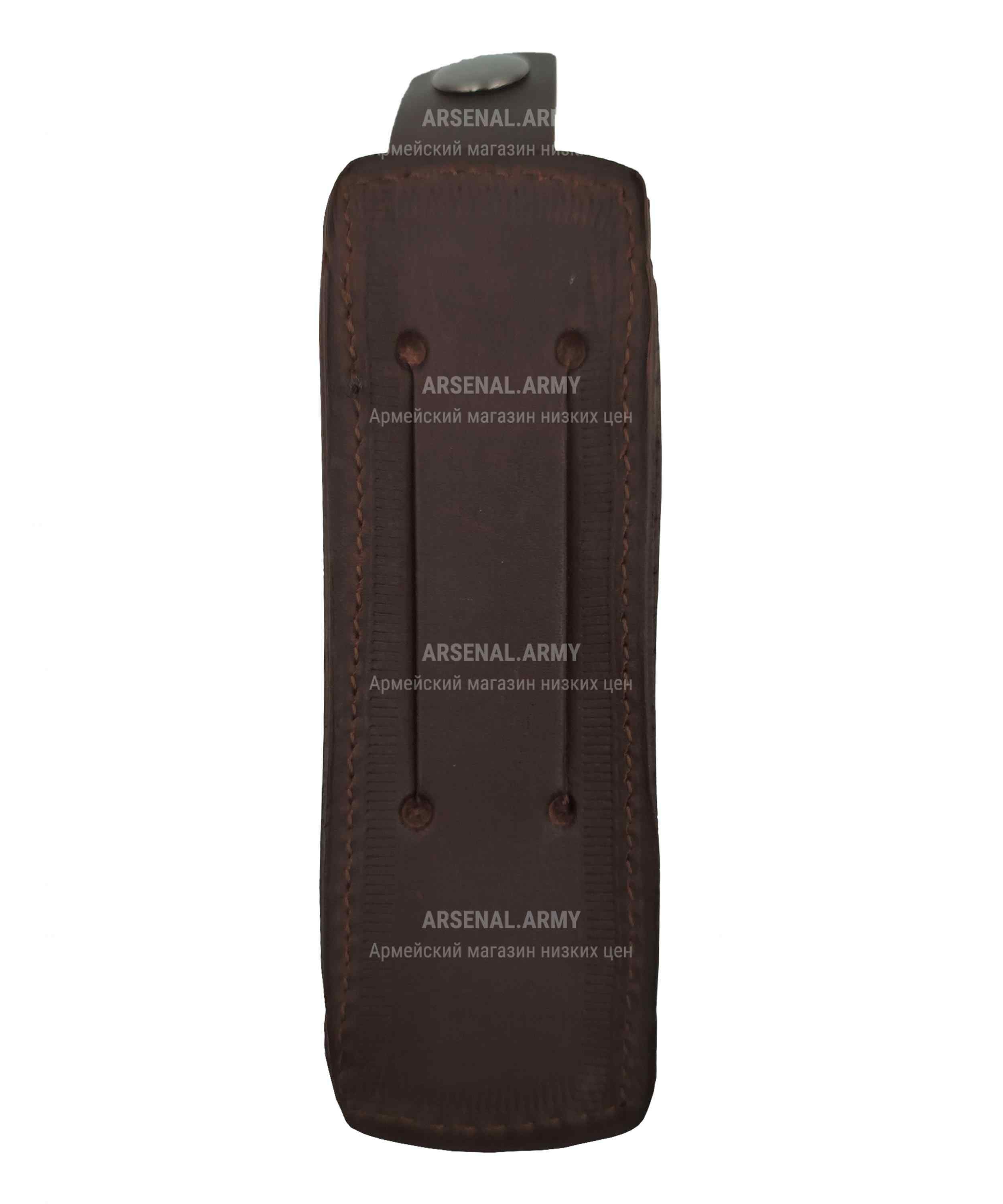Данная модель – универсальный чехол для запасной обоймы к пистолету Макарова. Также подходит для размещения близких по габариту магазинов. Предназначается строго для поясного крепления. Чехол полностью изготовлен из высококачественной натуральной кожи хорошей выделки, что гарантирует сохранение достаточной мягкости в любую погоду, а также отсутствие характерного запаха при нагреве на солнце. Крепится изделие на поясной ремень, шириной до 50 мм. Тип крепления – прорезное. Расположение чехла на поясе – строго вертикальное. Закрывается кожаным клапаном с фиксацией на металлической кнопке. Это простая, но всегда эффективная конструкция, блокирующая произвольное выпадение обоймы, но позволяющая ее при необходимости достать буквально одним движением.