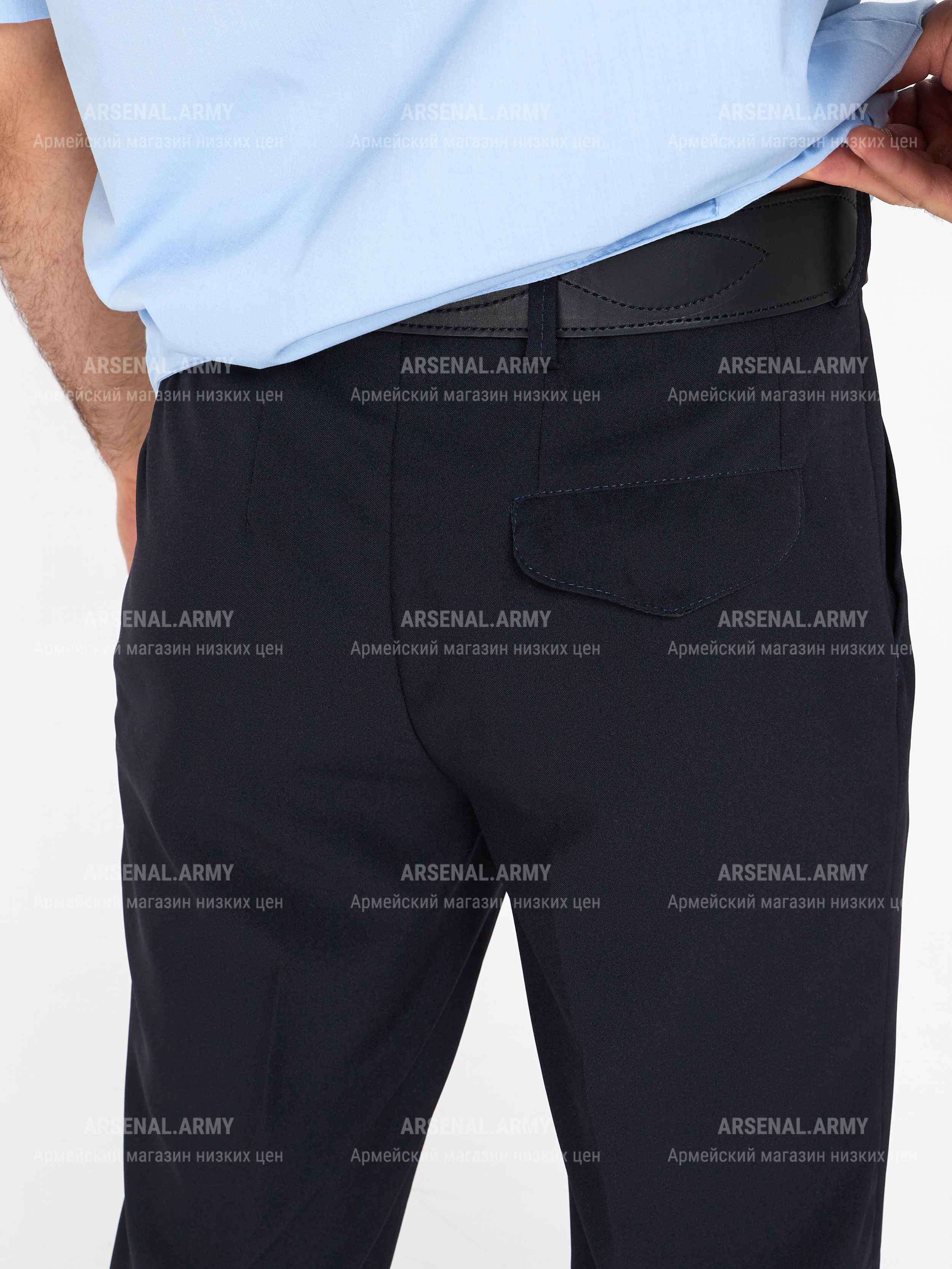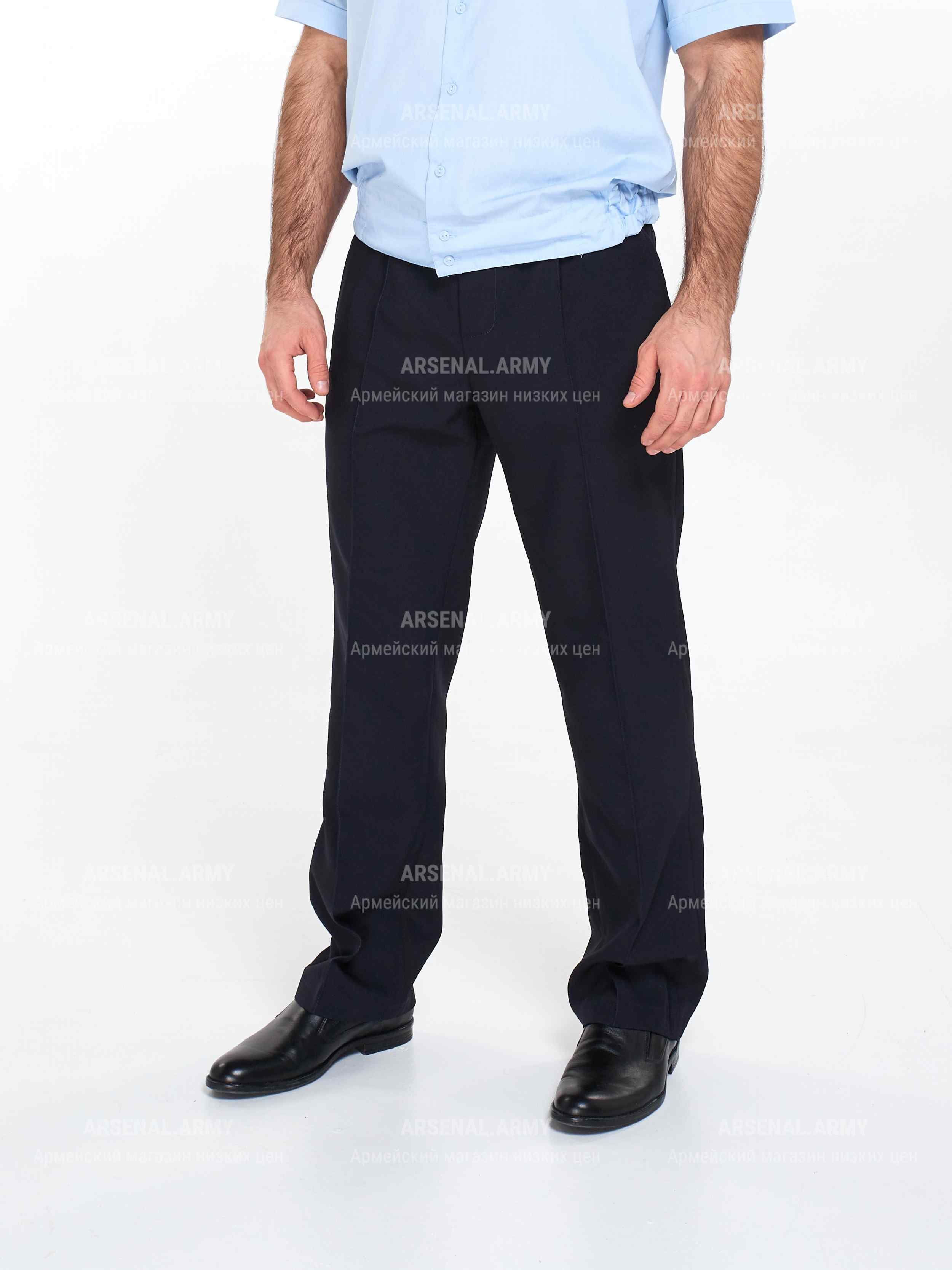 Брюки полиции представлены у нас в тёмно-синем цвете. Крой классический, фасон прямой. Застёгиваются на пуговицу и молнию. На брюках есть два боковых врезных кармана без застёжки, петли-держатели под ремень. По бокам штанин красный кант отсутствует. Сзади имеется карман на пуговице. Брюки универсальны и подходят под любую рубашку.