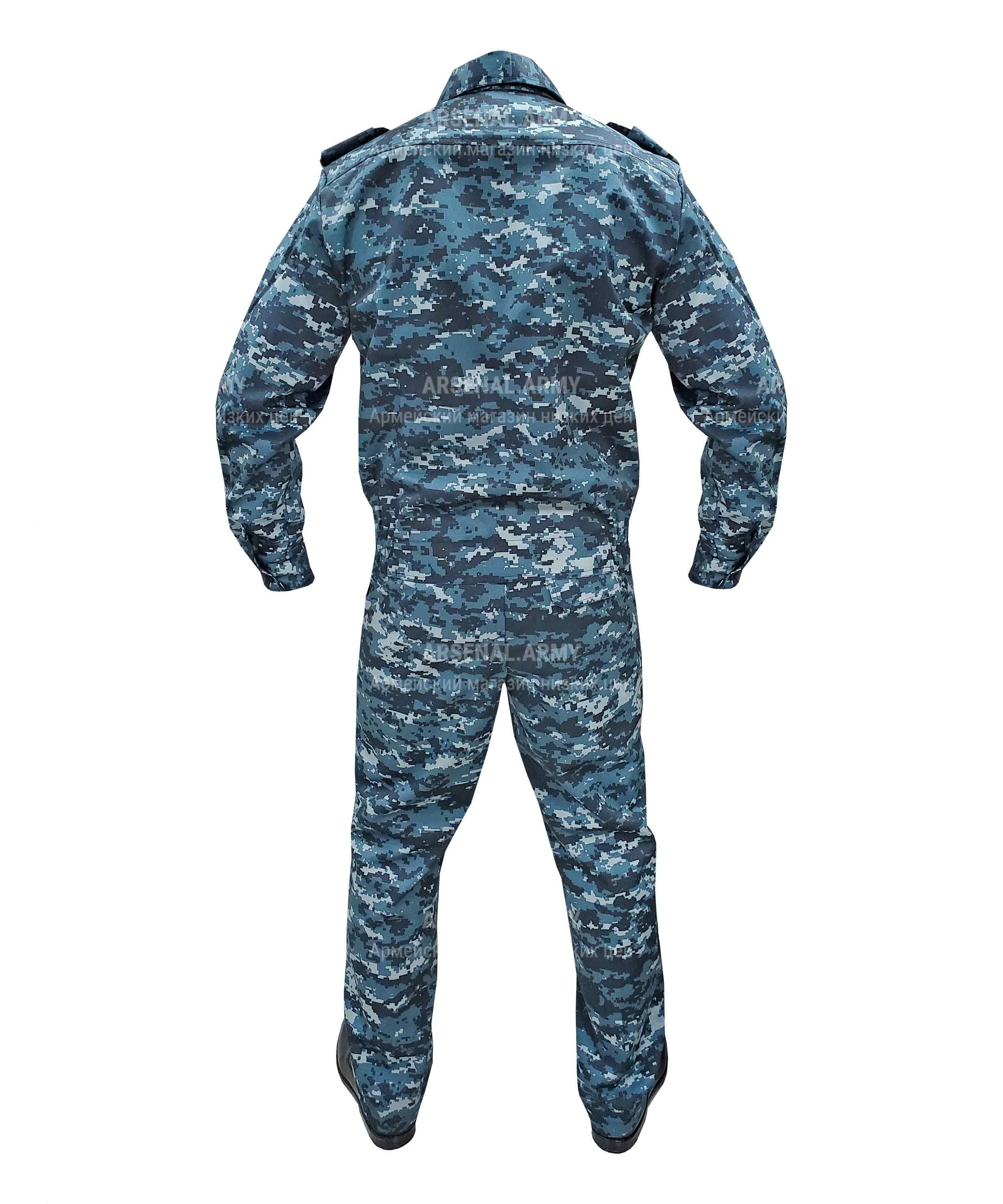 Костюм состоит из форменных брюк и куртки. Тип камуфляжа – цифровой, цветовая схема – синяя. Покрой куртки и брюк достаточно свободный, ориентированный на то, чтобы в них было удобно двигаться людям с разной комплекцией.