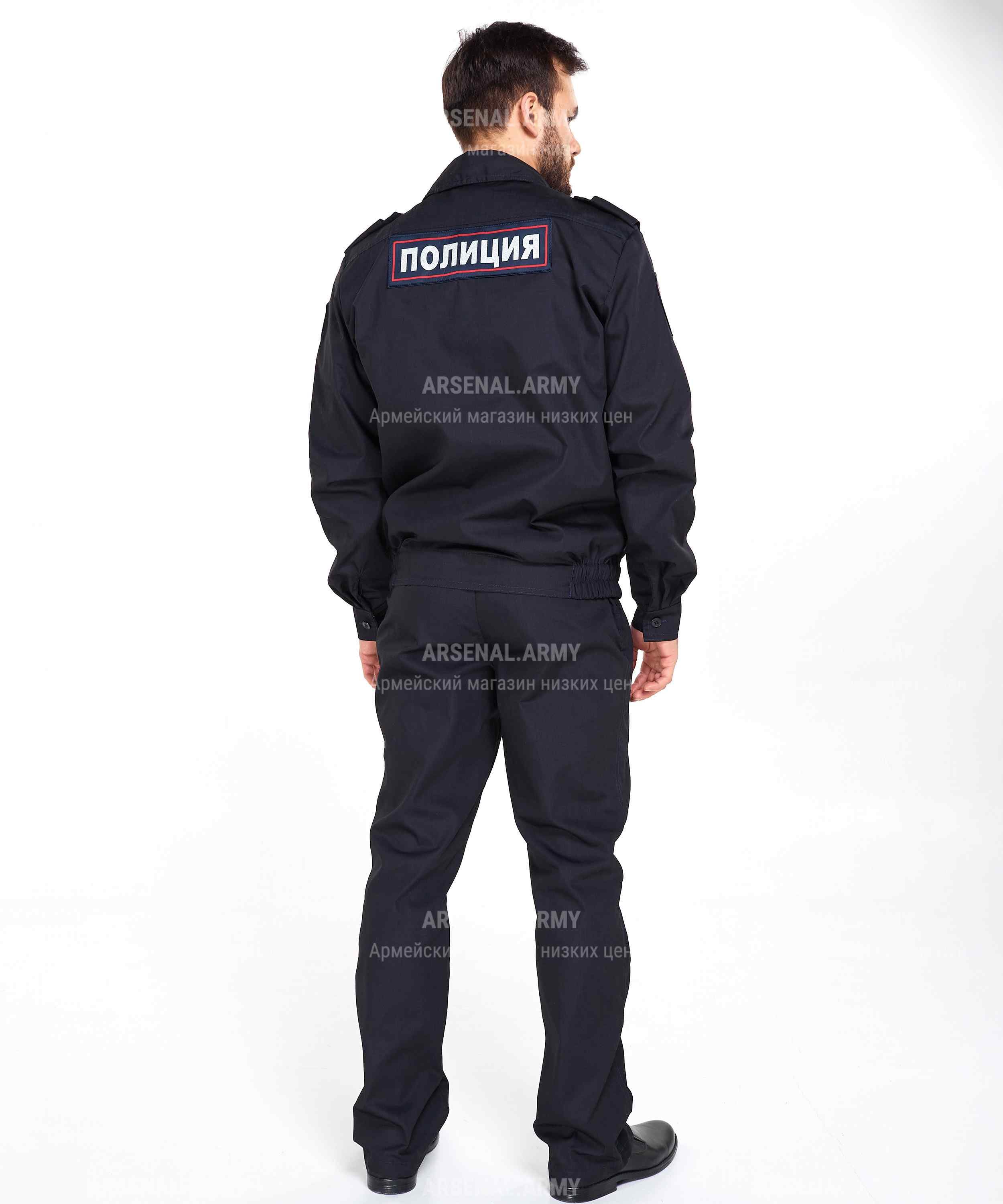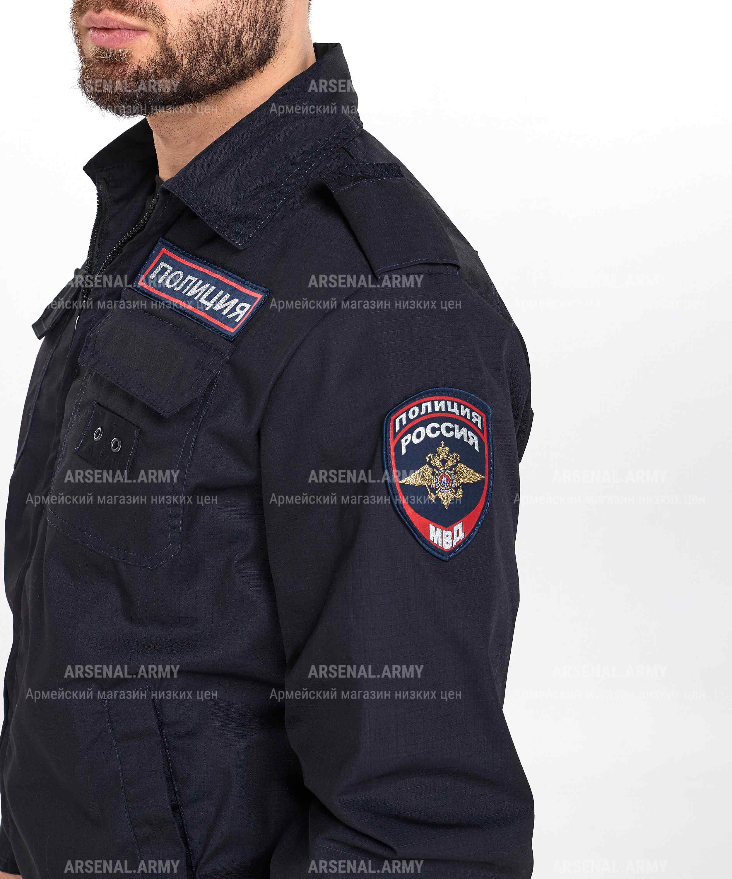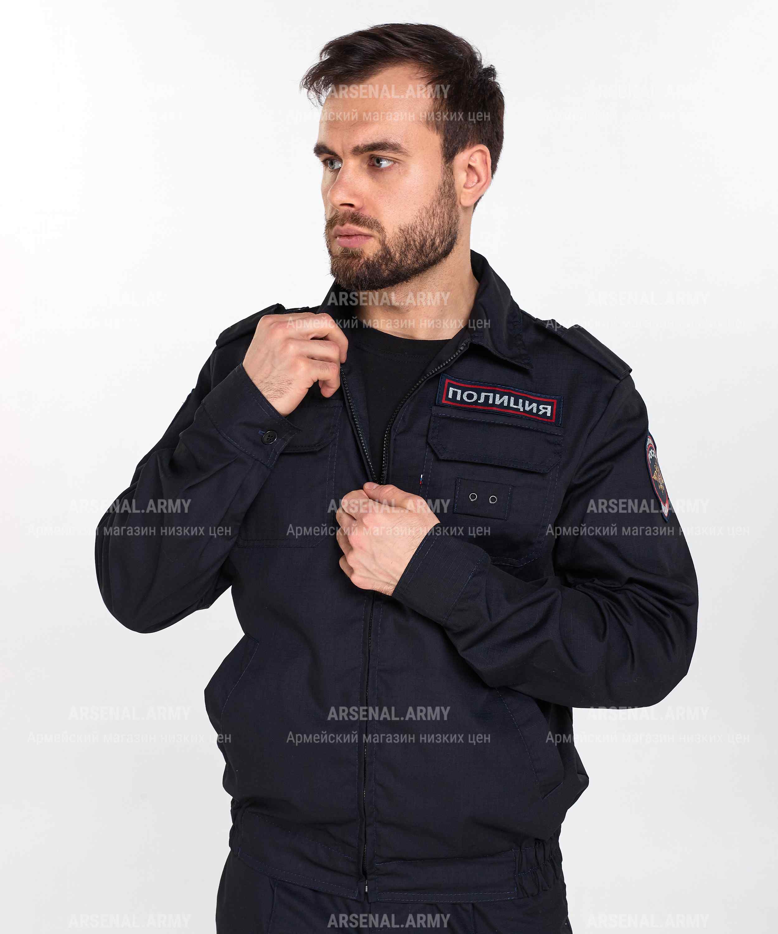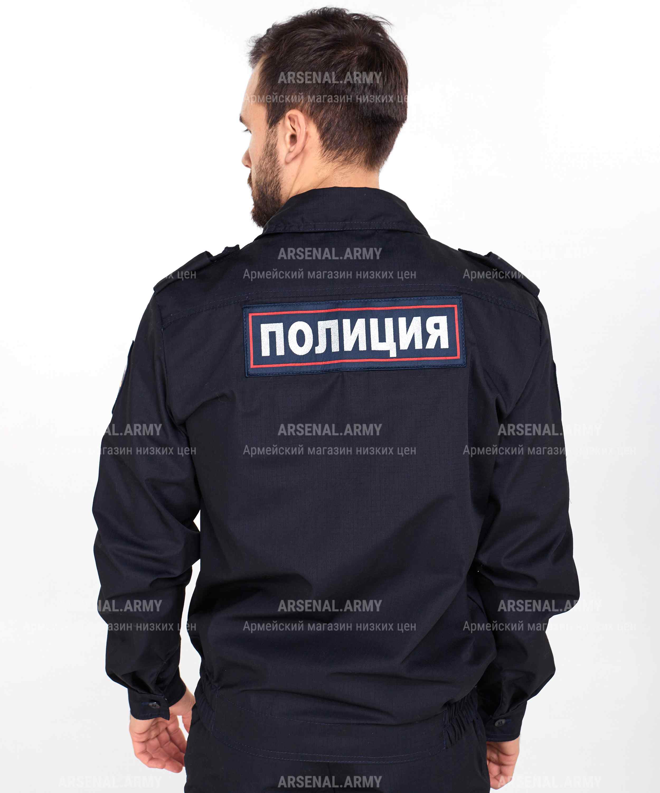 Представленный костюм изготовлен специально для работников полиции. Он выполнен из ткани «рипстоп» в темно-синем цвете. Технология «рипстоп» делает ткань более износостойкой и предотвращает ее расхождение при образовании дырки или пореза. Данный костюм, выполненный из хлопка в сочетании с синтетическим материалом, отлично подходит для лета, так как позволяется телу дышать, а также легко высыхает при намокании.