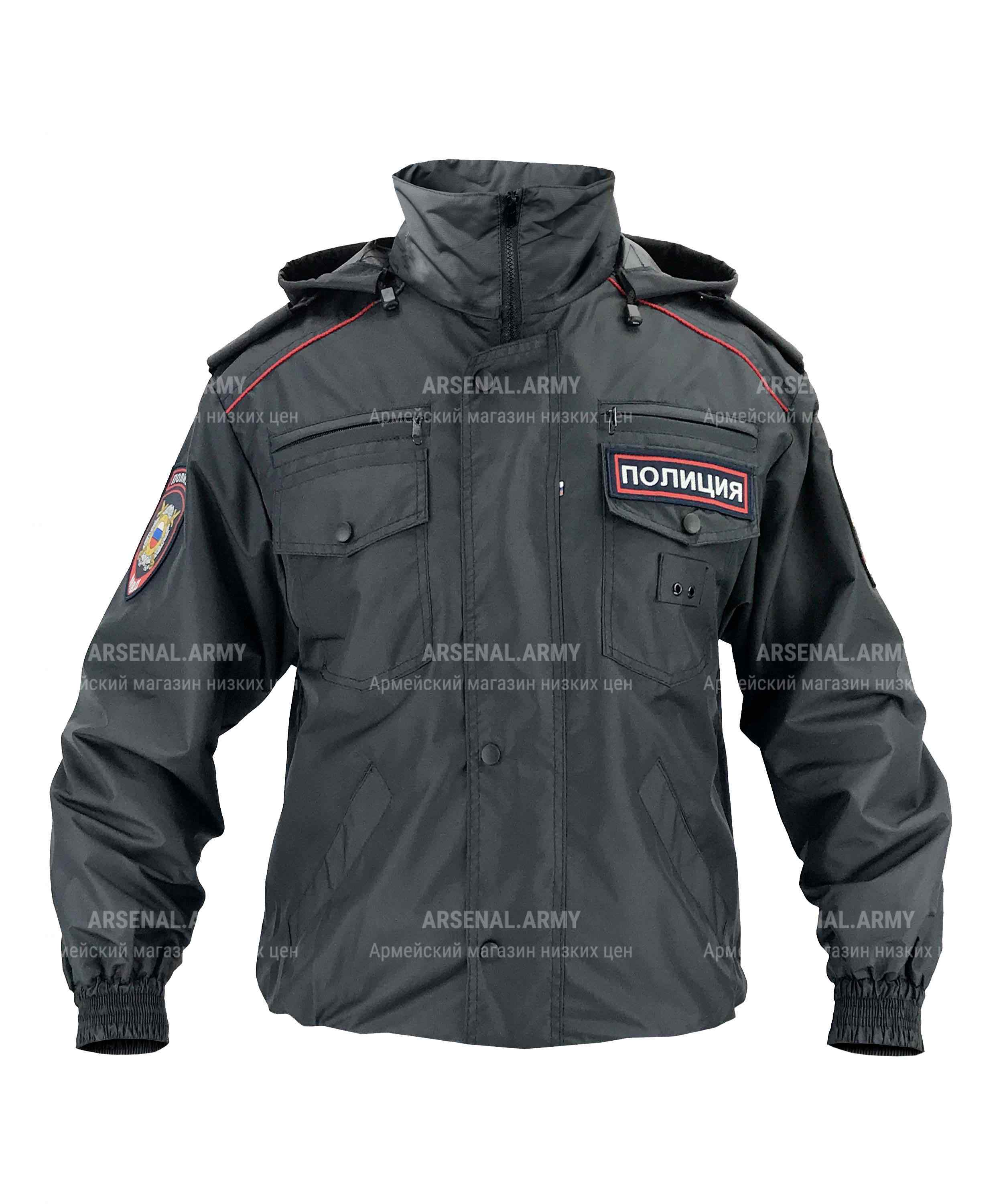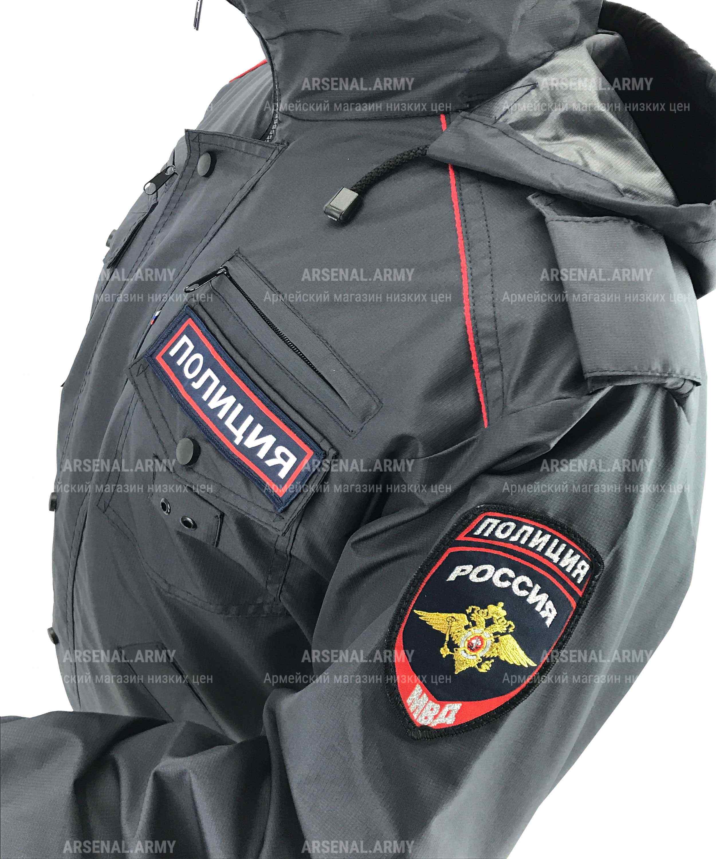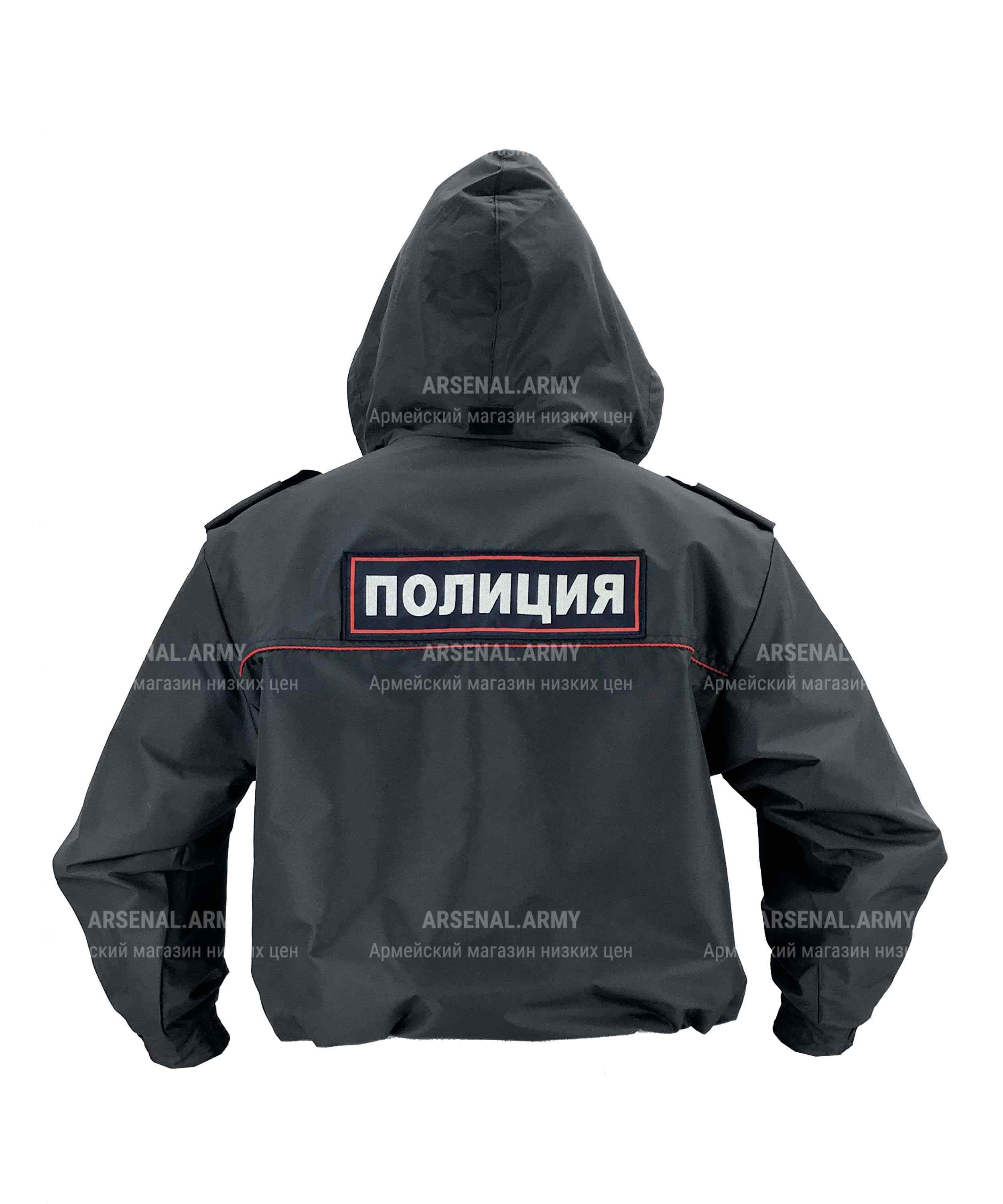 Также на данной модели присутствует капюшон, который при необходимости можно убрать, спрятав под воротник. На рукавах в районе кисти расположены резинки, а по бокам на каждом рукаве присутствуют шевроны «полиция Россия» с изображением государственного герба на левом рукаве, и щита "Общественная безопасность" - на правом. На спине - большая прямоугольная нашивка «полиция».