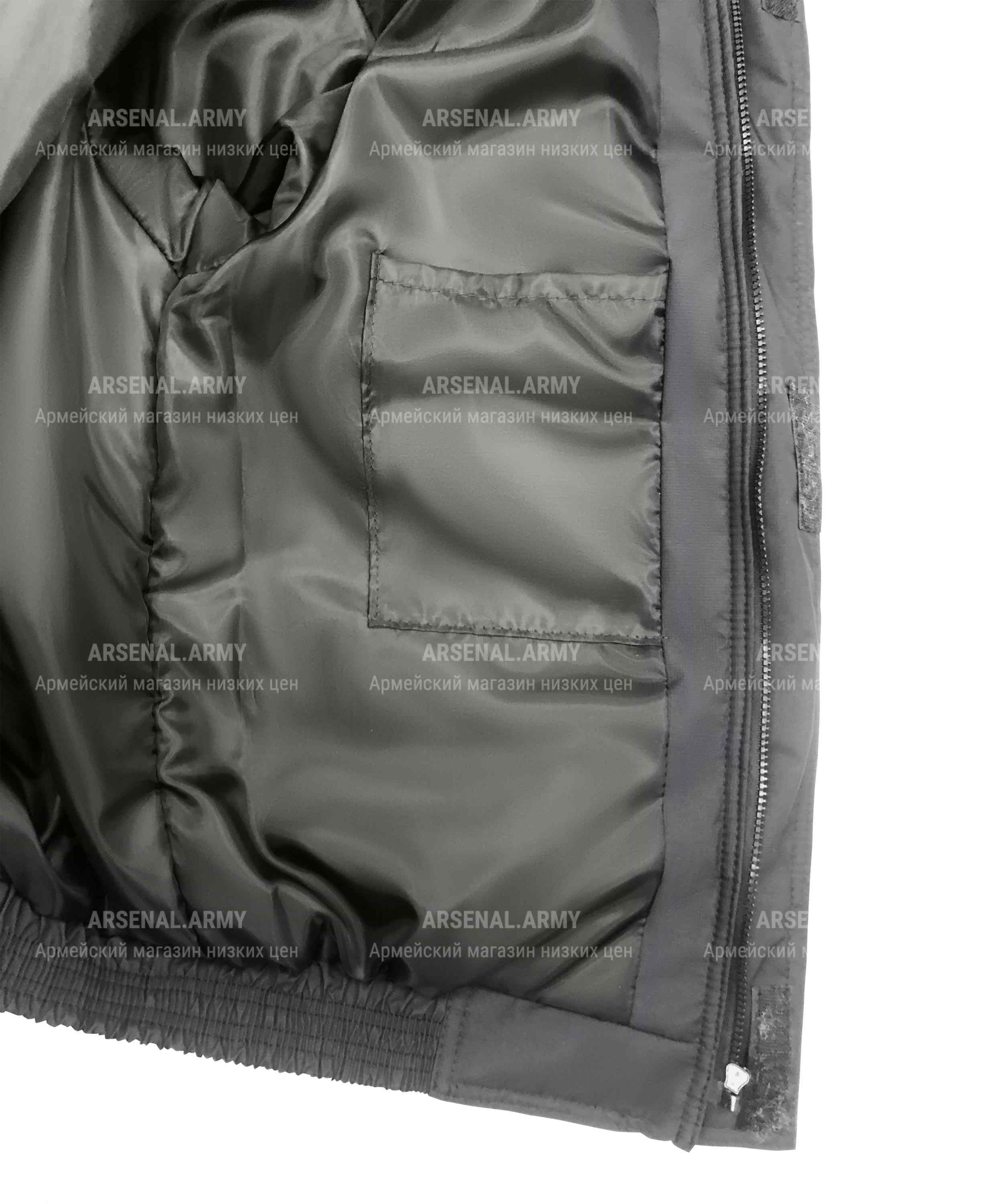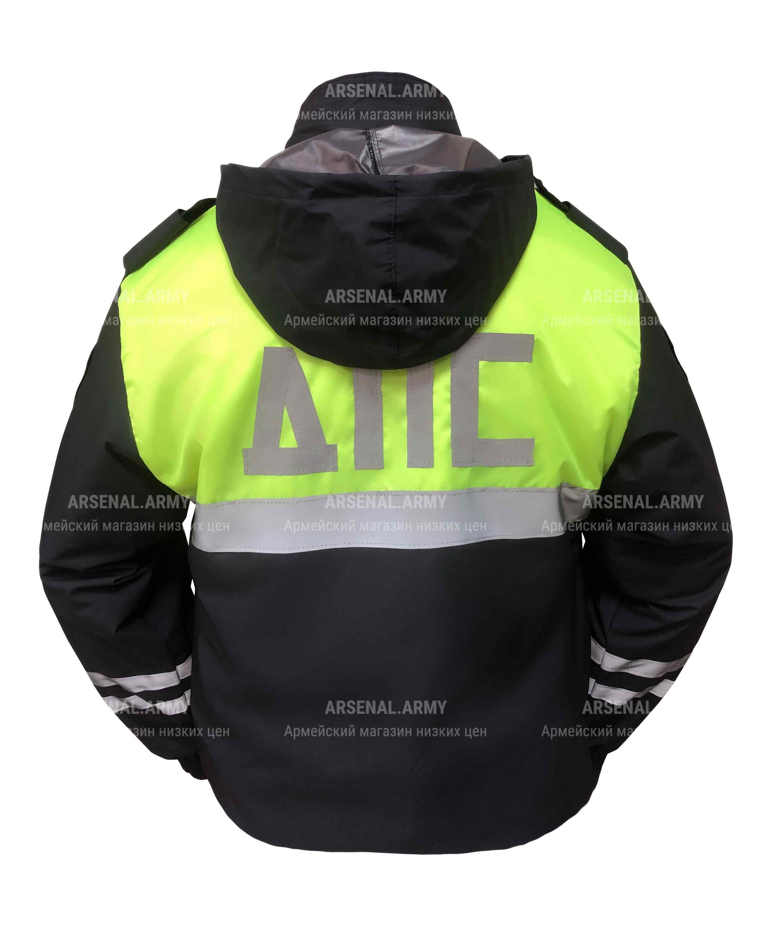 Куртка имеет капюшон, который при необходимости можно спрятать за воротник. На плечах - фальшпогоны. Предусмотрены 2 боковых врезных нижних кармана, а также 2 накладных нагрудных. Над левым - нашивка ДПС ГИБДД. На левом рукаве шеврон полиция МВД с гербом. На правом - шеврон полиция МВД с машиной. Манжеты оснащены резинкой и светоотражающими полосами.