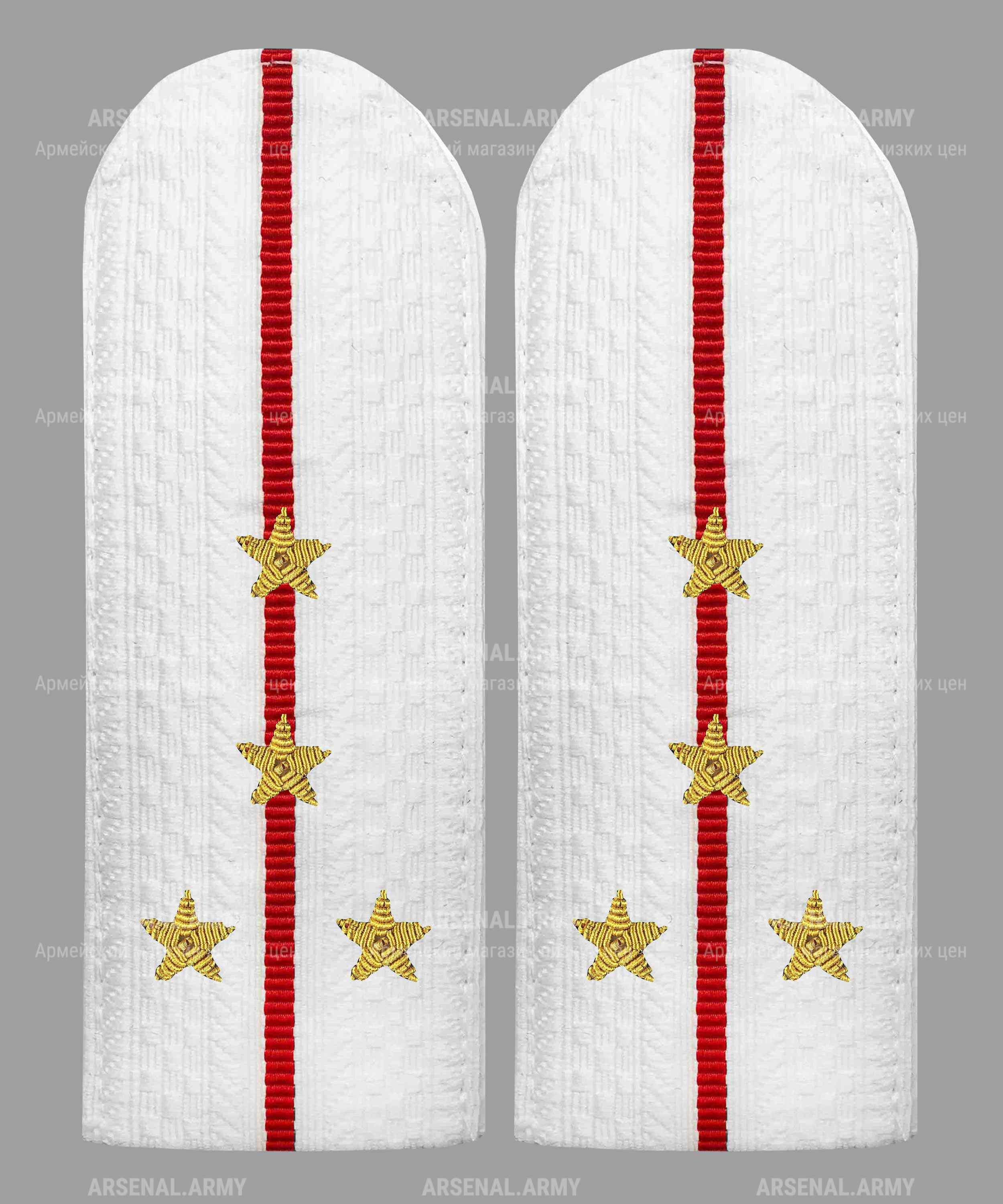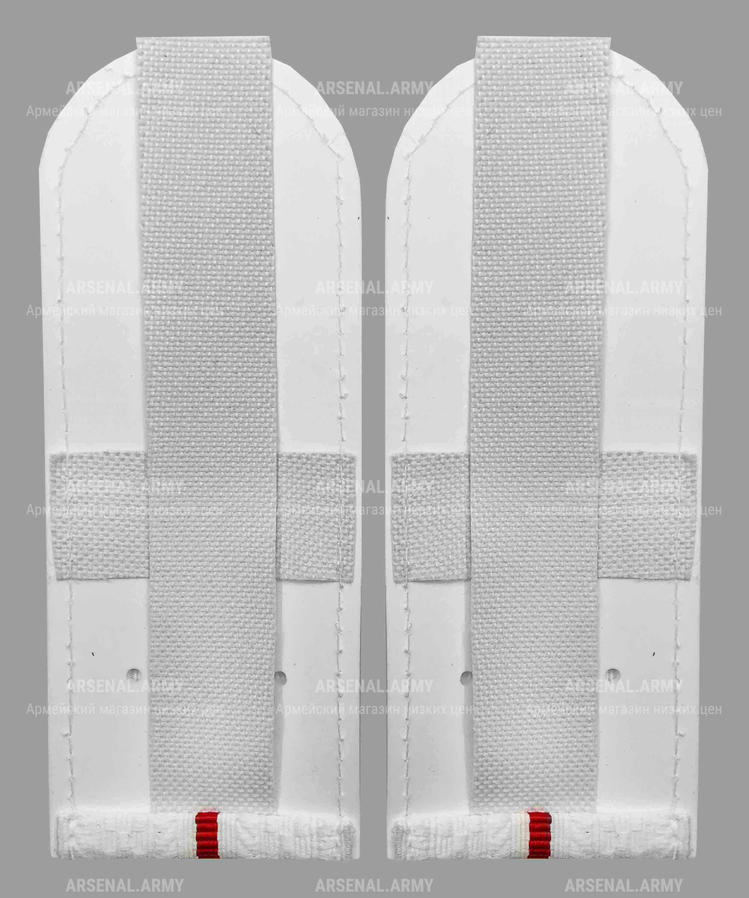 Погоны для сотрудников полиции (средний начальствующий состав) съемные белые. Предназначены для ношения на парадных рубашках белого цвета сотрудниками полиции, имеющими специальное звание среднего начальствующего состава — капитан полиции. Прямоугольные погоны с закругленным верхним краем. Нижний край — прямоугольный. Ширина стандартная — 5,0 см. Съемные (предназначены для рубашек, крепятся на пуговицу и через шлевку на плече). На погоне имеется один продольный просвет красного цвета. Знаки различия (звезды): Четыре вышитые золотой канителью звезды. Две звезды расположены в нижней части погона по бокам от просвета (на одной горизонтальной линии, симметрично относительно центра). Две звезды расположены выше, на просвете.