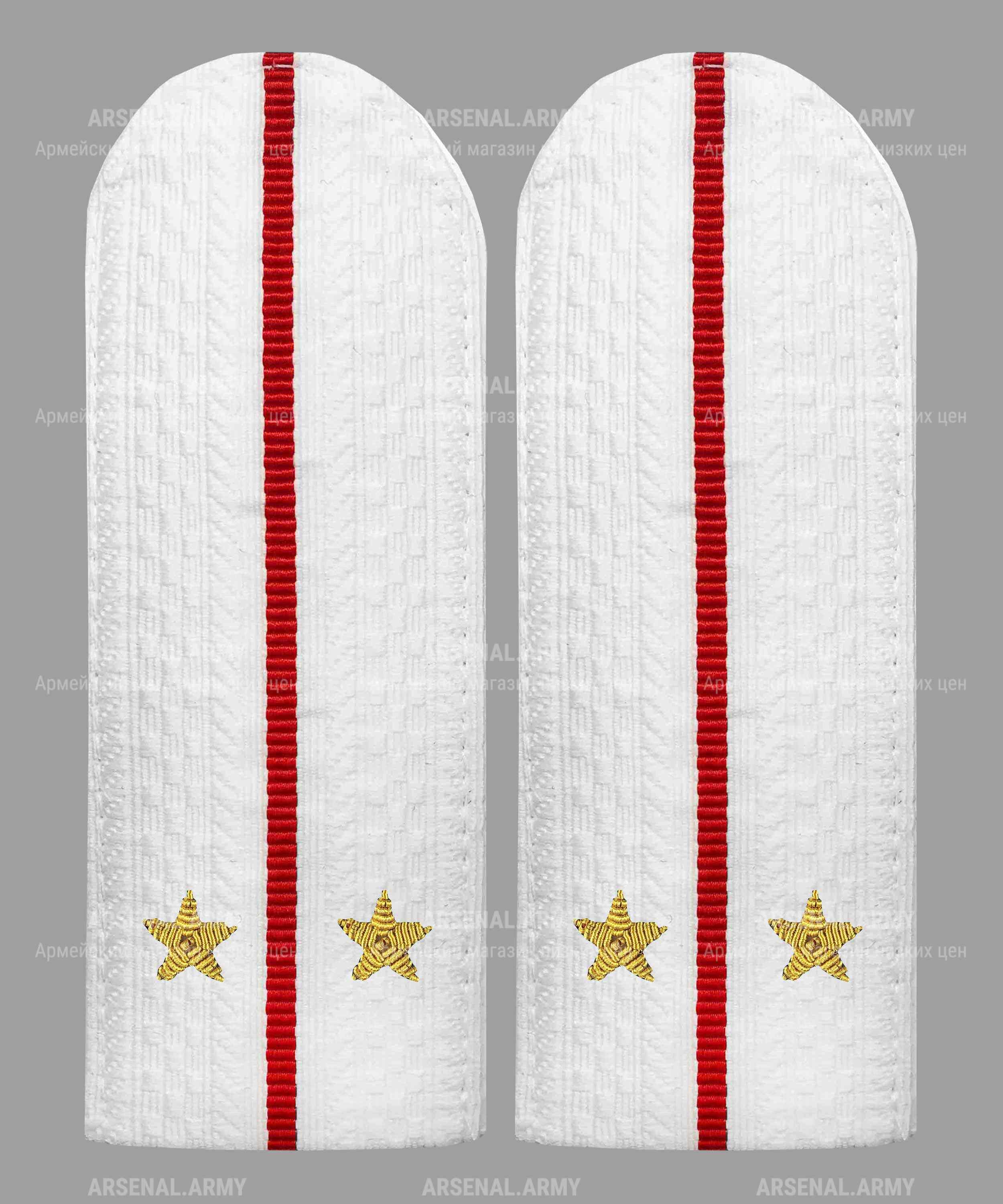 Погоны для сотрудников полиции (средний начальствующий состав) съемные белые. Предназначены для ношения на парадных рубашках белого цвета сотрудниками полиции, имеющими специальное звание среднего начальствующего состава — лейтенант полиции. Прямоугольные погоны с закругленным верхним краем. Нижний край — прямоугольный. Ширина стандартная — 5,0 см. Съемные (предназначены для рубашек, крепятся на пуговицу и через шлевку на плече). На погоне имеется один продольный просвет красного цвета. Знаки различия (звезды): Две вышитые золотой канителью звезды, расположены в нижней части погона по бокам от просвета (на одной горизонтальной линии, симметрично относительно центра).