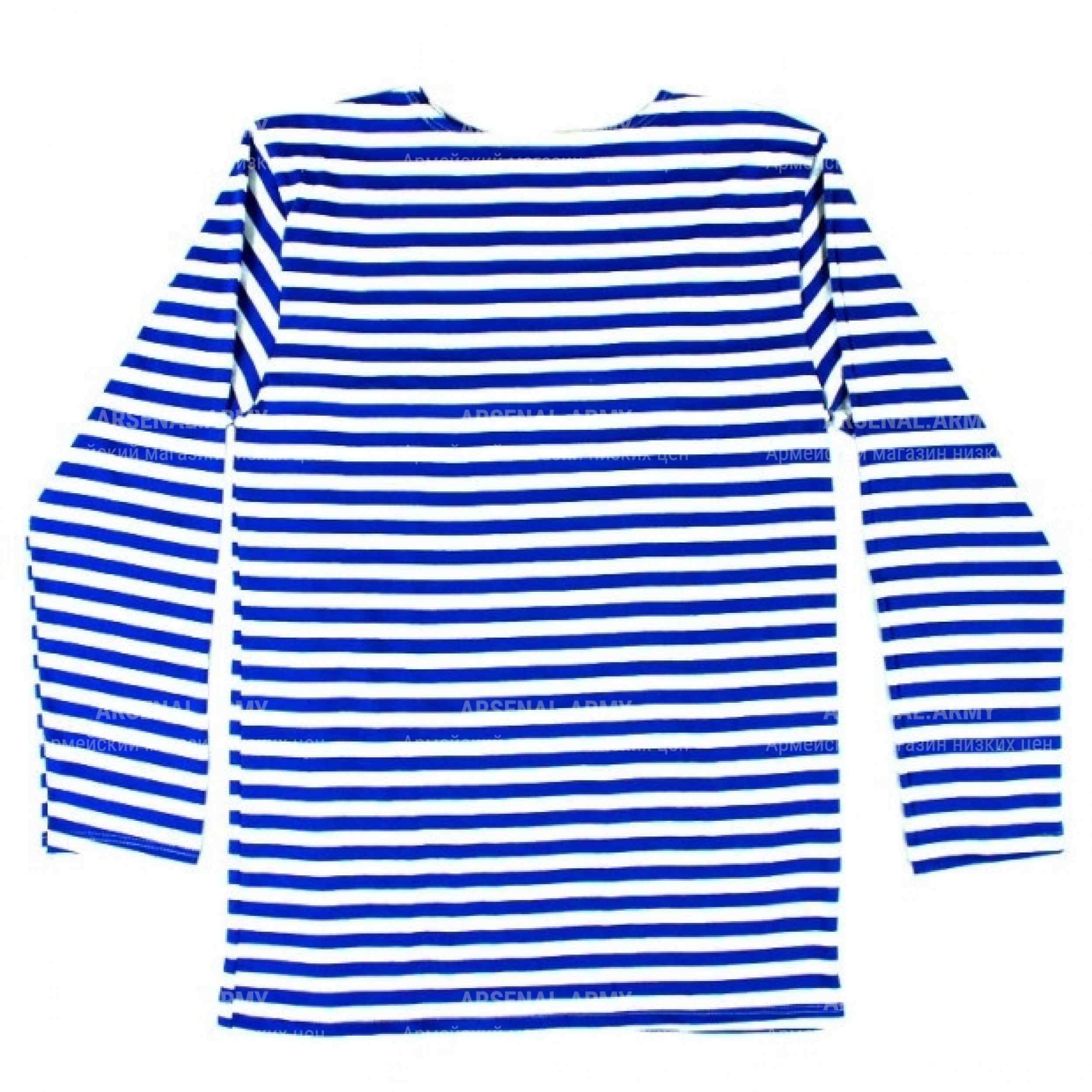 Изделие пошито из высококачественной трикотажной ткани (100% хлопок),легко чистящейся и стирающейся, не вызывающей кожные раздражения. Такую тельняшку удобно носить и в качестве белья под рубашку или свитер, а также вместо обычной футболки. Расцветка – чередующиеся горизонтальные голубые и белые полоски. Швы аккуратные, прошитые прочной нитью по два раза.