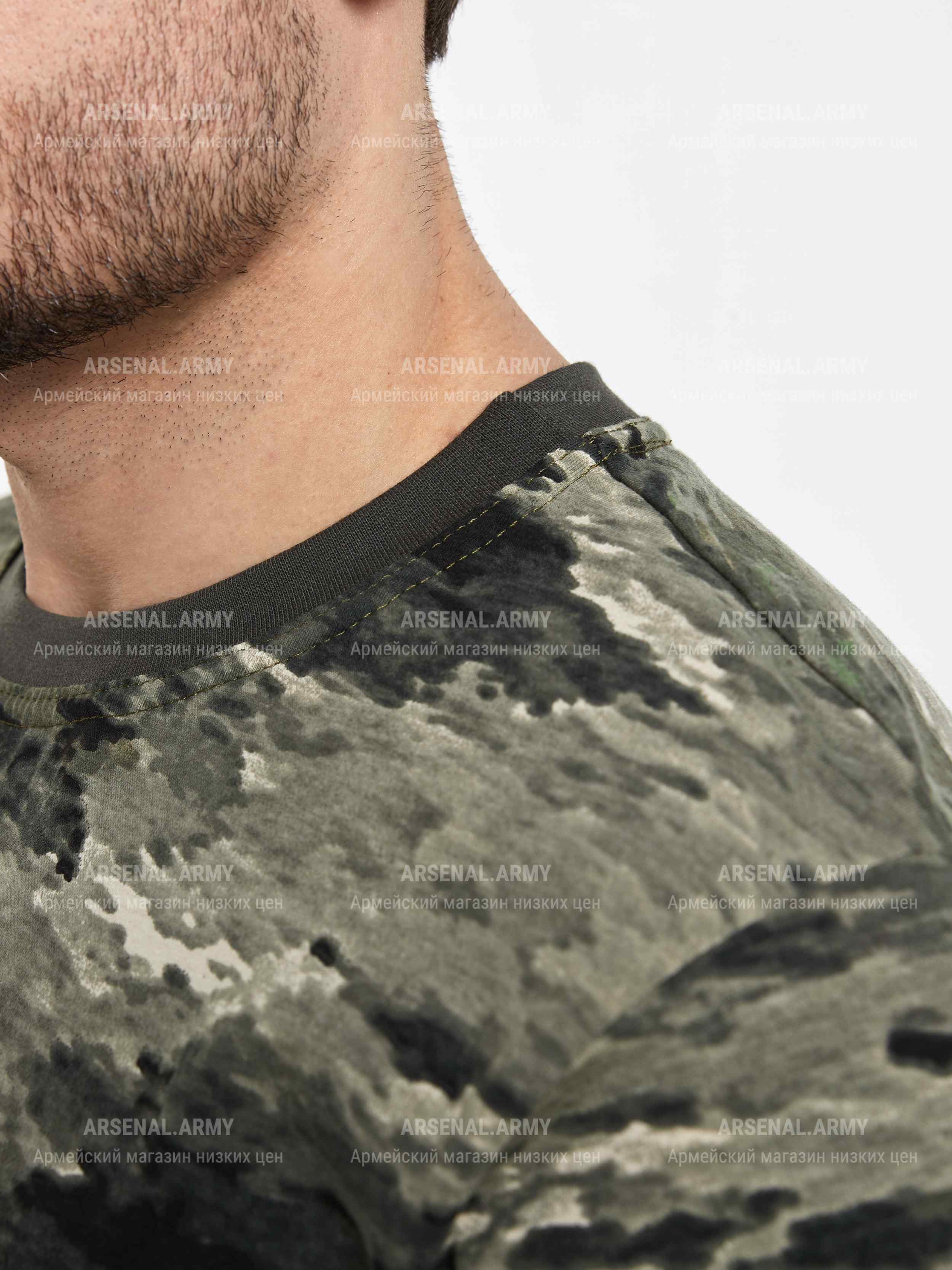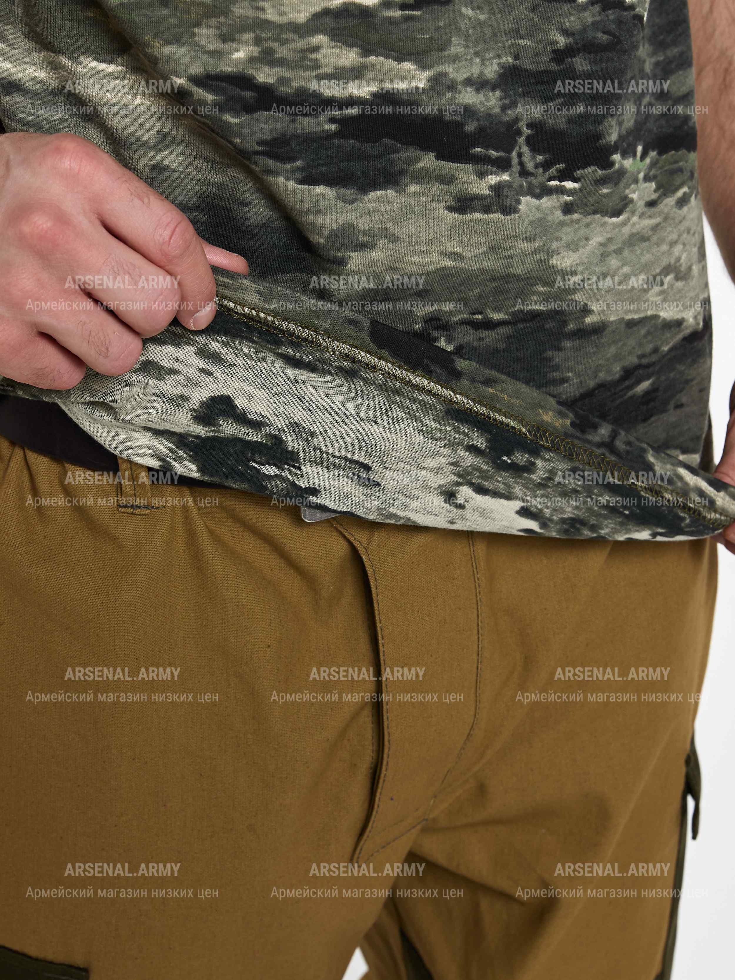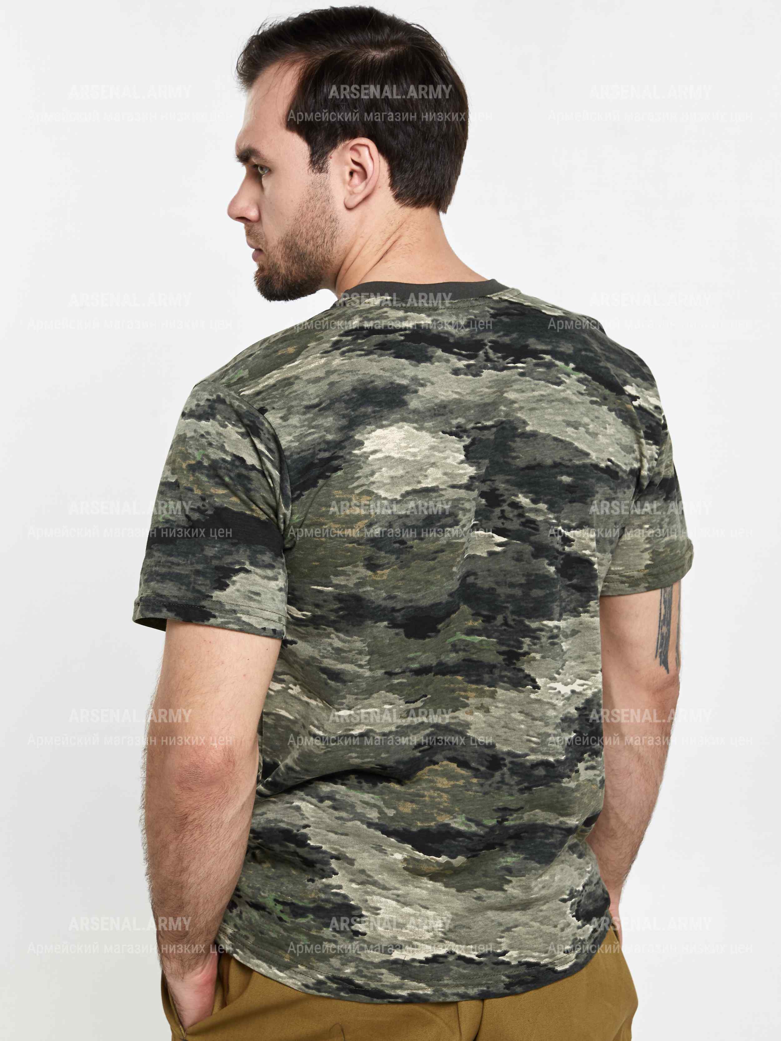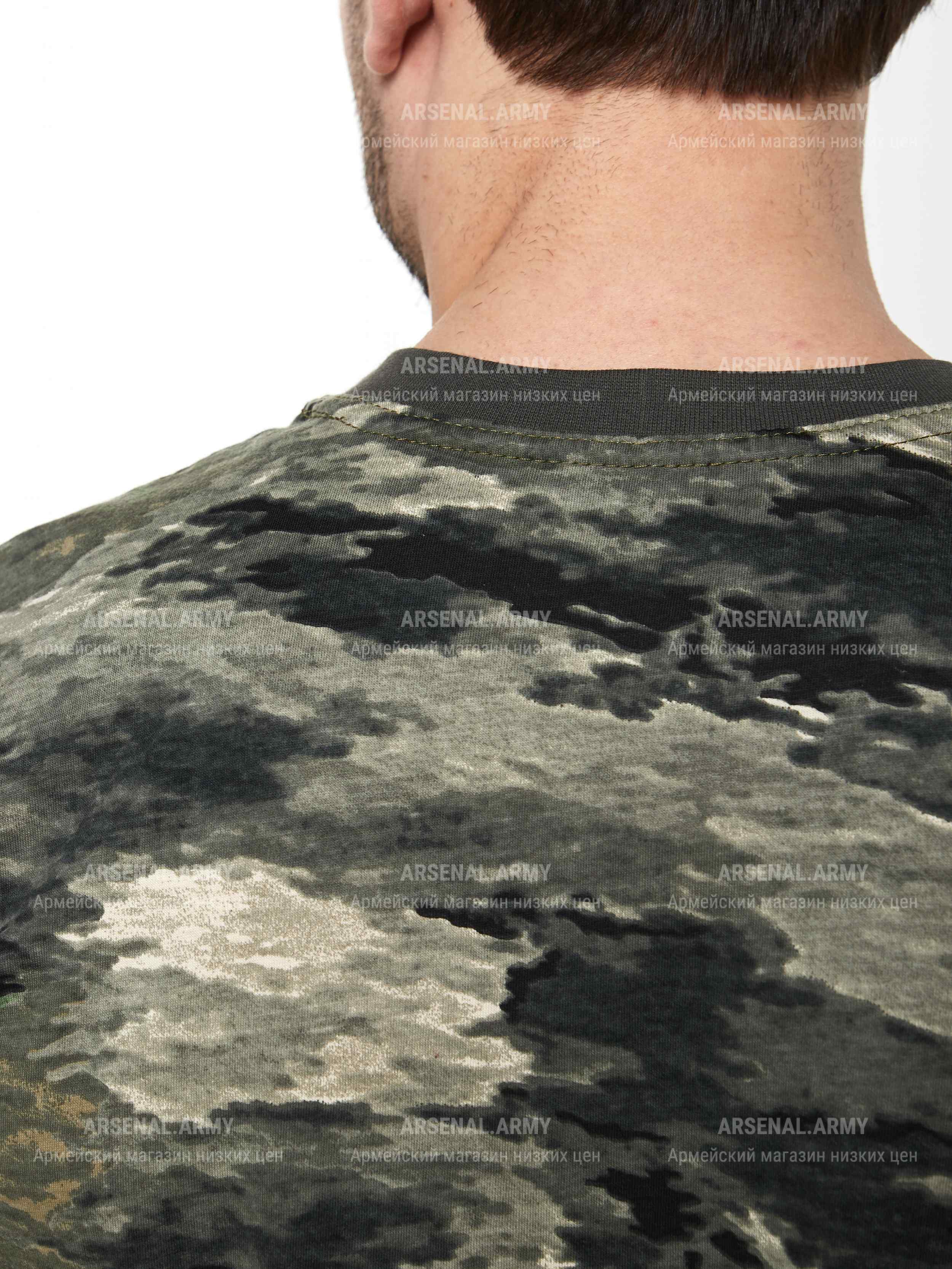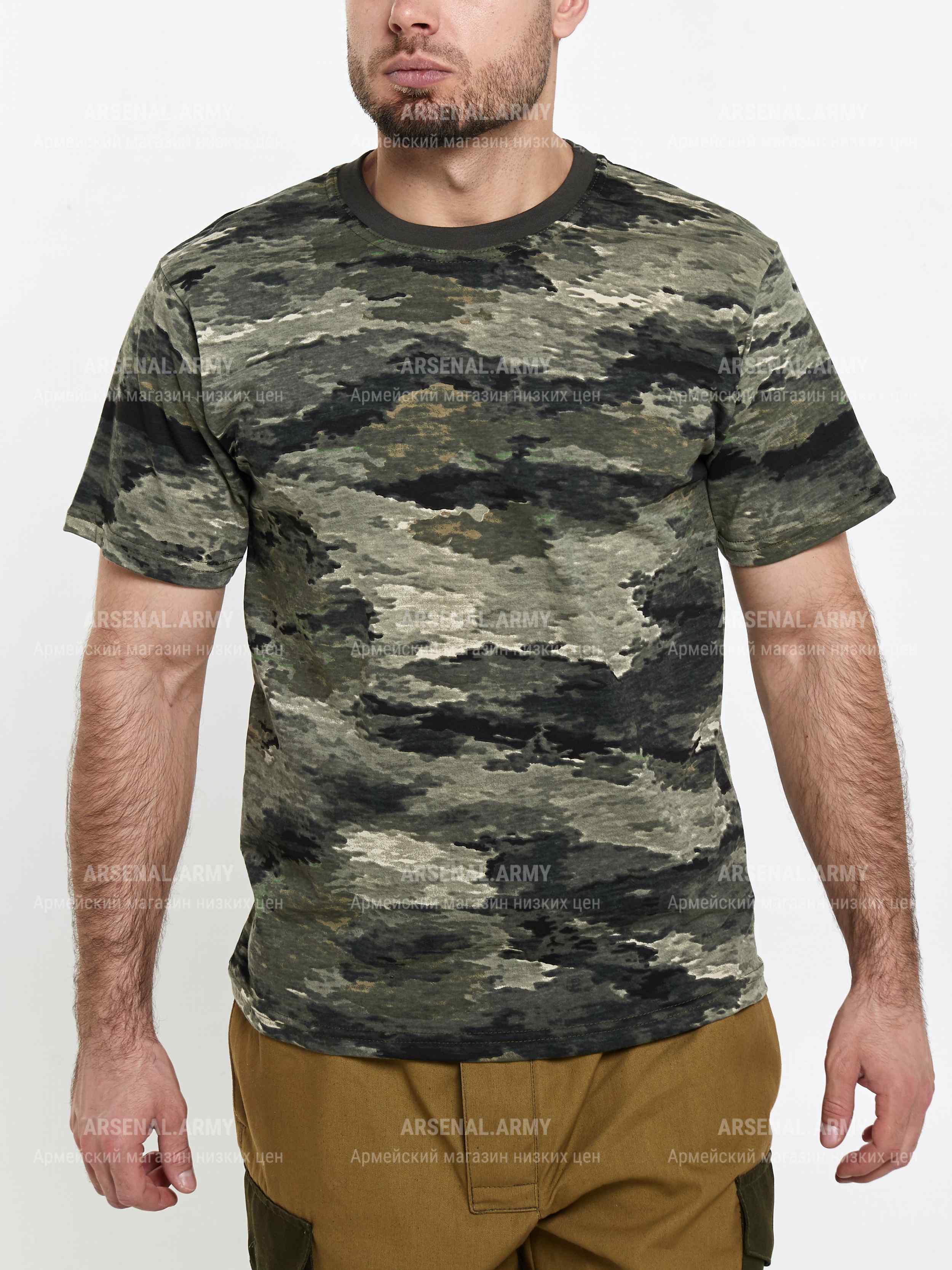 Трикотажная футболка тигровой камуфляжной расцветки подойдет как работникам силовых структур, так и любителям стиля милитари. Ткань выполнена из 100% хлопка.