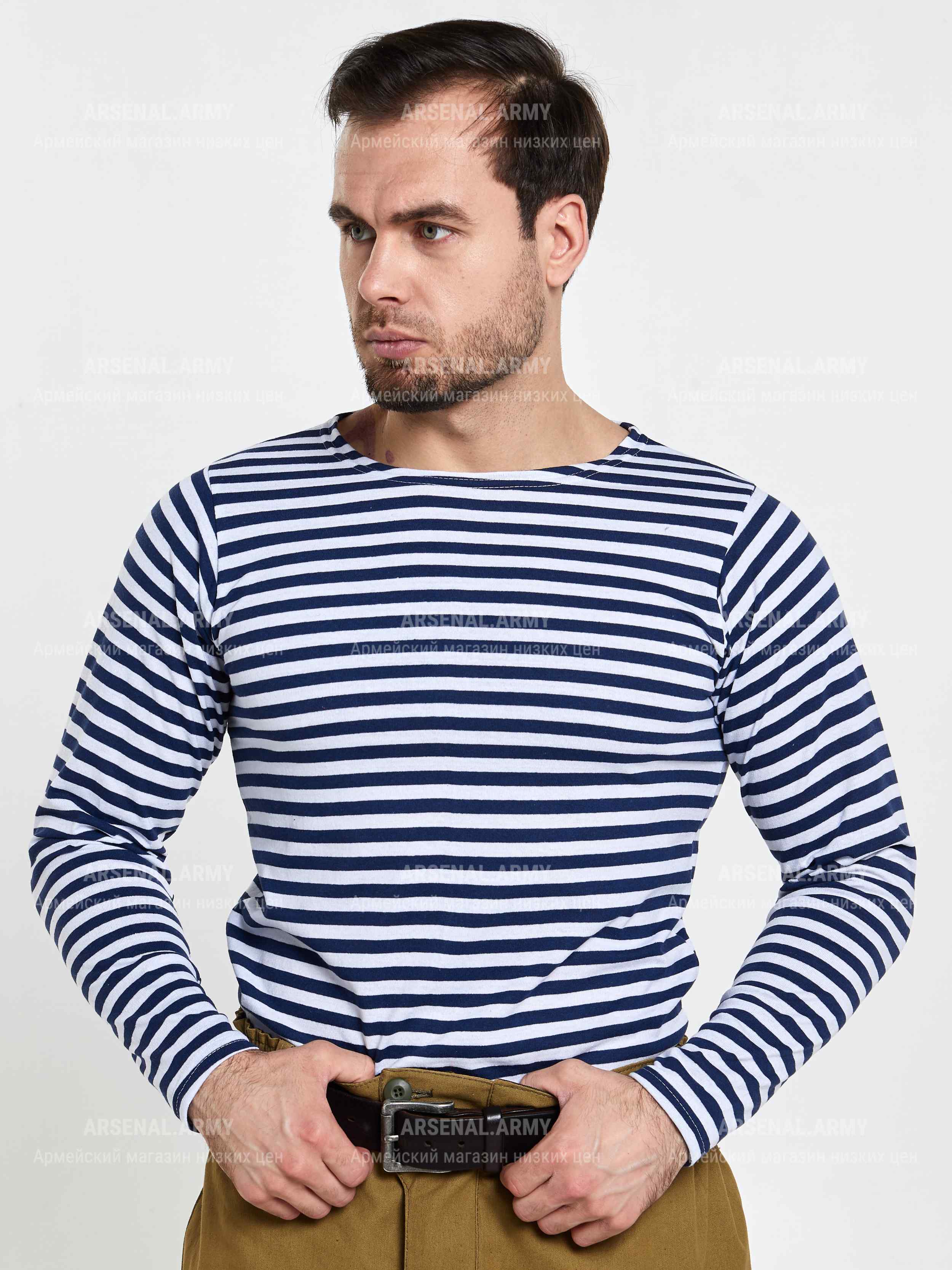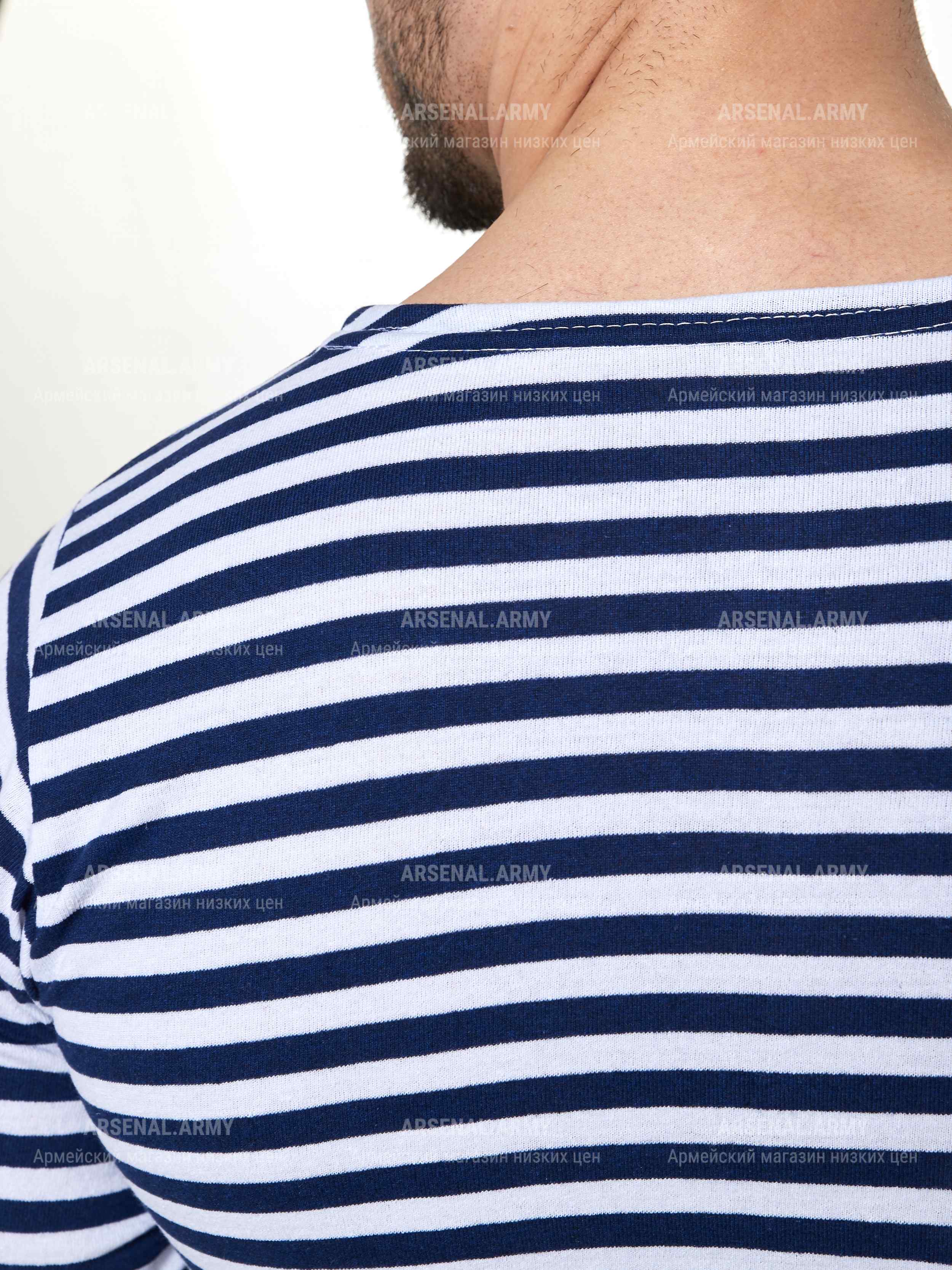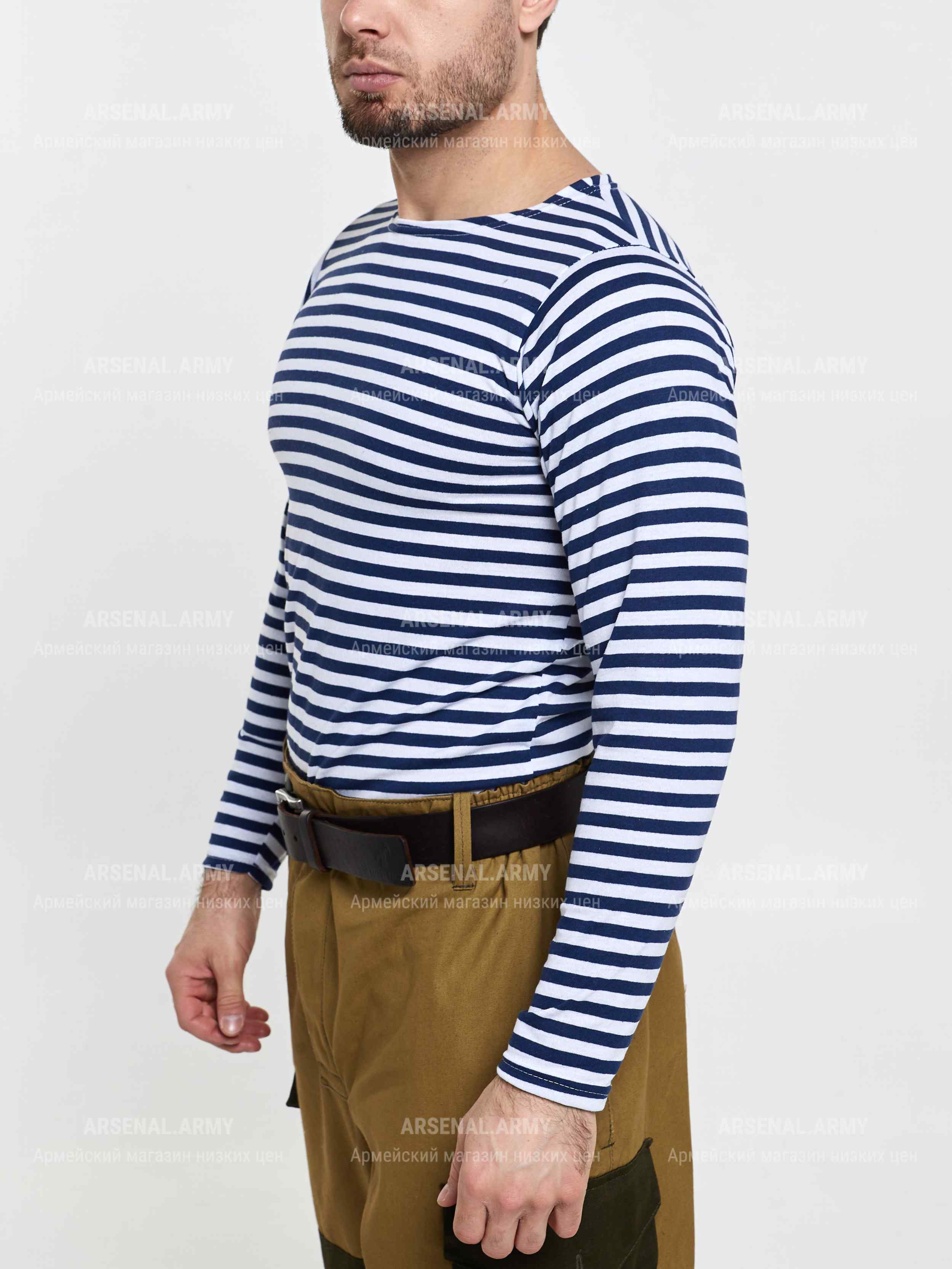 Тельняшка обладает прочной вязкой полотна и плотной фактурой трикотажа, что обеспечивает долговечность изделия при частой носке и стирке.
