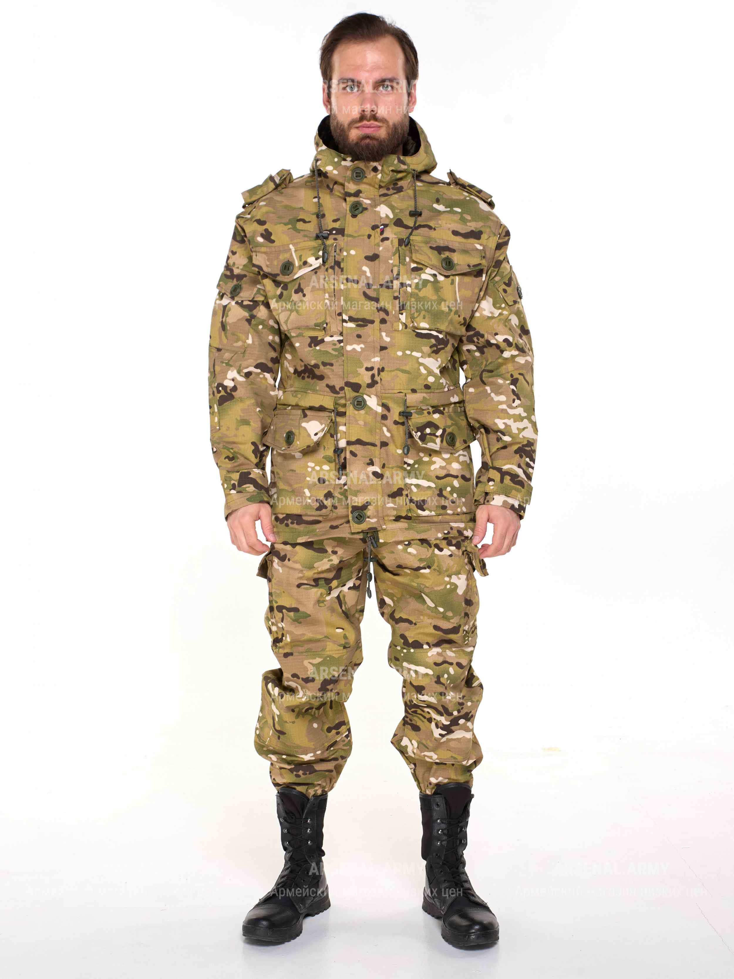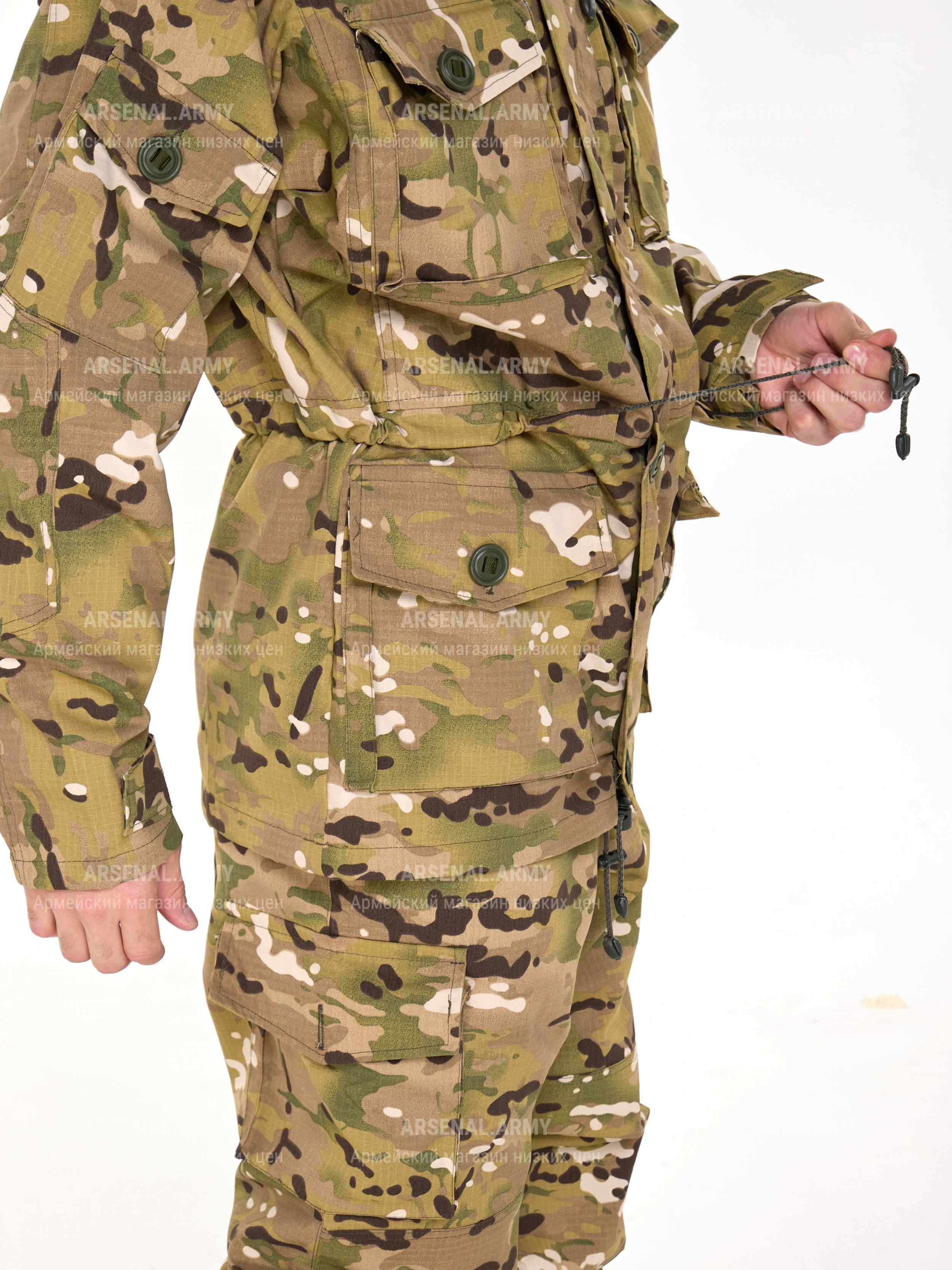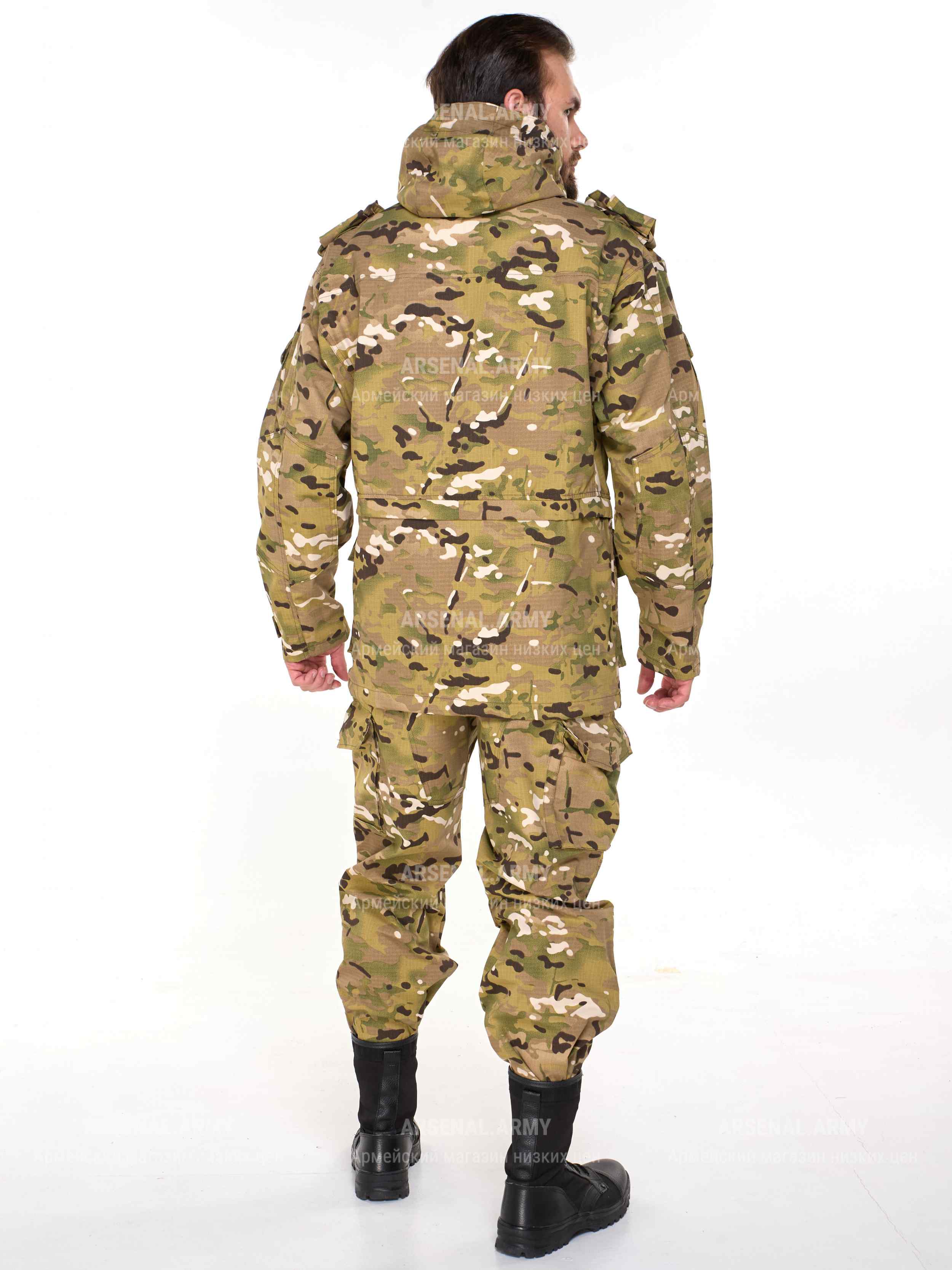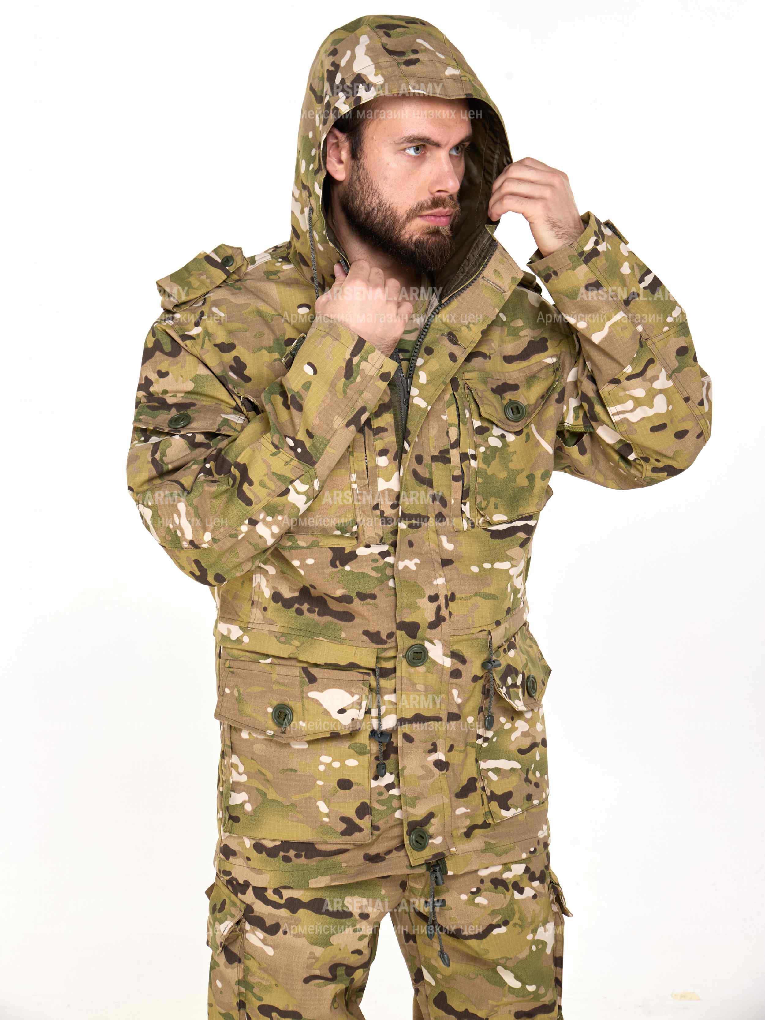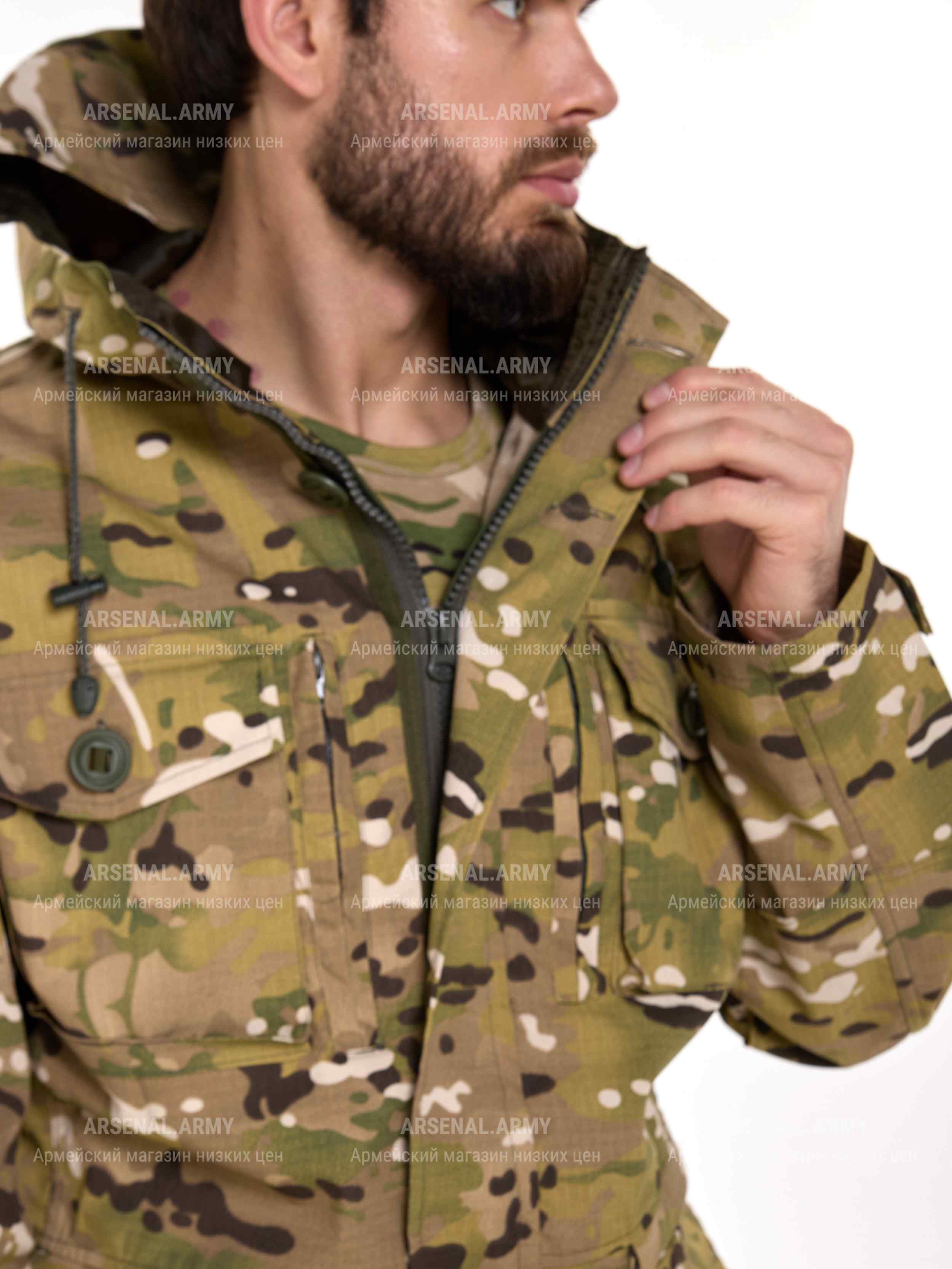 Верх костюма выполнен в виде куртки, которая застегивается на молнию закрытую вертикальной планкой застегивающейся на пуговицы , что обеспечивает надежную защиту от ветра и дождя. Так же у куртки имеются накладные боковые карманы. карманы на груди и на рукавах в районе локтя. Закрывающимися карманы на пуговицы и обеспечивают комфорт при использовании костюма. На плечах присутствуют фальшпогоны. Несъемный капюшон и высокий воротник обеспечат повышенную защиту от ветра и дождя. Так же в районе талии по бокам и по низу куртки имеется фиксированные кулиски.