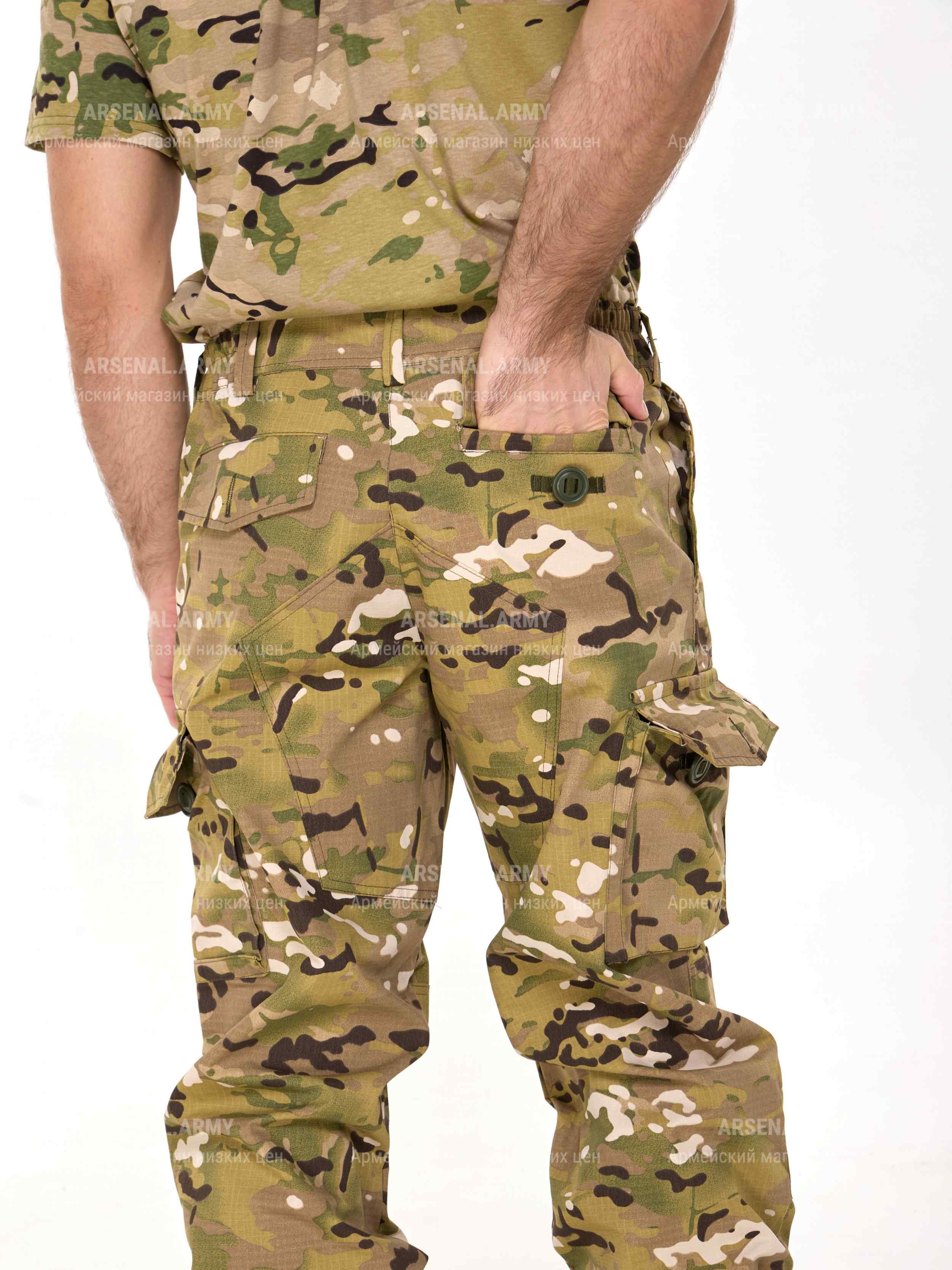 Брюки костюма прямого кроя застегиваются на молнию и пуговицу. По бокам открытые карманы, в районе колен так же имеются накладные карманы с застежкой в виде пуговиц. По низу штанин имеются шнурки для утяжки.