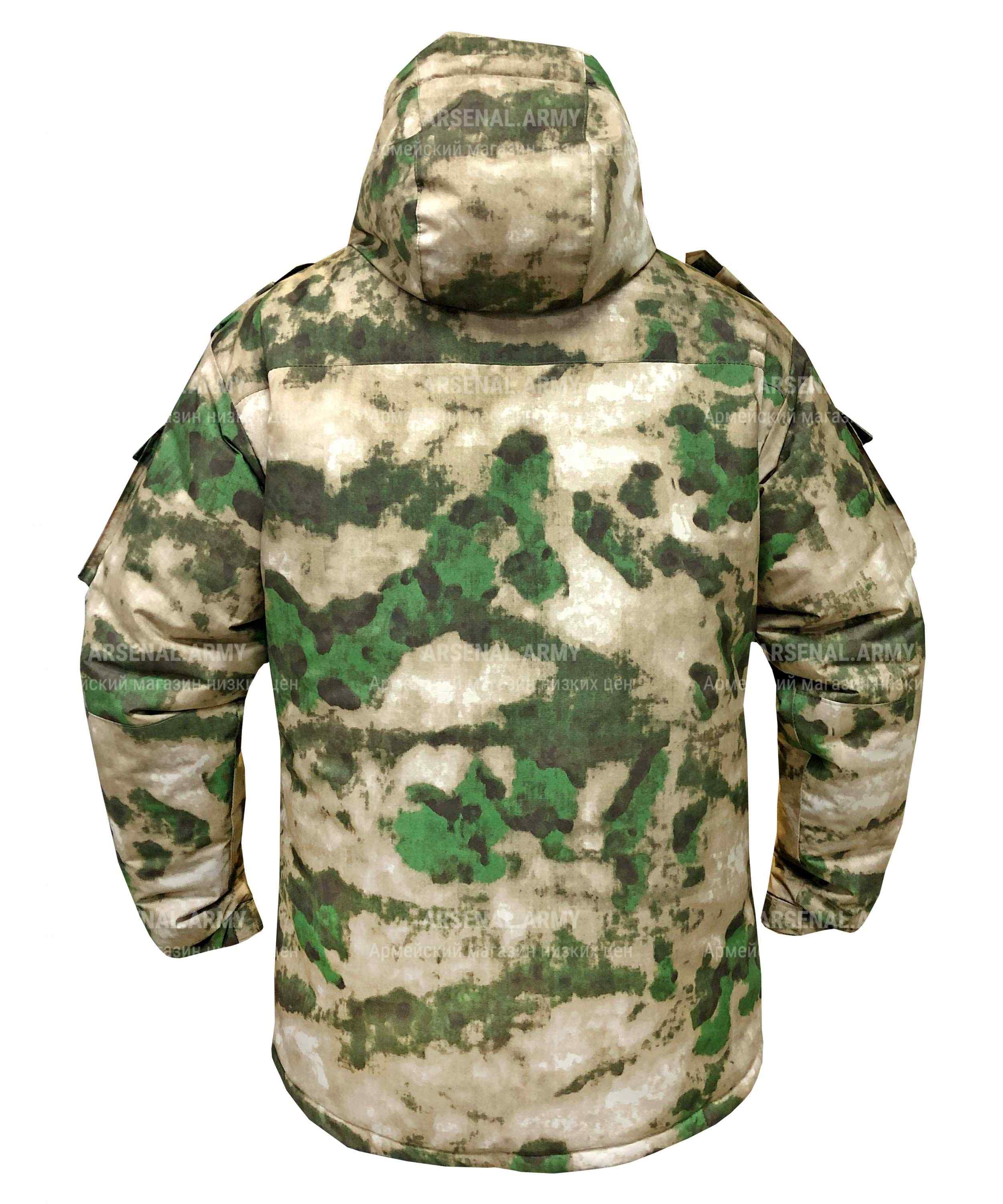 Куртка выполнена в расцветке "мох" зелёного и бежевого оттенков. Имеет прямой удлинённый покрой и подобие внутренней юбки на липучке, что позволяет не пропускать холод и осадки. Утеплённый флисом капюшон, утягивающийся по размеру, защищает лицо и шею от ветра, снега и дождя.