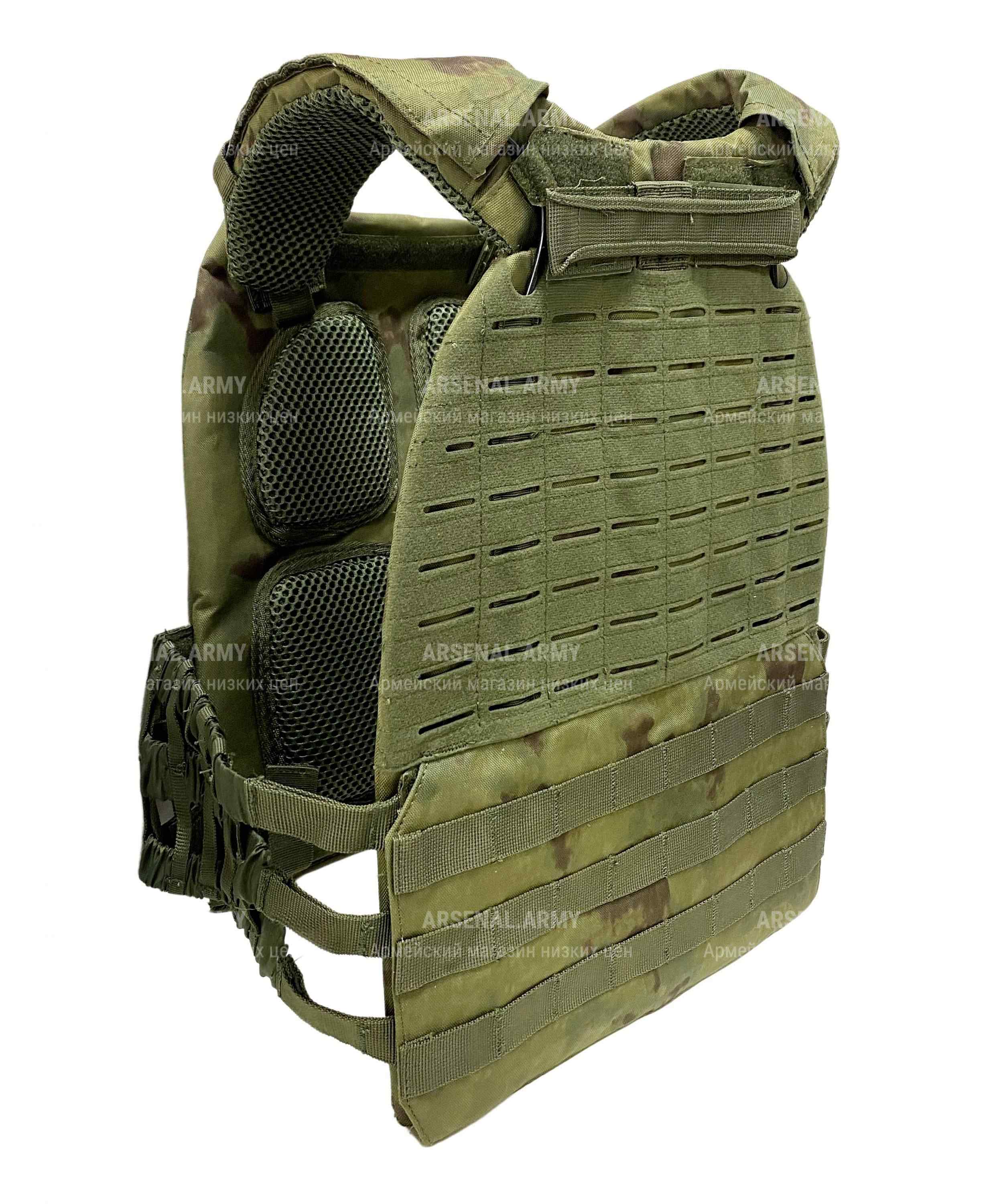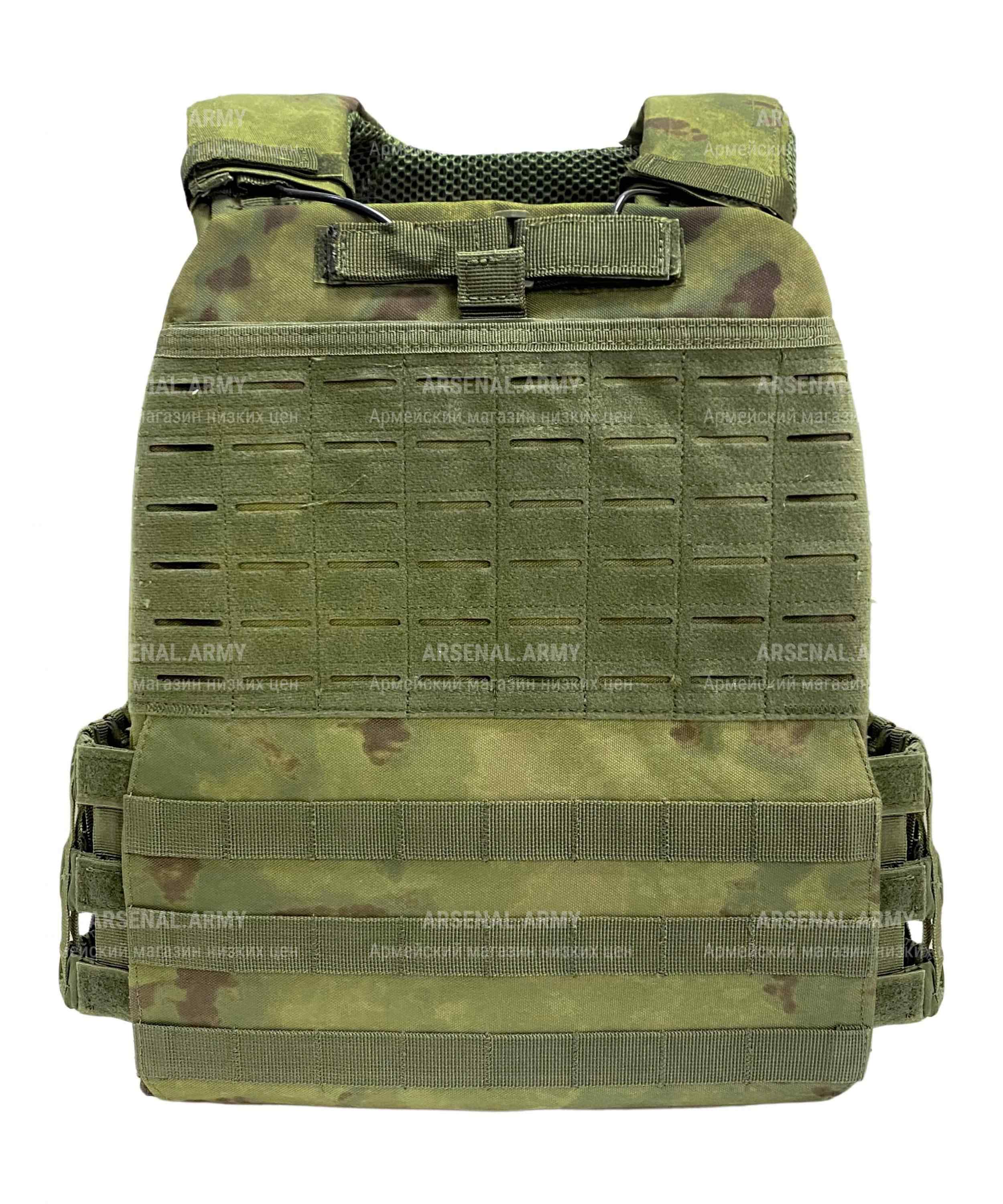 Разгрузка представлена в оливковом цвете. Регулировка размера осуществляется на лямках с помощью липучки. На груди расположена планка из липучки для нашивок или шевронов. В области живота имеется большой во всю ширину потайной карман. К нему пристёгнуты ремешки для фиксации дополнительных отделений и амуниции.