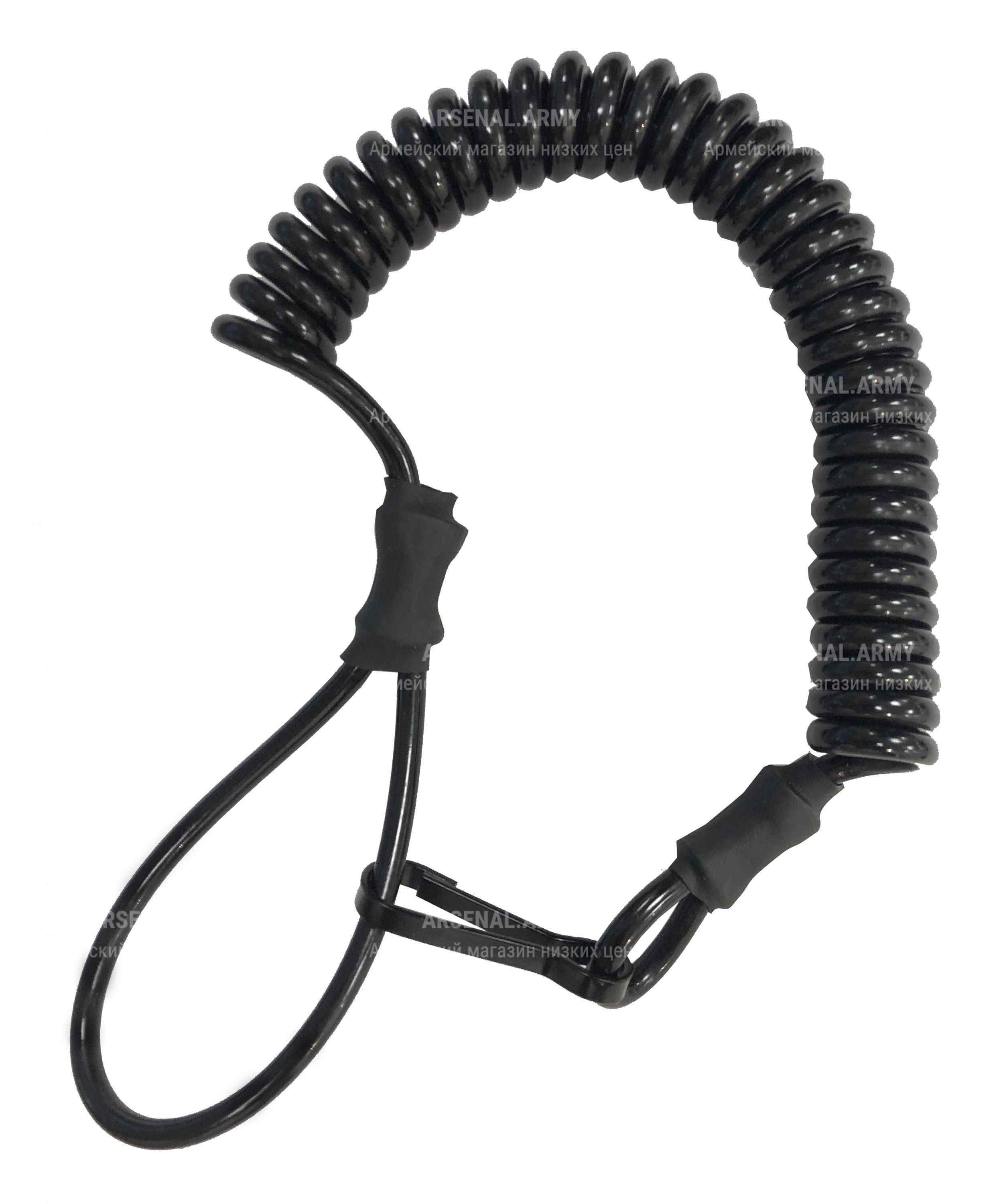 Прорезиненный металлический страховочный тросик в виде спирали предназначен для закрепления оружия или иных небольших предметов. Его можно зацепить за ремень, рюкзак посредством карабина. Он позволит избежать риска случайной утери пистолета/автомата или иной ценной в экстремальных условиях вещи. Трос обладает высокой прочностью, позволяющей выдерживать нагрузки до 15 кг.