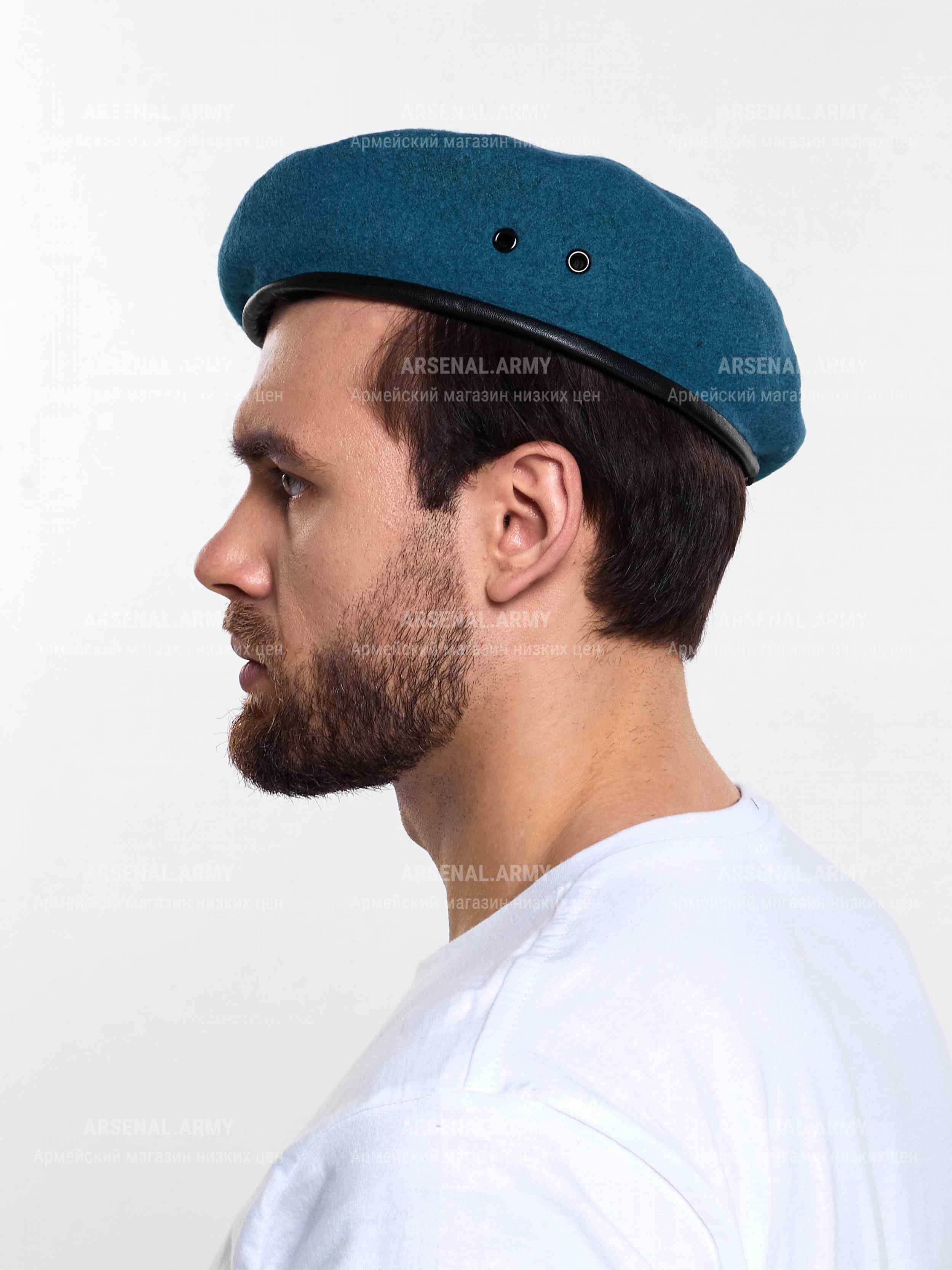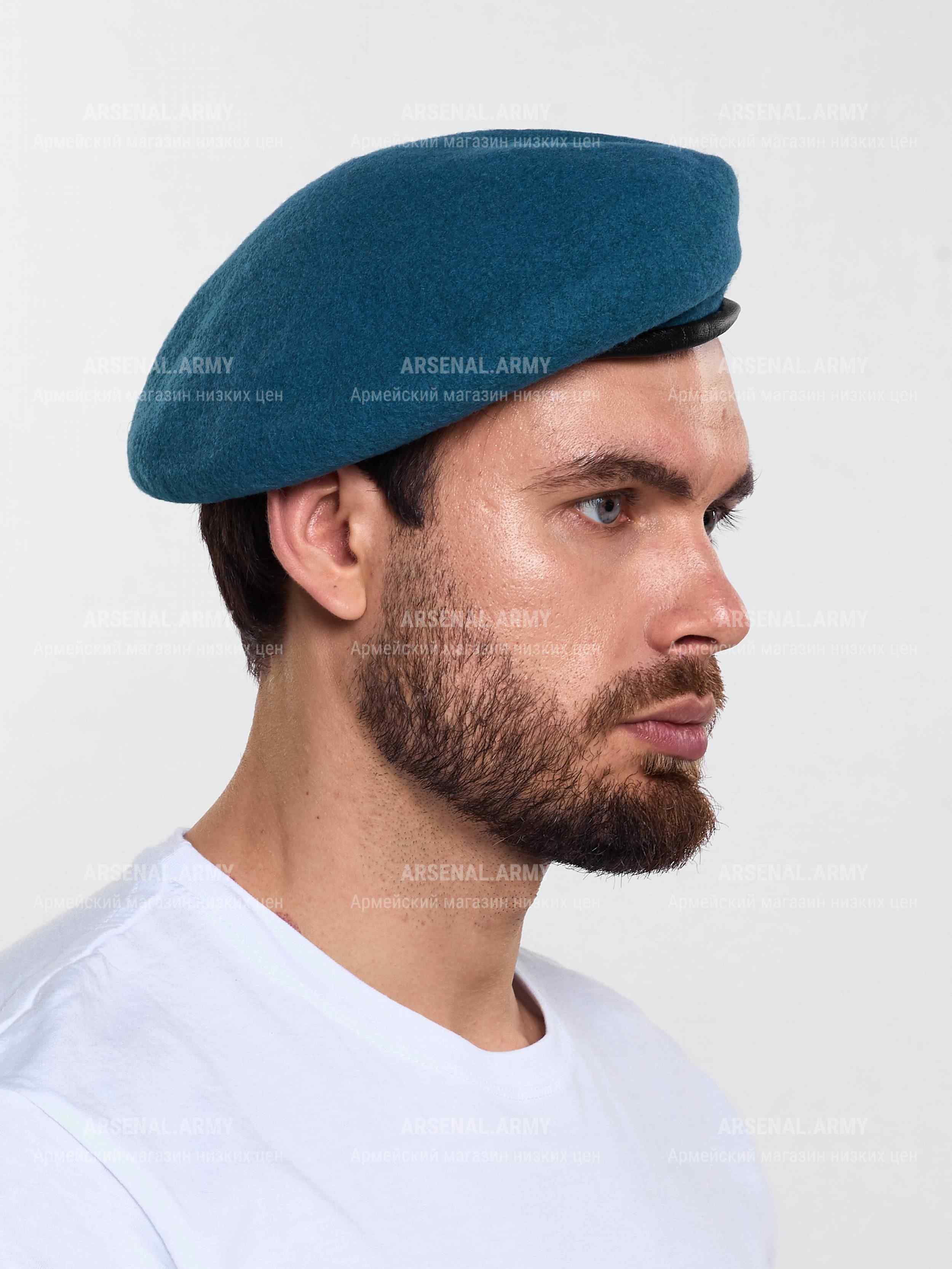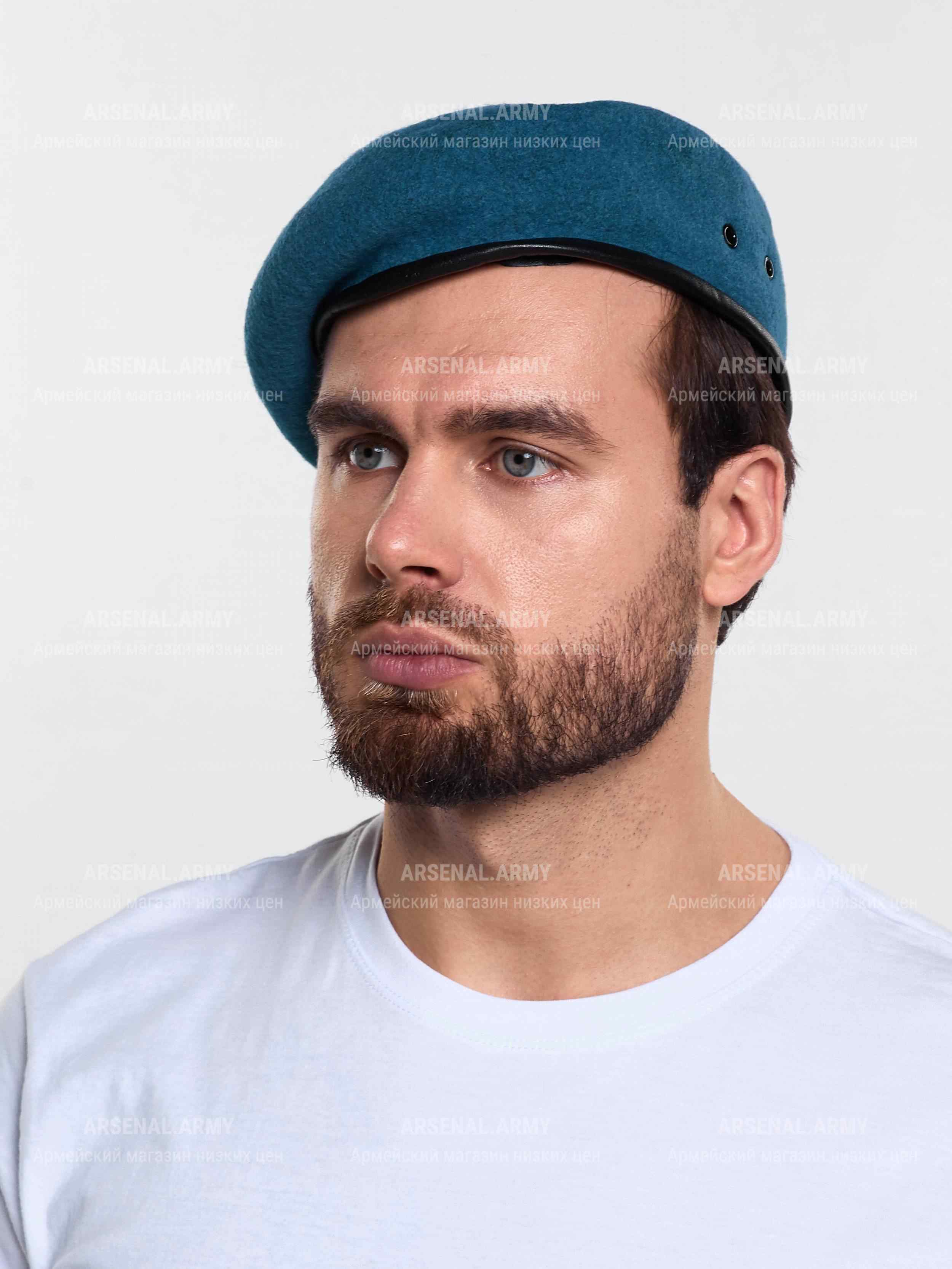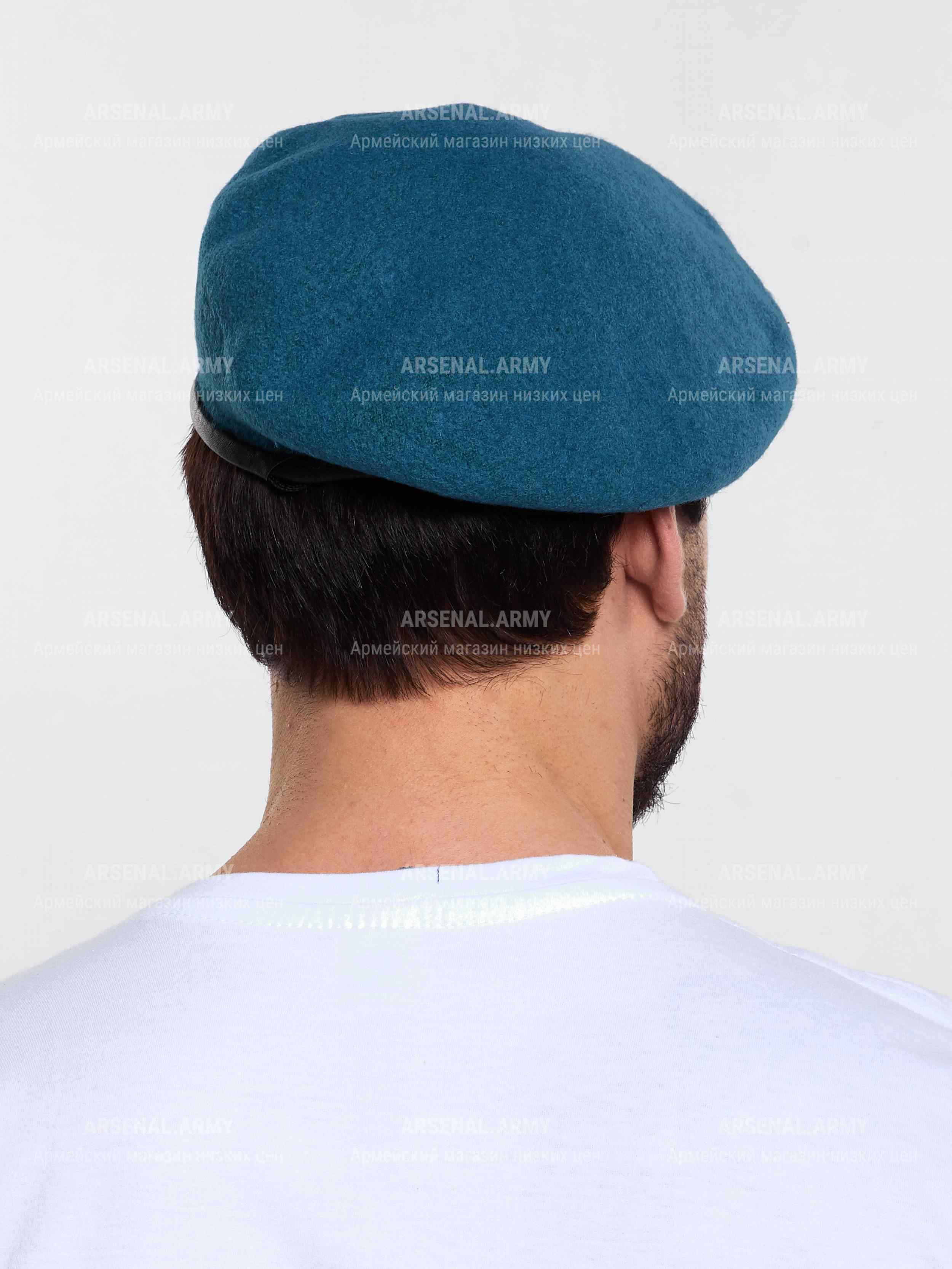 Берет изготавливается по бесшовной технологии. Материал изготовления – натуральная шерсть. Цвет – только уставной голубой. Нижняя часть окантована вставкой из кожи, внутри которой расположен стяжной шнурок.