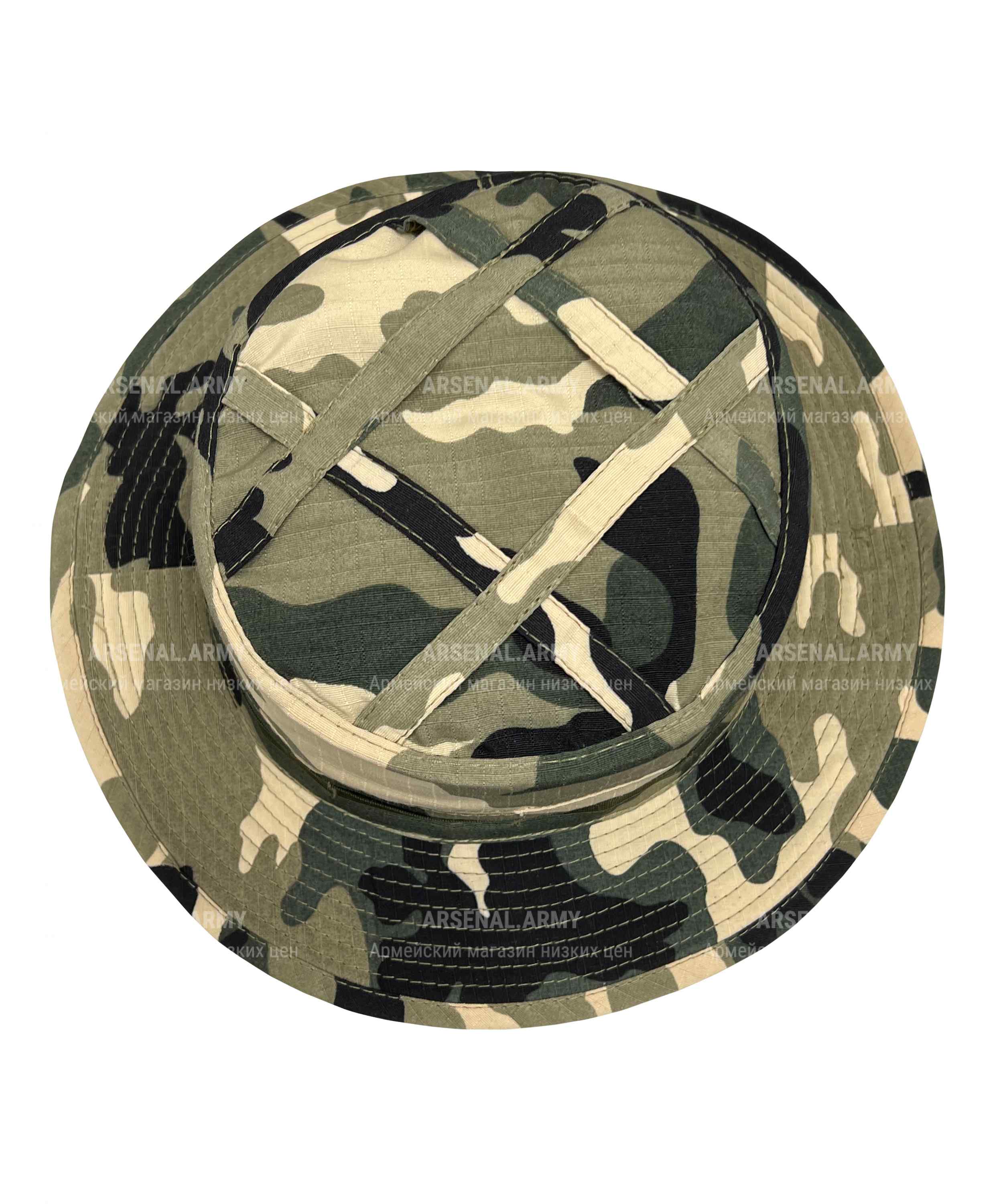 По покрою это классическая тканевая панама с достаточно широкими полями. Верхняя часть прошита перекрещивающимися тканевыми полосами для обеспечения большей жесткости. Снизу предусмотрен стяжной шнурок для фиксации панамы под подбородком.