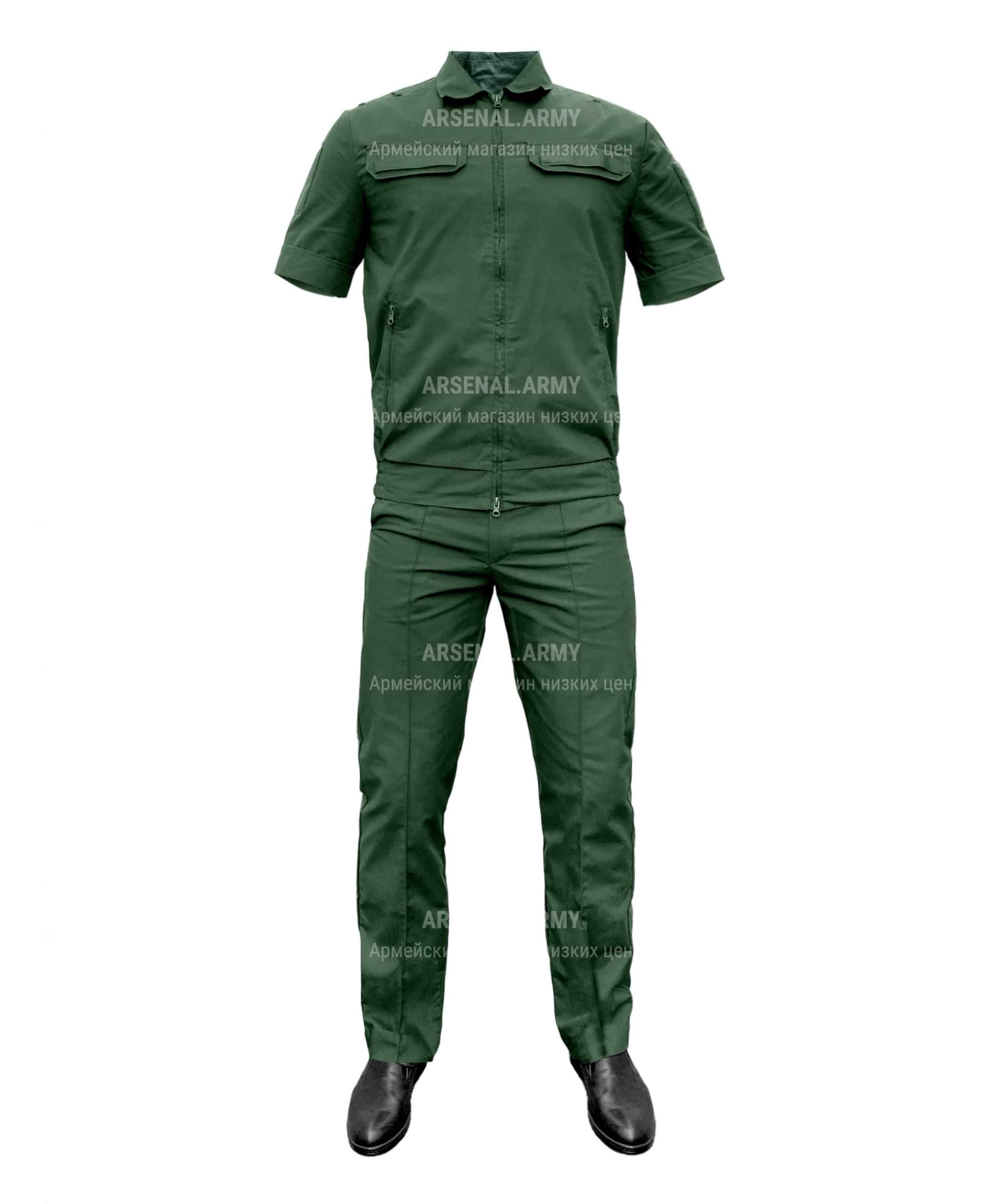 Костюм офисный с коротким рукавом выполнен в зелёном цвете, застёжка — молния. Сезон — лето, предназначен для мужчин. Костюм представляет собой практичный вариант для жарких месяцев: лёгкая и прочная ткань, комфортная посадка. Рипстоп обеспечивает дополнительную устойчивость к износу, а смешанный состав хлопка и полиэстера сохраняет форму и цвет после стирок.