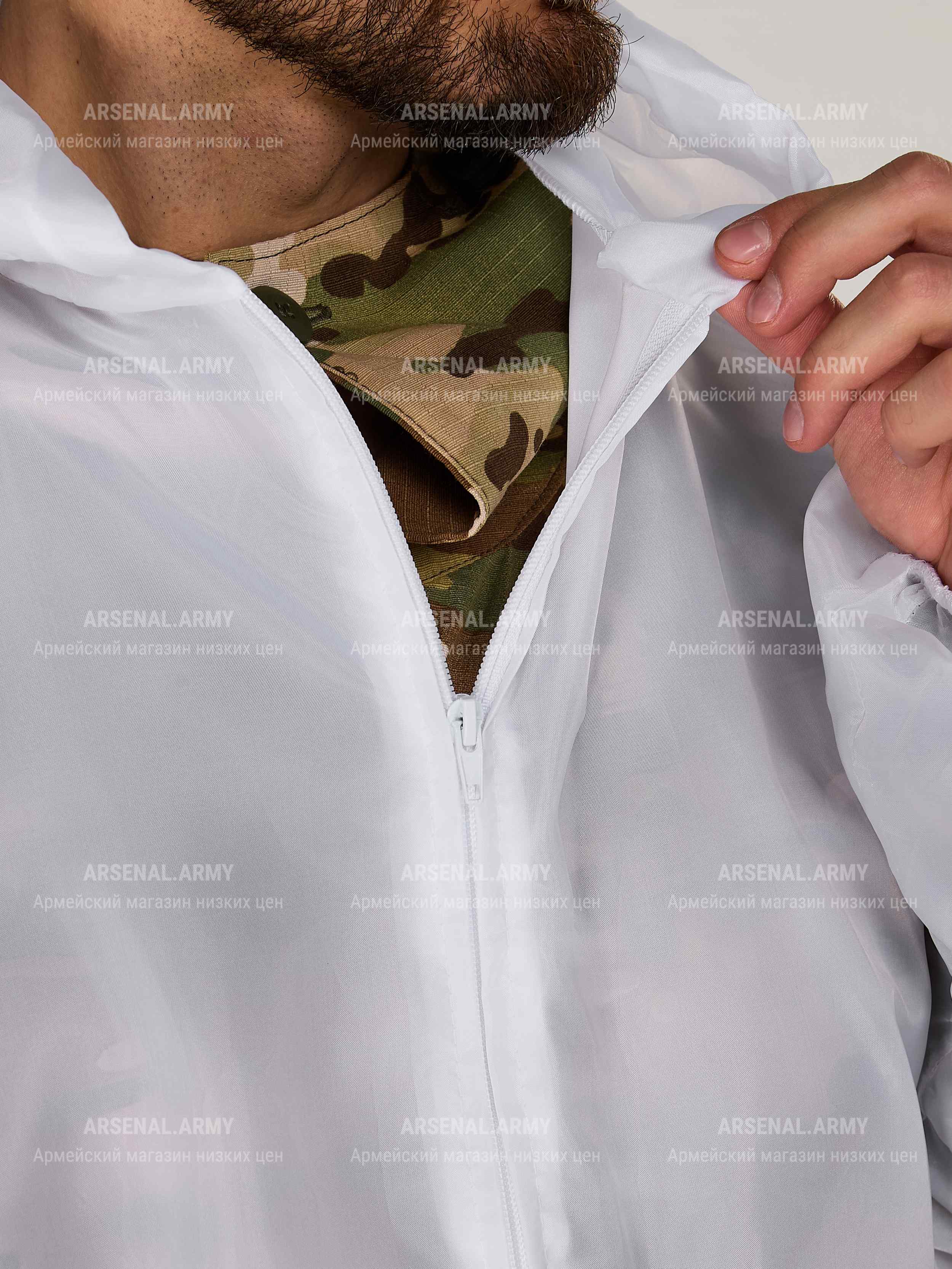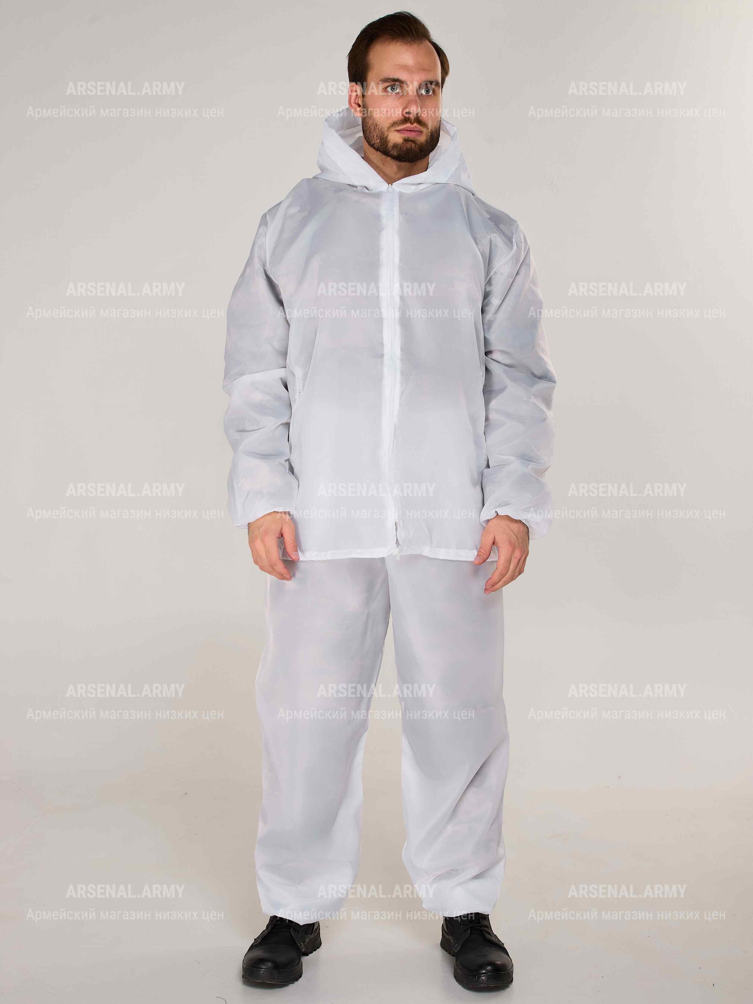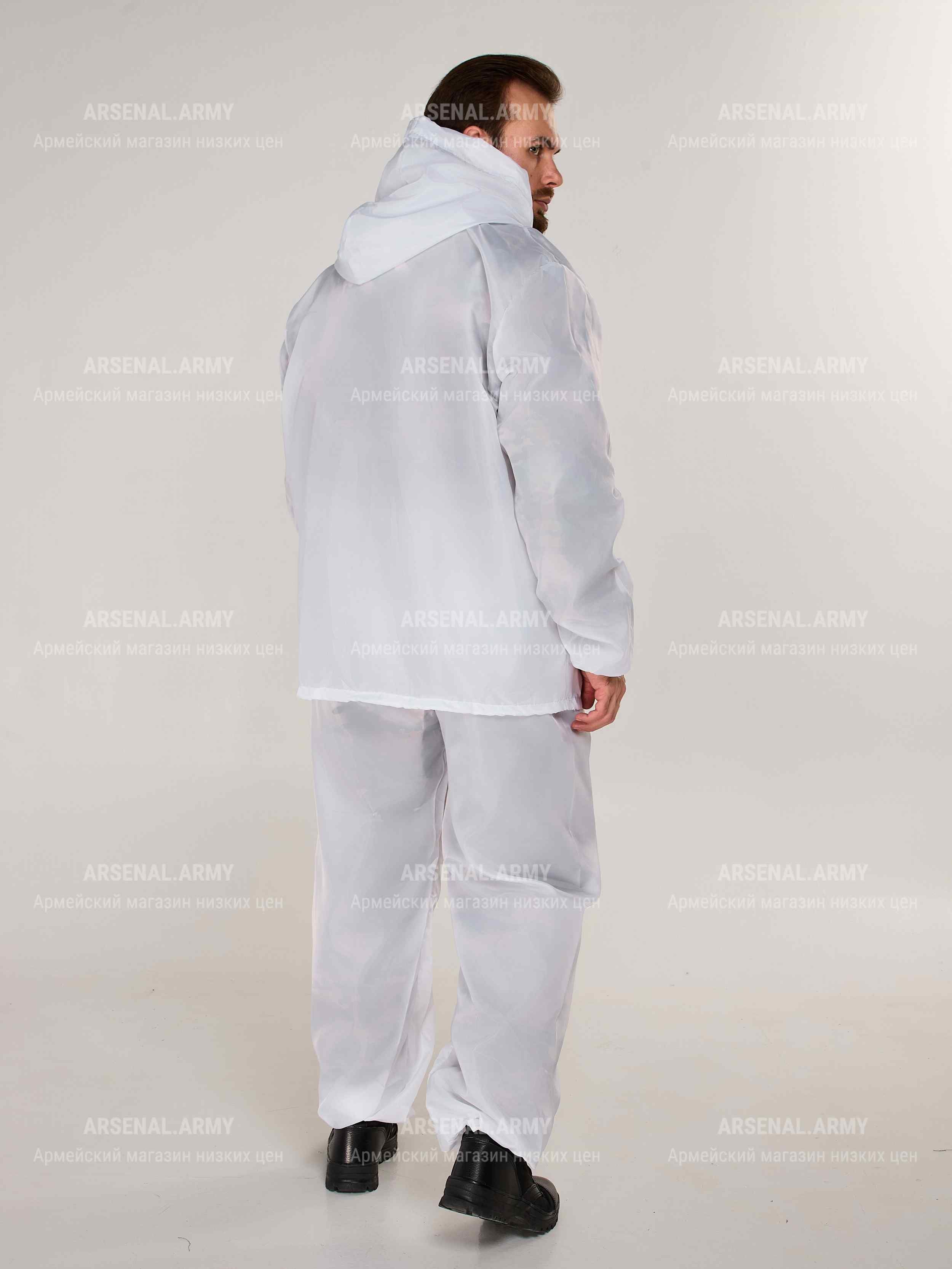 Зимний маскировочный костюм полностью белого цвета. Пошит из легкой, но прочной ткани с хорошими влагоотталкивающими свойствами (100% полиэстр).