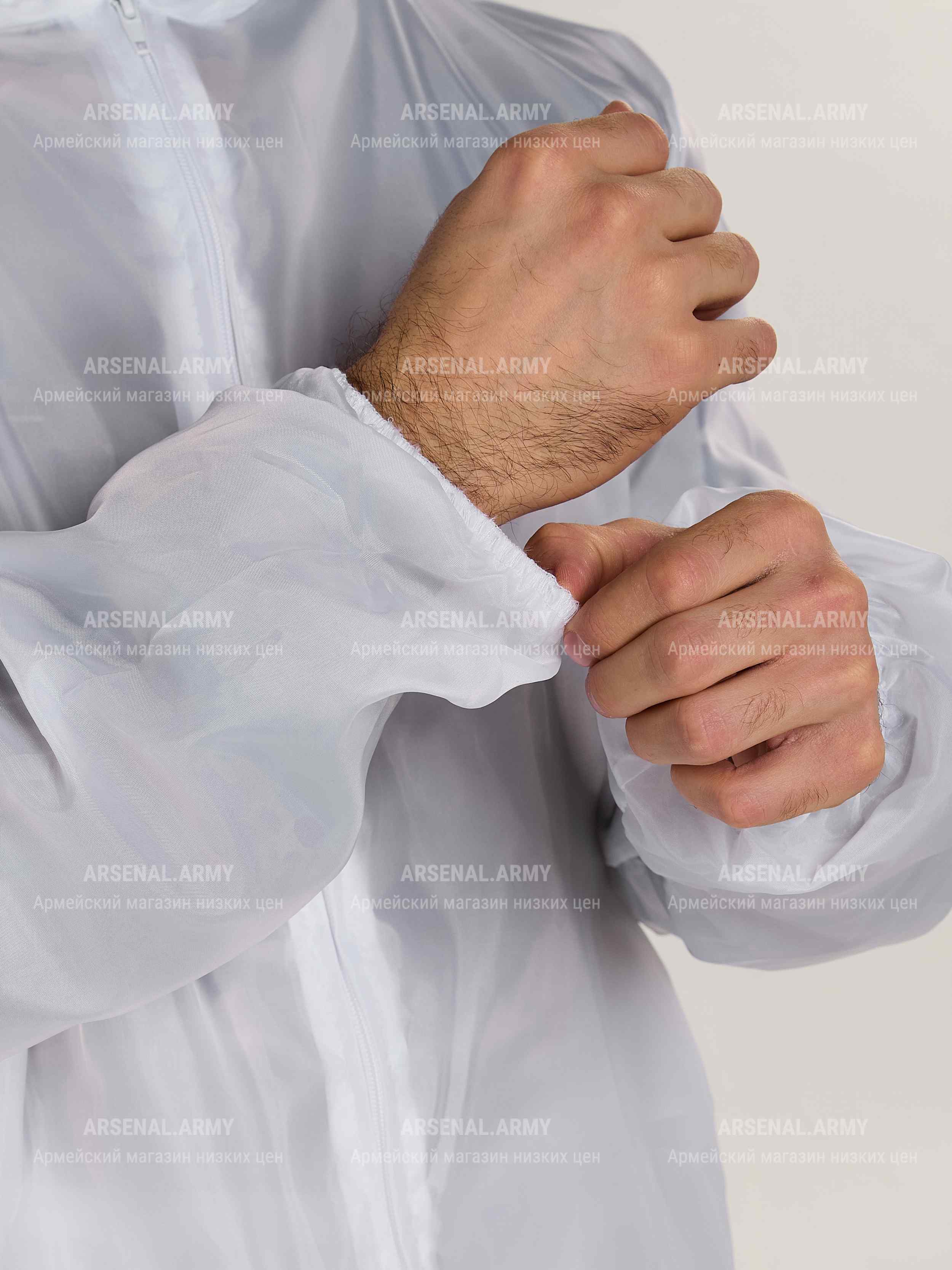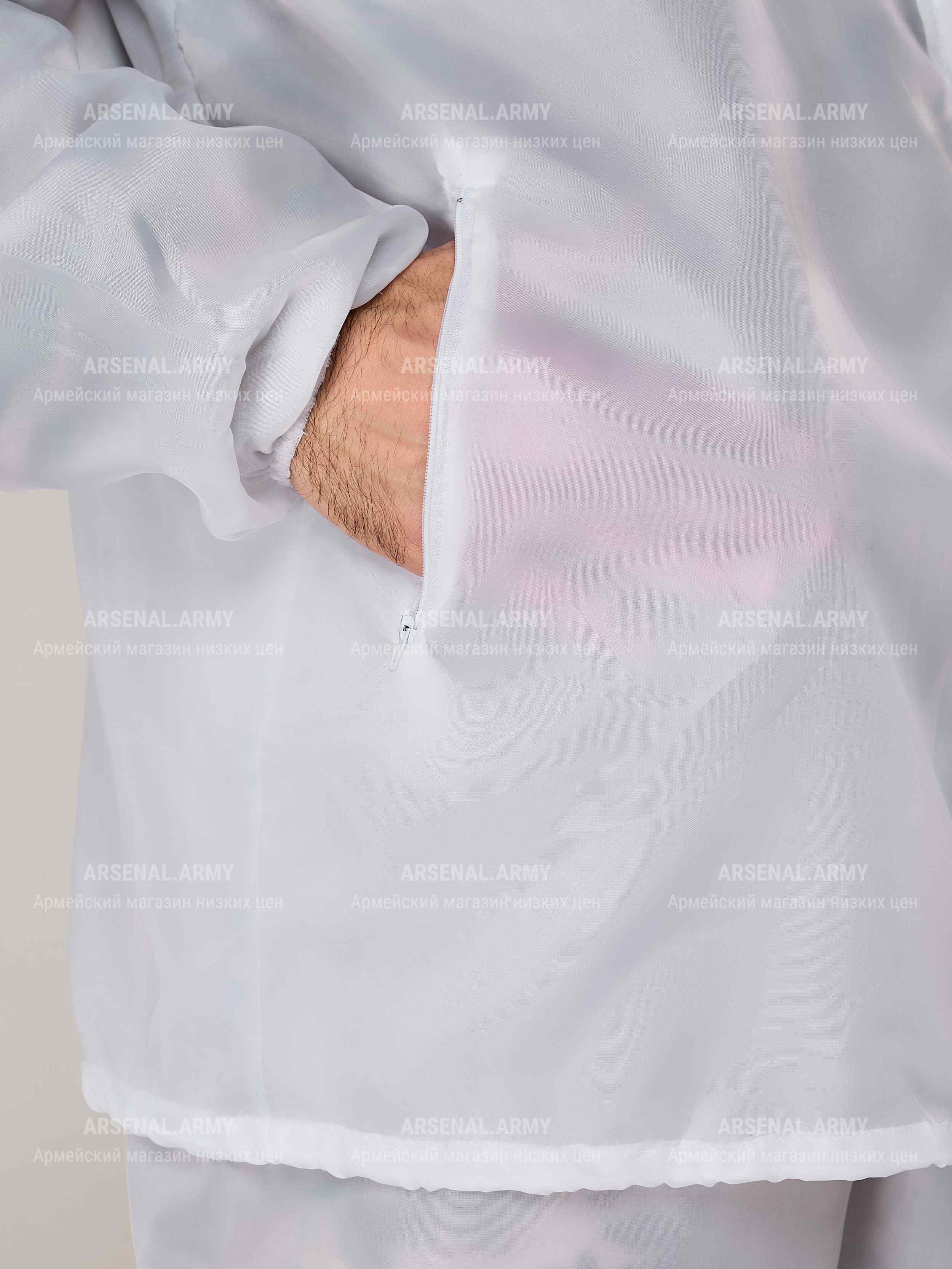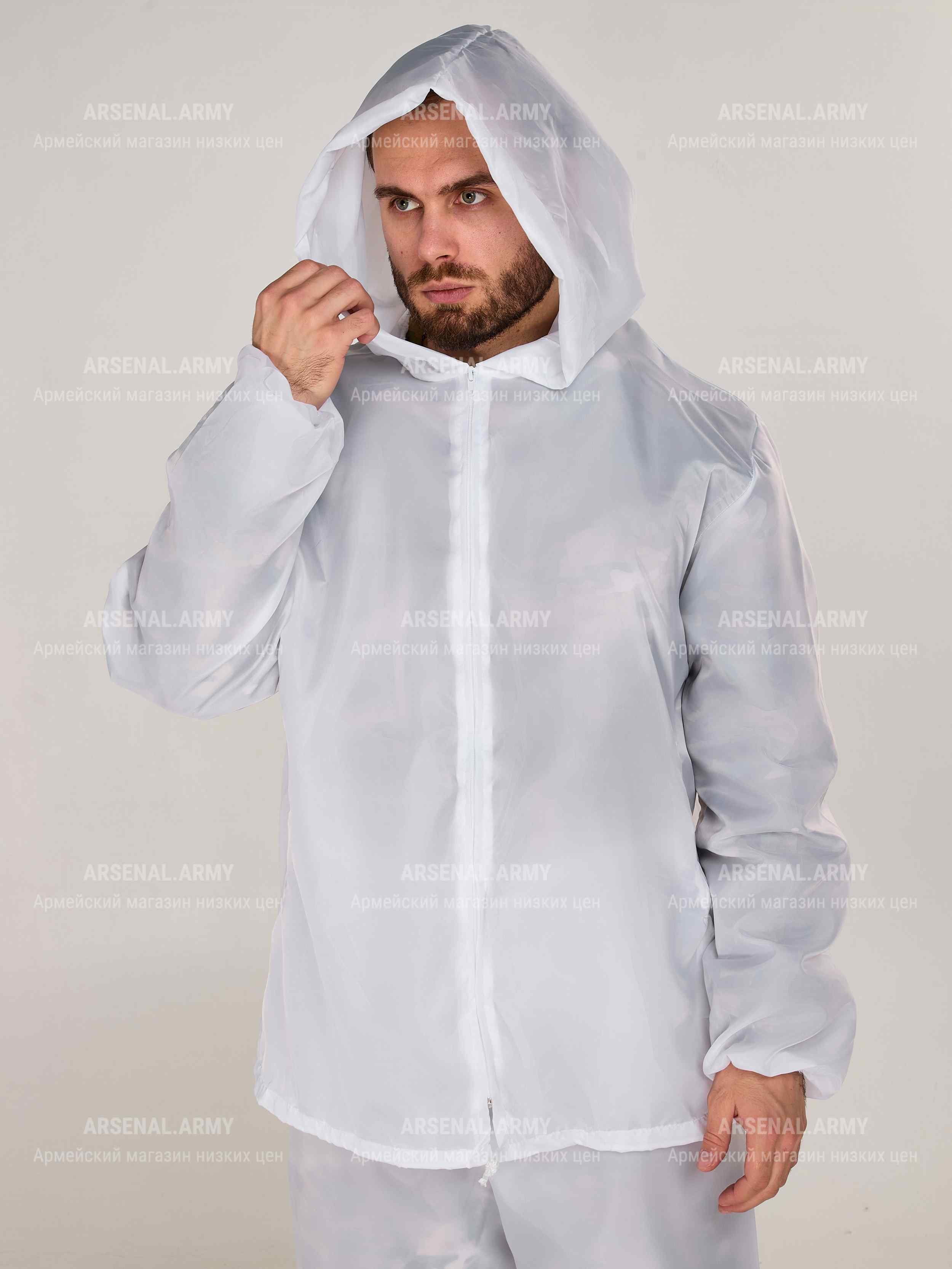 Зимний маскировочный костюм полностью белого цвета. Пошит из легкой, но прочной ткани с хорошими влагоотталкивающими свойствами (100% полиэстр).