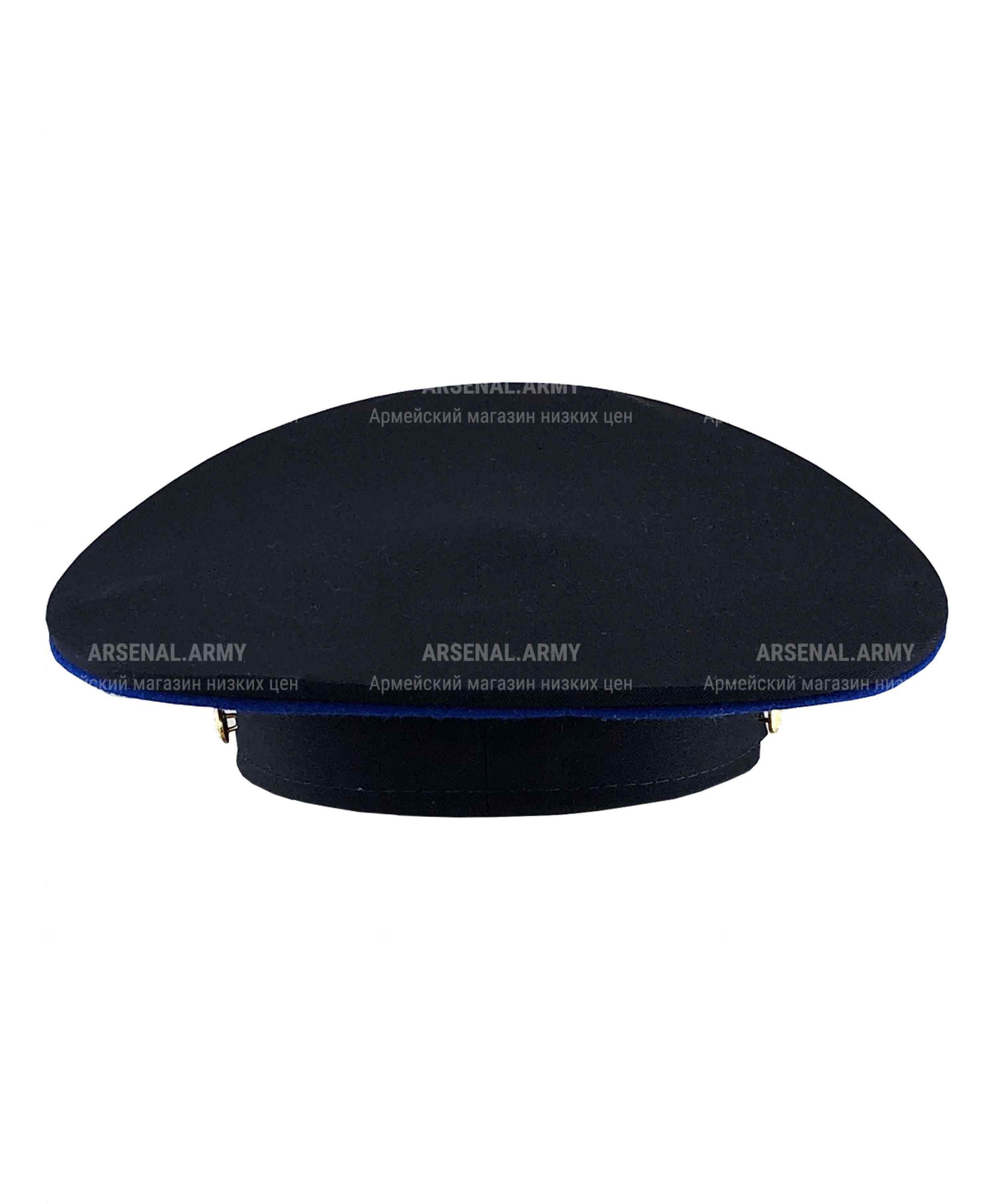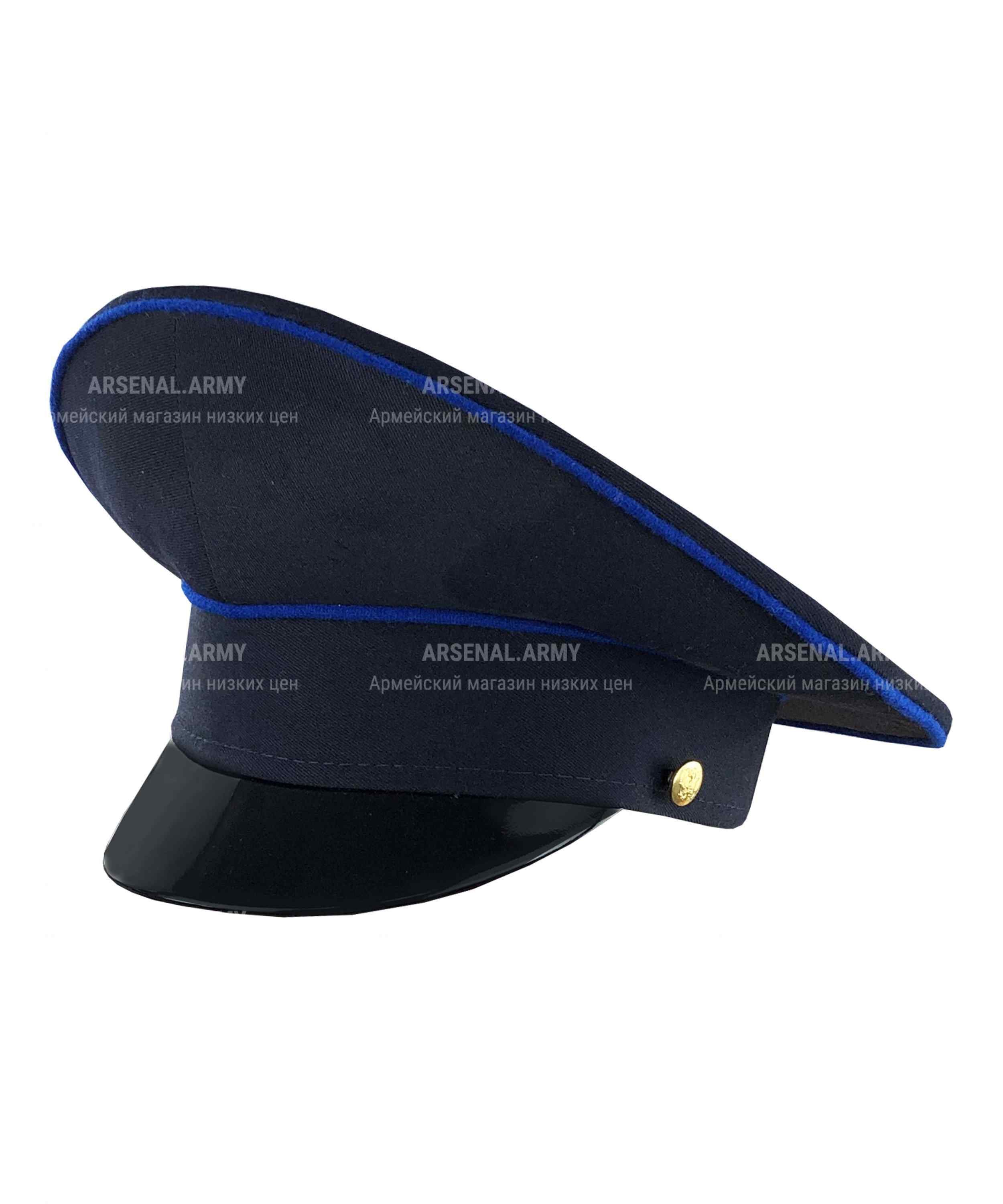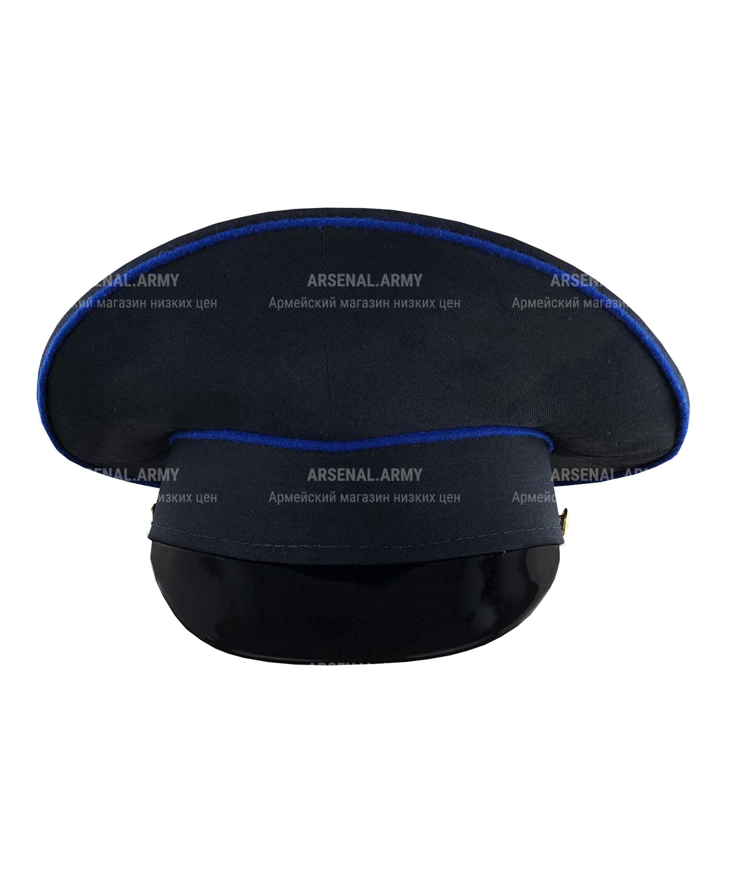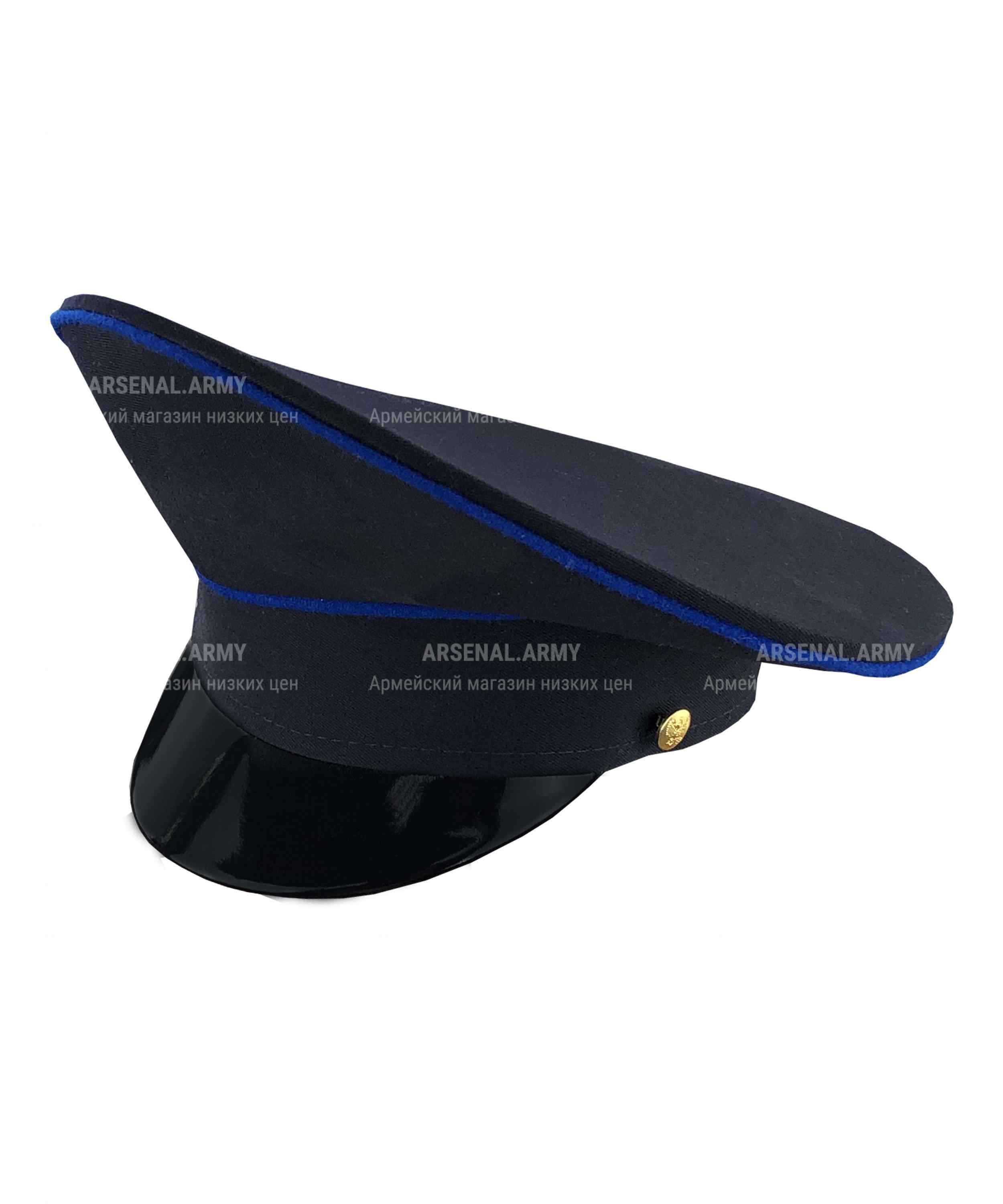 Фуражка пошита в актуальном современном дизайне с высокой наклонной тульей. Козырек жесткий, глянцевый, также отлично сохраняющий форму при любой температуре. Тулья сверху и снизу полностью окантована полосой синей полушерстяной ткани.